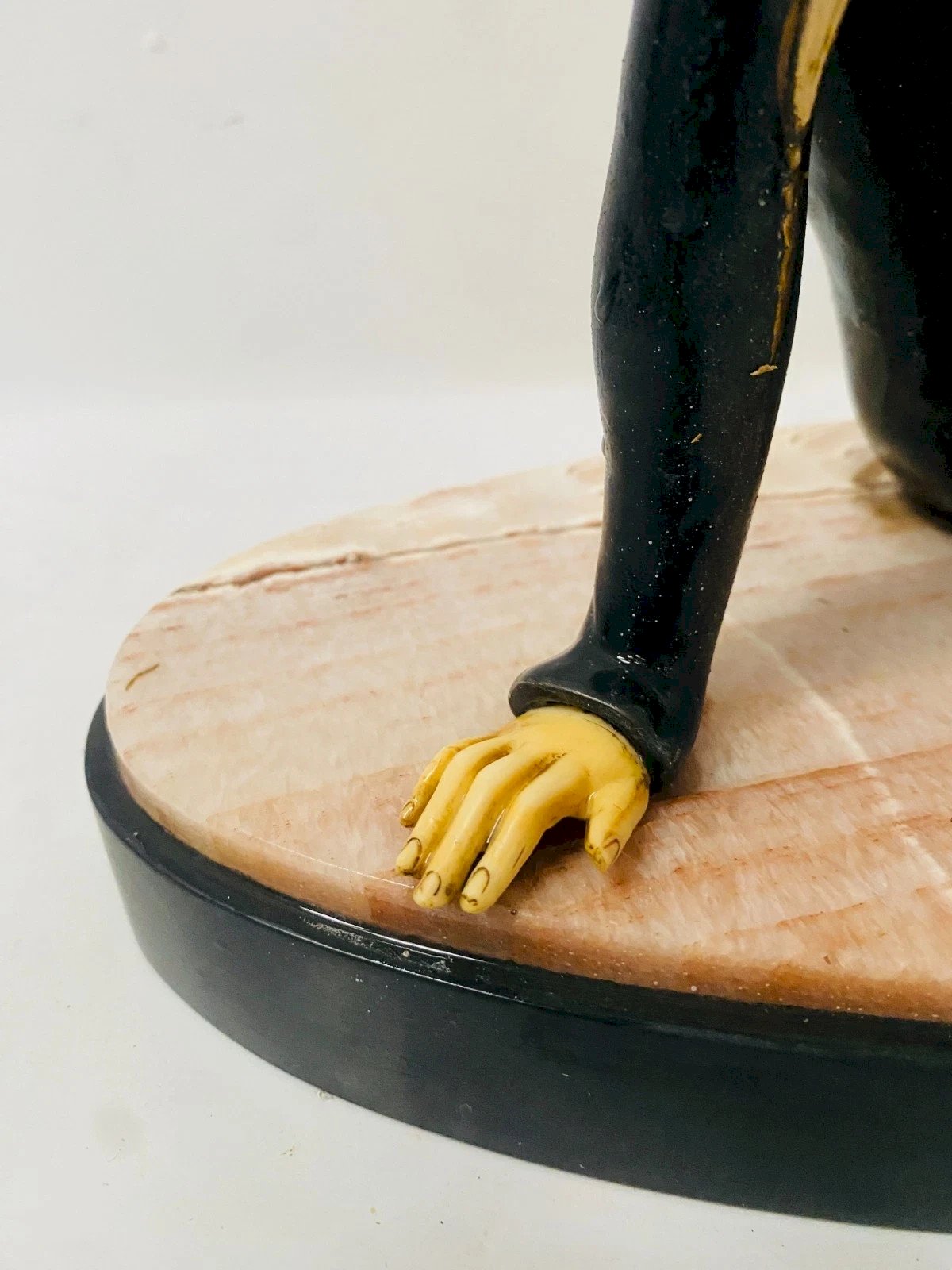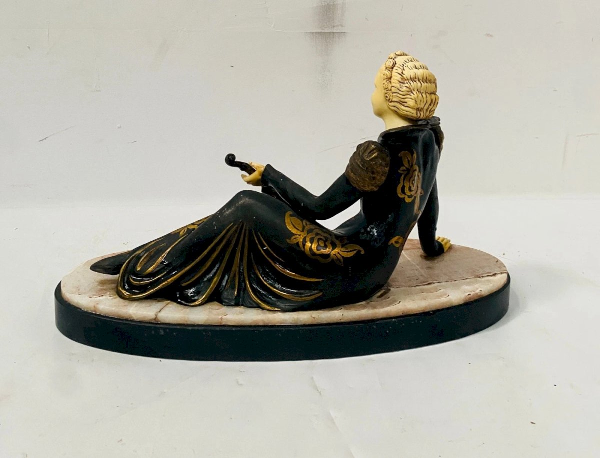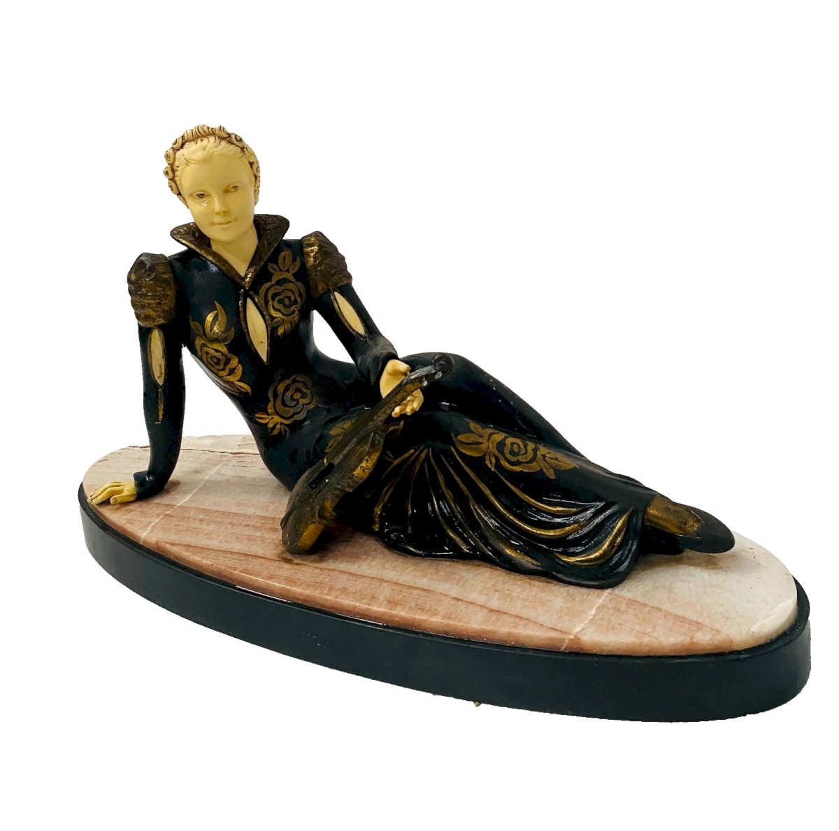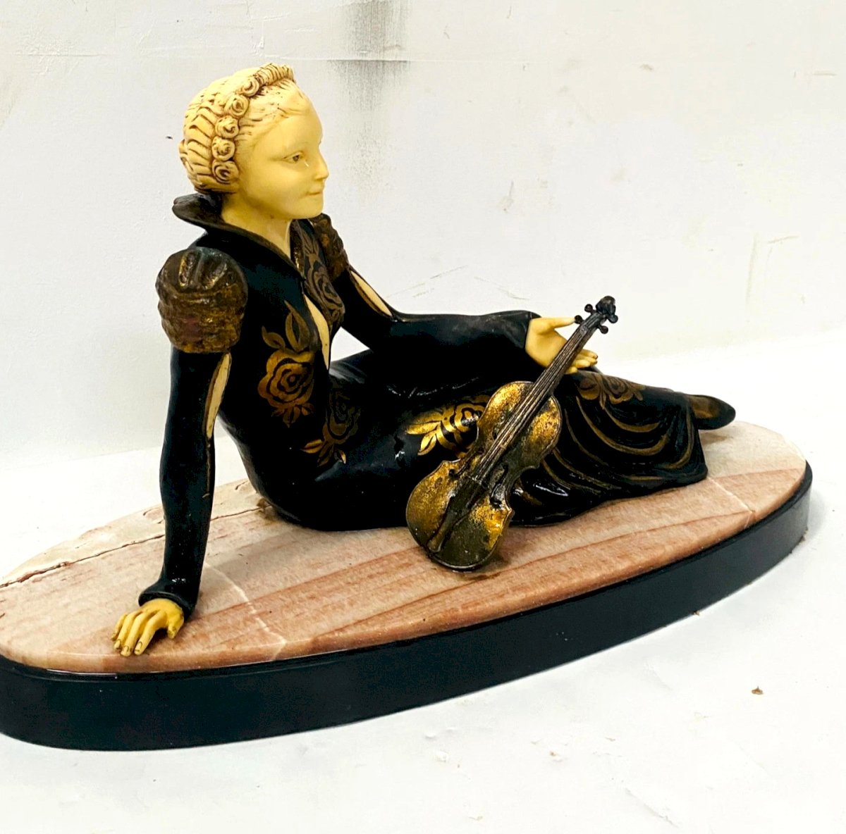 " La  Violoniste " Groupe en régule patiné Sujet féminin dans une robe a rehaut d'or  La tête et les mains sont en matière composite Etat d'usage  Dimension  H 28 x L 46 x 18 cm  Epoque Art Déco  Type:Objet de vitrine, Décoratif Origine:France Hauteur:28 Matière:regule Style:art deco Longueur:46 Largeur:18