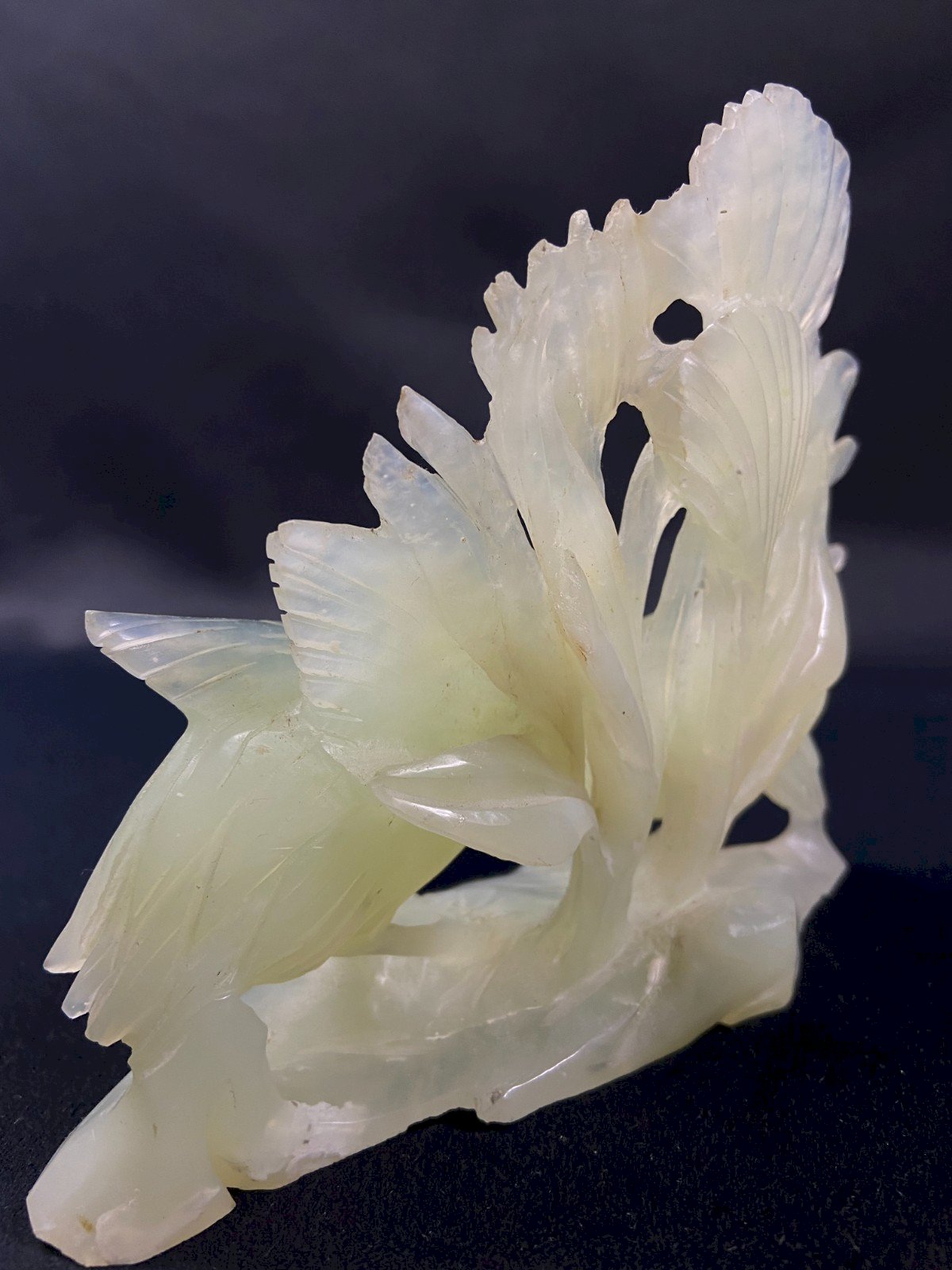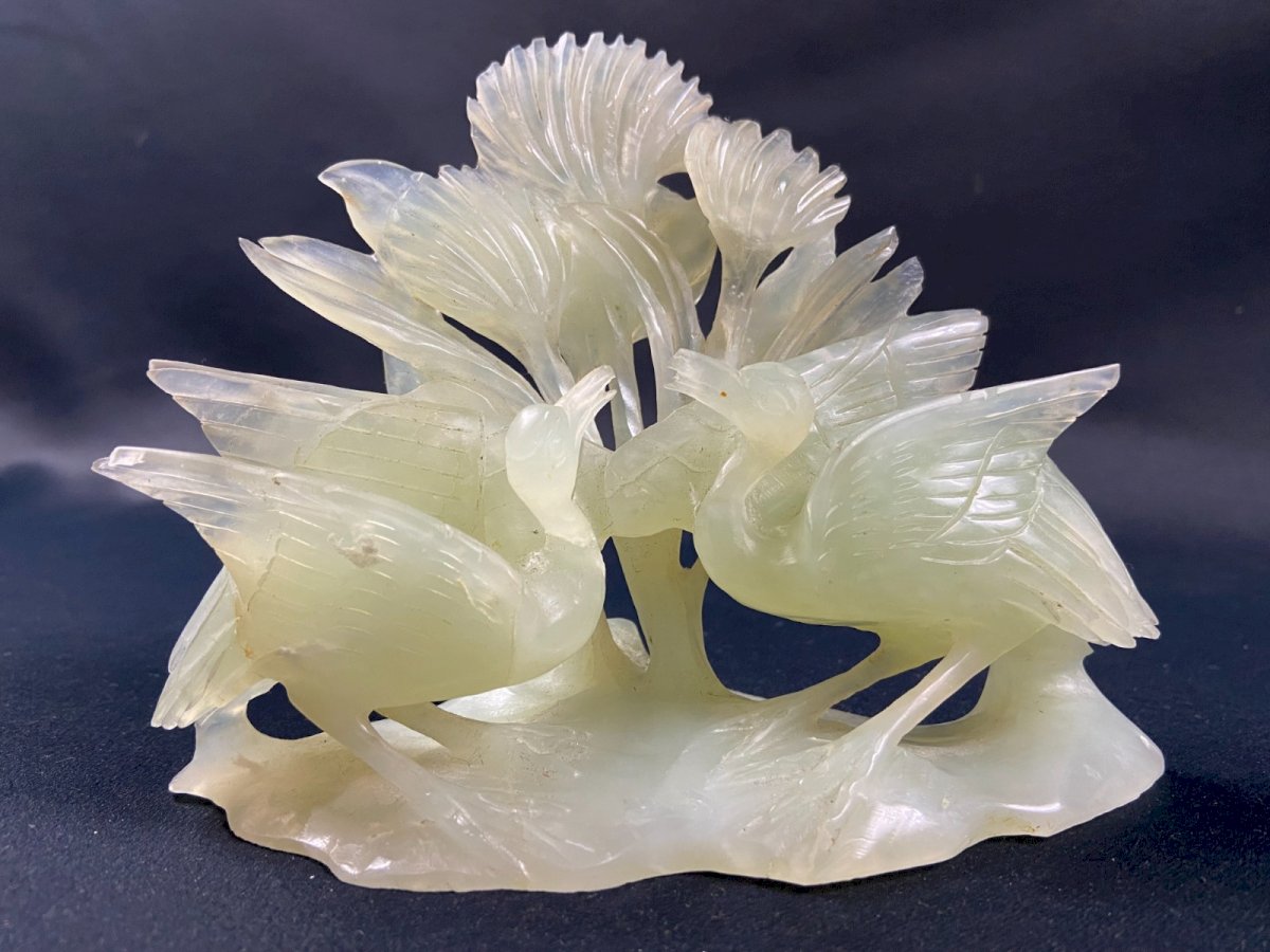 Groupe en jadéite finement sculpté au couple de grues Extrême-Orient Chine Epoque XXe Incontestable élégance Dimensions max : Envergure 16,1 x Hauteur 12,6 x 6,5 cm Poids total : 467 grammes Je signale la présence de quelques discrets éclats sur certaines arêtes fines - Envoi ultra sécurisé à destination du monde entier - Retrait des commandes possible sur rendez-vous, rue Notre-Dame à Bourges. - Possibilité de groupage au sein d'un même colis : merci de bien vouloir me contacter préalablement afin que je puisse calculer vos frais de transport optimisés. Authenticité:Original Type:Figurine, Statue Origine:Chine Période:1950-1969 Pays d'origine:Chine Matière:Pierre Style:1940-1960