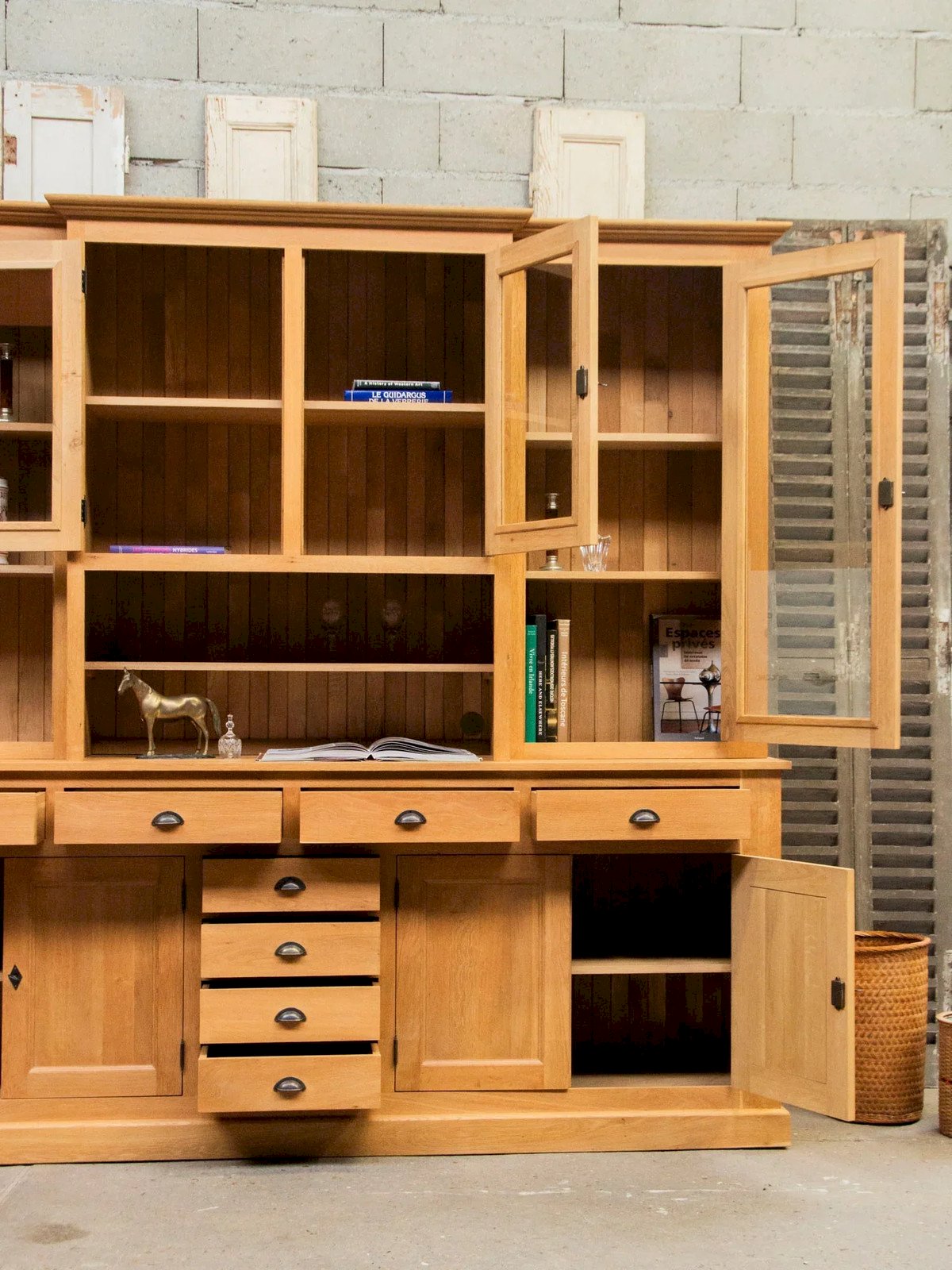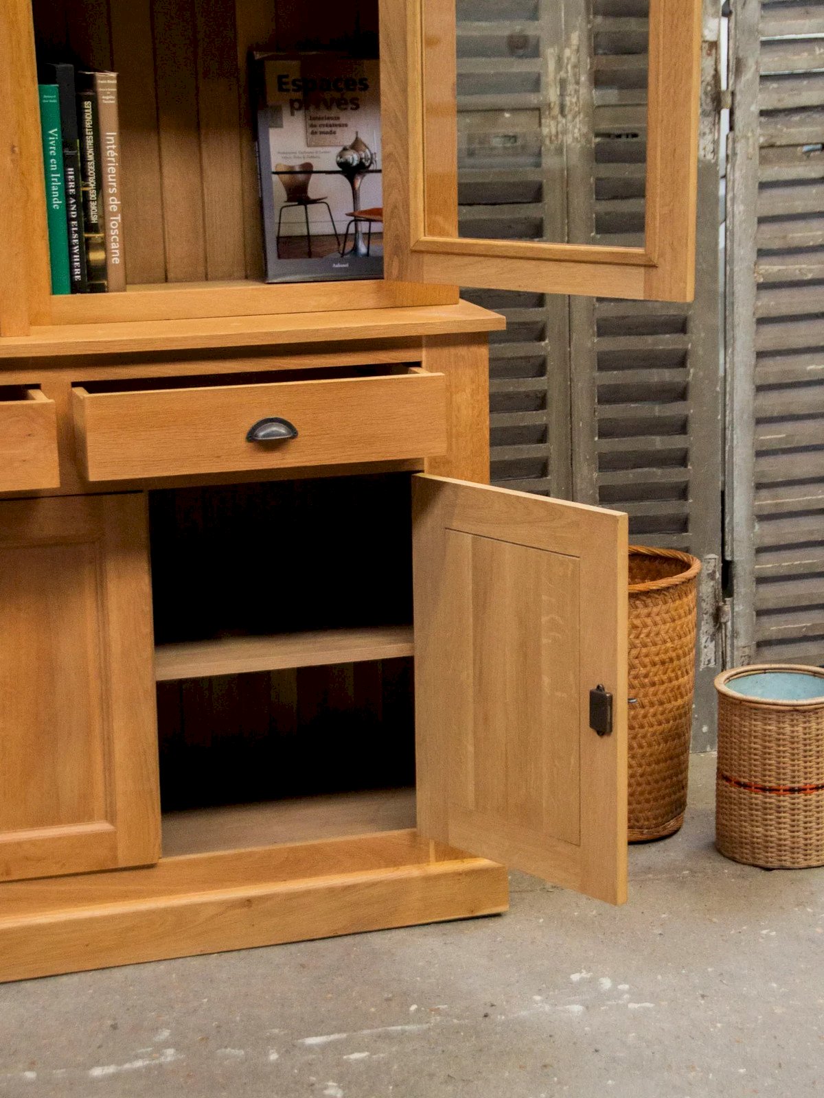 Découvrez ce très grand buffet en chêne massif clair, aux lignes généreuses et à l'allure contemporaine empreinte d'authenticité. Quatre portes vitrées, grandes et petites, dévoilent étagères de présentation tandis que huit tiroirs offrent un rangement organisé pour la vaisselle et le linge de maison. Les poignées demi-lune en métal et le plein-pied lui confèrent une élégance sobre et une belle stabilité, et un passage pour câbles le rend pratique pour installer un éclairage ou un appareil multimédia. Idéal pour animer une salle à manger ou structurer un séjour. Longueur : 240 cm Largeur : 47 cm Hauteur totale : 225 cm Hauteur du meuble bas : 47 cm Hauteur tiroir : 9 cm Hauteur de la grande niche : 45 cm / Petites : 23 / 21 cm État:Occasion: Objet ayant été utilisé. Objet présentant quelques marques d'usure superficielle, ...Occasion: Objet ayant été utilisé. Objet présentant quelques marques d'usure superficielle, entièrement opérationnel et fonctionnant correctement. Il peut s'agir d'un modèle de démonstration ou d'un objet retourné en magasin après une courte période d'utilisation. les éventuelles imperfections. Marque:Debongout Type:Produit chiné Matériau:Bois, Chêne, Verre Style:Contemporain Personnalisé:Buffets