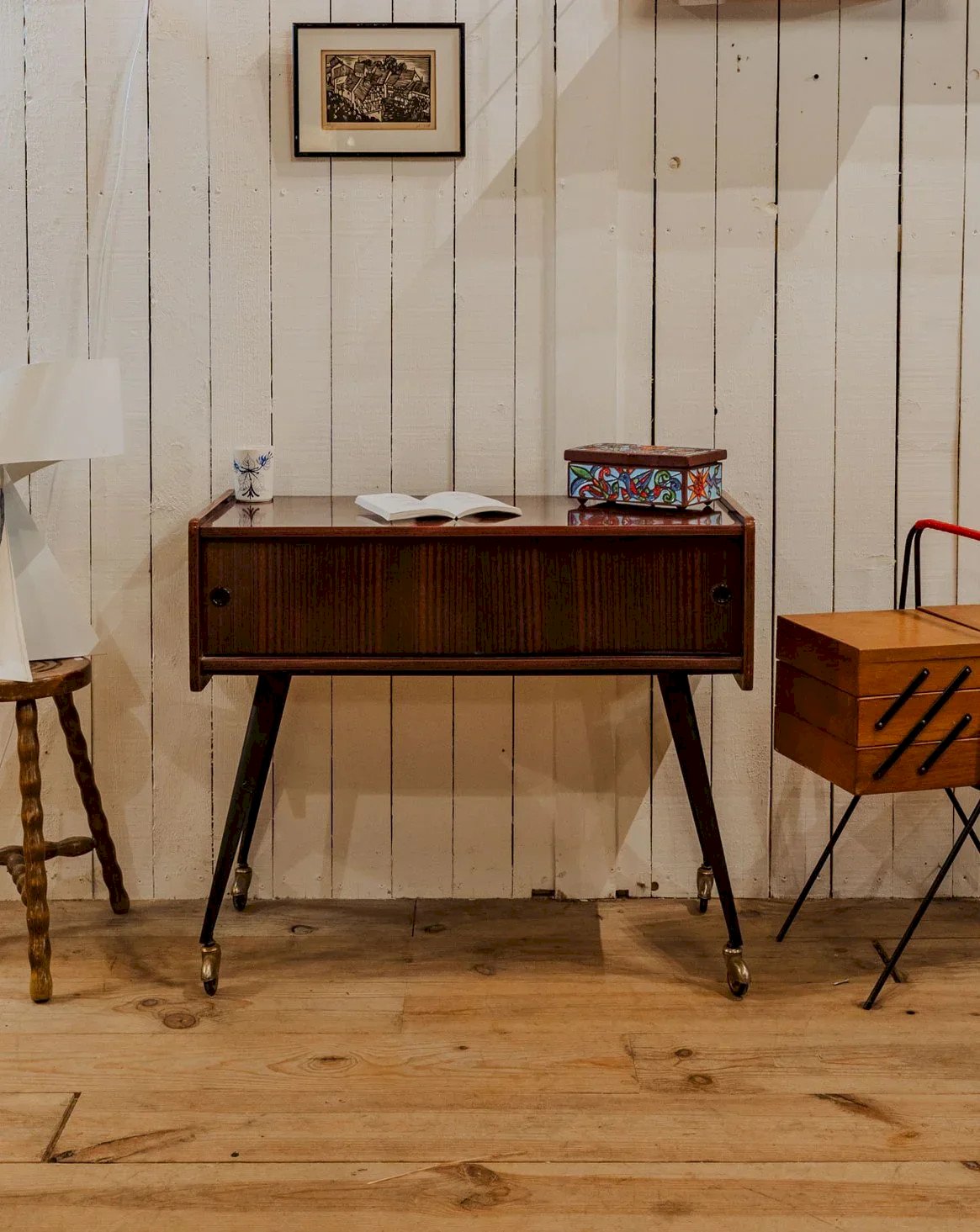 Ajoutez une touche pratique et chaleureuse à votre intérieur avec cette table d'appoint en fornica avec un placage façon bois, dont le veinage apporte une belle allure naturelle. Ses portes coulissantes offrent un rangement discret, tandis que les pieds en métal noir lui confèrent une silhouette contemporaine et stable, idéale pour un couloir ou un coin salon. Les quatre roulettes facilitent le déplacement pour un usage modulable, s'intégrant aussi bien à un intérieur industriel qu'à un décor scandinave. Les roulettes méritent d'être huilées mais sont fonctionnelles et quelques traces du temps sont présentes. Longueur : 84 cm Largeur : 38 cm Hauteur : 72 cm État:Occasion: Objet ayant été utilisé. Objet présentant quelques marques d'usure superficielle, ...Occasion: Objet ayant été utilisé. Objet présentant quelques marques d'usure superficielle, entièrement opérationnel et fonctionnant correctement. Il peut s'agir d'un modèle de démonstration ou d'un objet retourné en magasin après une courte période d'utilisation. les éventuelles imperfections. Marque:Debongout Type:Produit chiné Matériau:Formica, Métal Style:Contemporain Personnalisé:Tables d'appoint