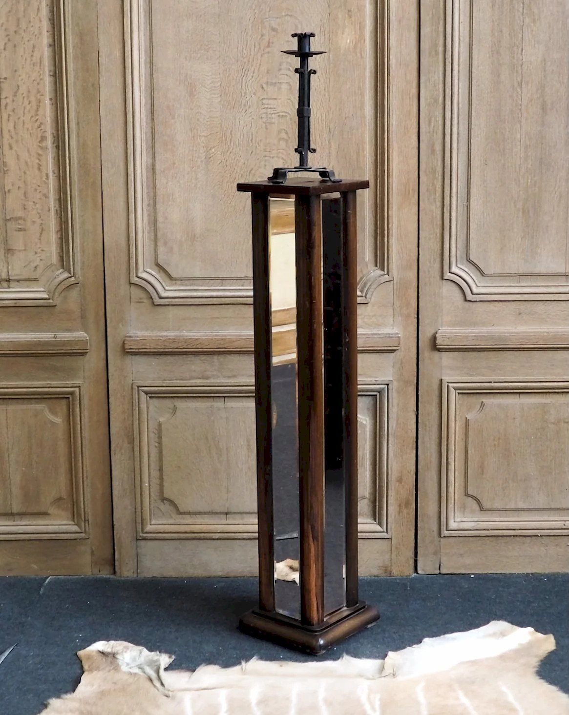 Sublimez cette colonne guéridon en chêne teinté, ponctuée de quatre miroirs biseautés au reflet rosé qui captent la lumière et adoucissent l'espace. Sa silhouette élancée et sa base carrée offrent un support stable et raffiné pour une plante graphique, une lampe d'appoint ou vos objets préférés, tandis que le grain du chêne affirme un style chaleureux et sobre. Parfaite pour habiller un coin salon ou une entrée, elle installe une atmosphère intime et raffinée. Longueur de la base : 26 cm Largeur de la base : 26 cm Hauteur : 113 cm État:Occasion: Objet ayant été utilisé. Objet présentant quelques marques d'usure superficielle, ...Occasion: Objet ayant été utilisé. Objet présentant quelques marques d'usure superficielle, entièrement opérationnel et fonctionnant correctement. Il peut s'agir d'un modèle de démonstration ou d'un objet retourné en magasin après une courte période d'utilisation. les éventuelles imperfections. Marque:Debongout Type:Produit chiné Matériau:Chêne, Bois, Verre Style:Contemporain Personnalisé:Tables d'appoint