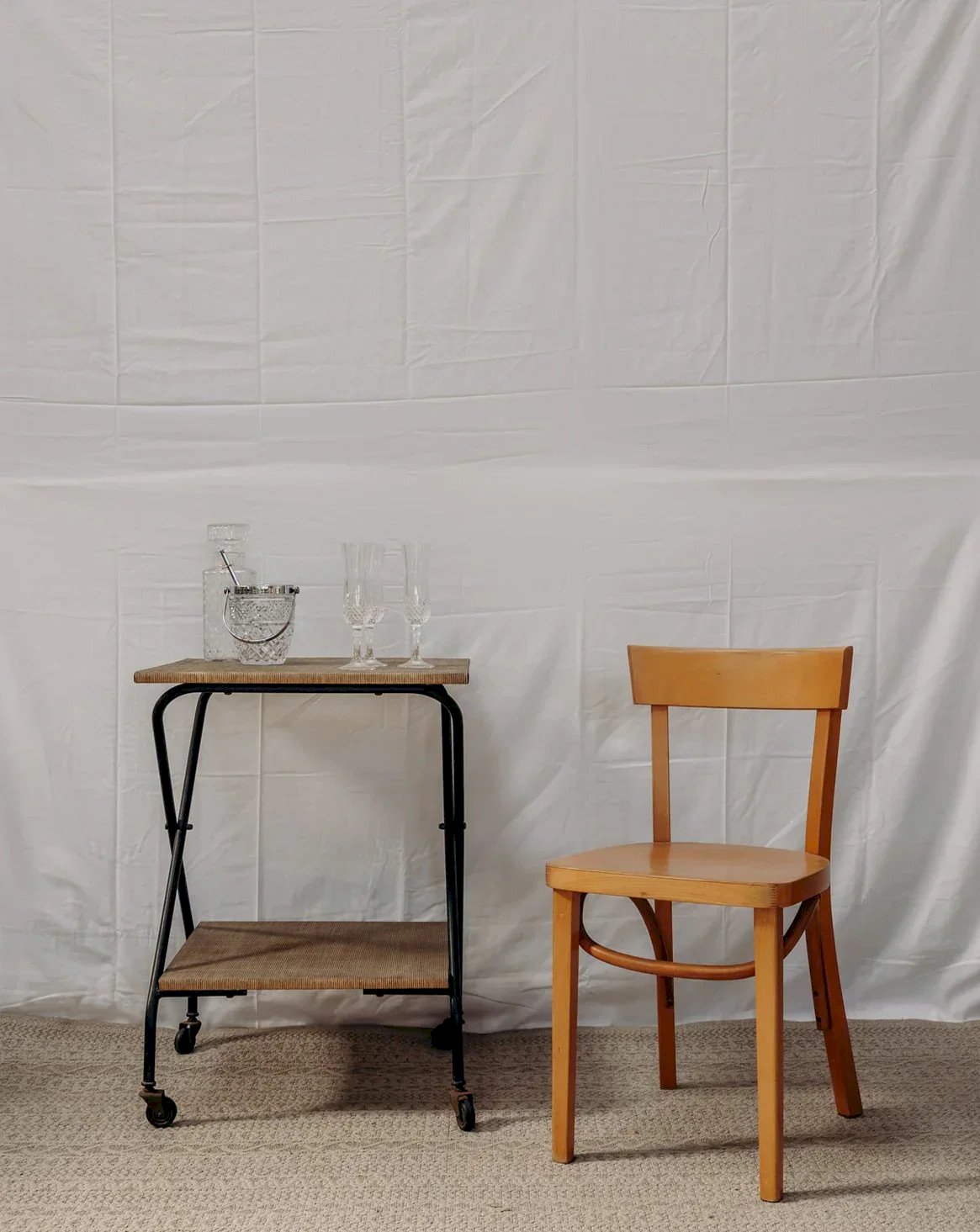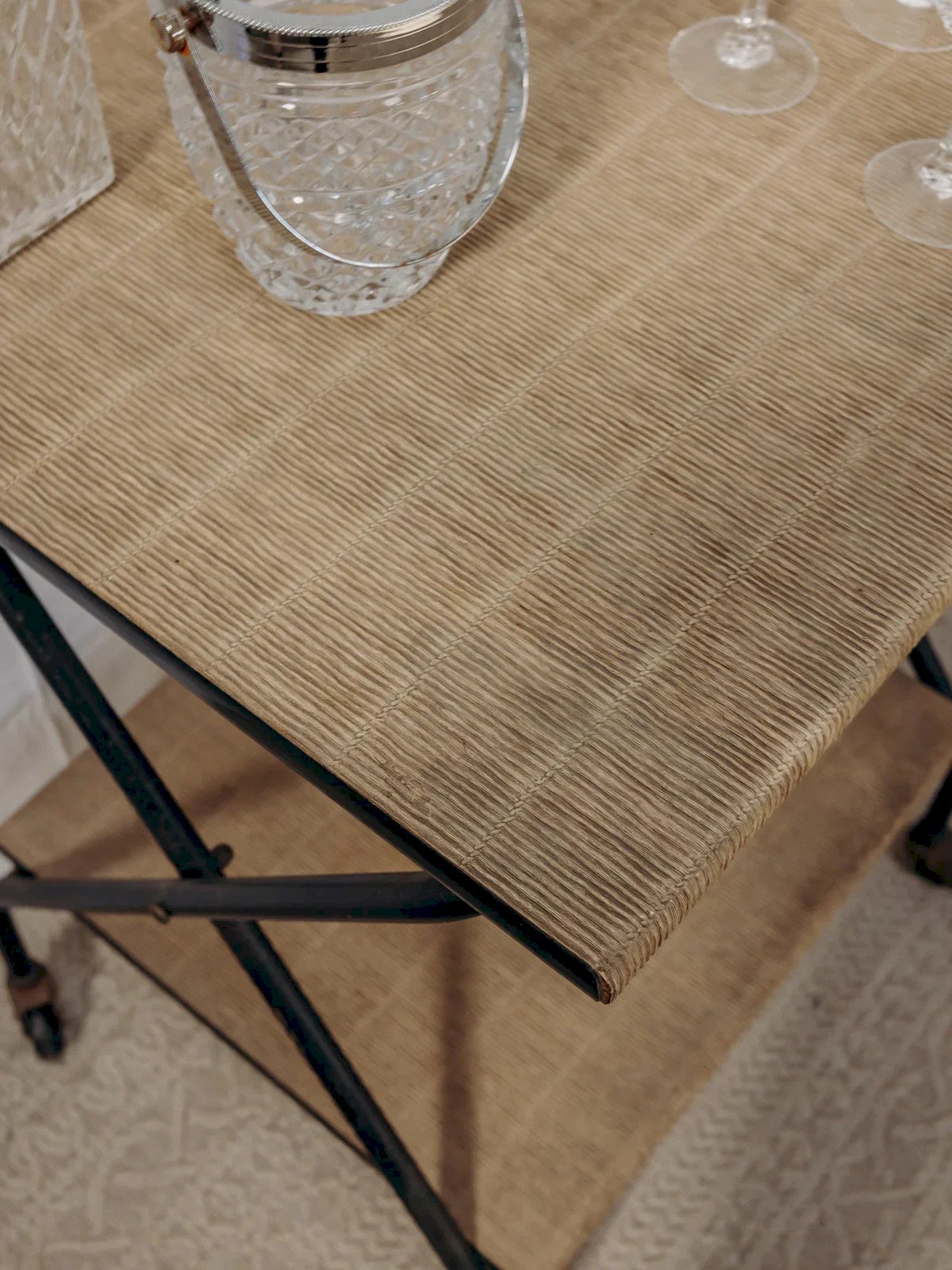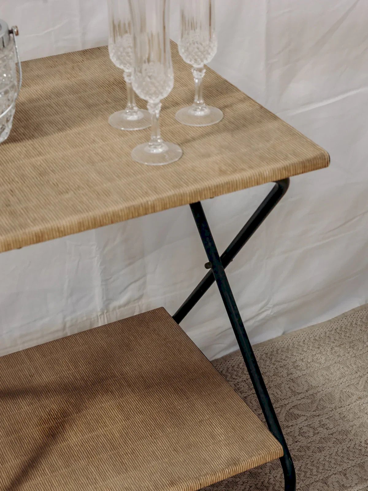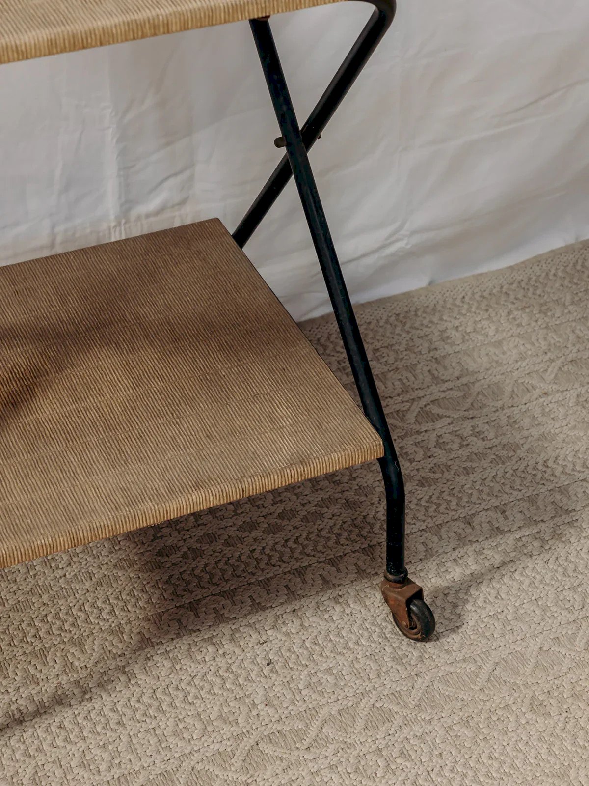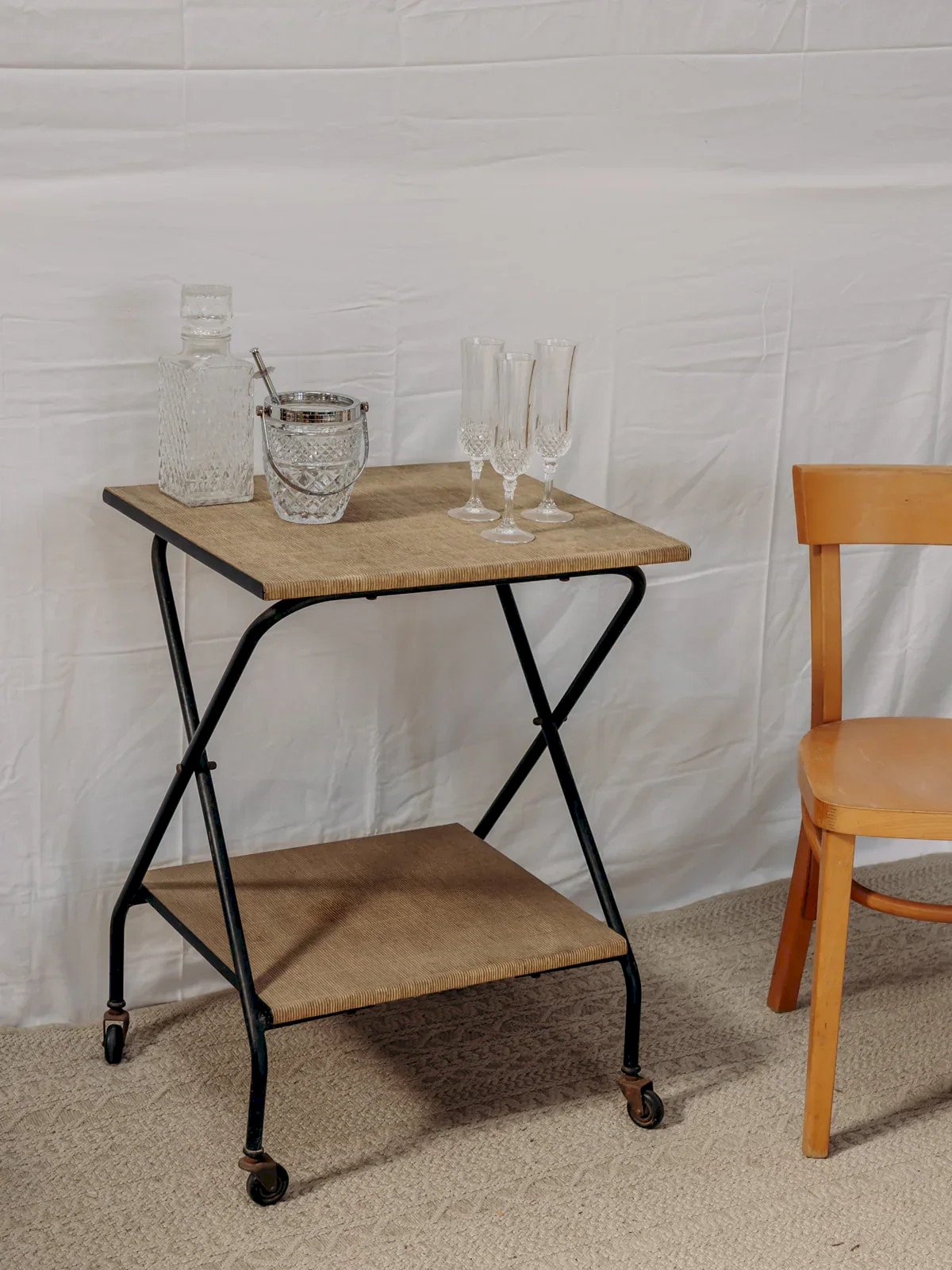 Découvrez cette charmante desserte en métal sur roulettes, emblématique des années 50-60. Avec ses deux plateaux recouverts d'une toile vintage, elle apportera une touche rétro à votre intérieur. Sa patine rouillée lui confère un caractère unique, tandis que le bruit de ses roulettes témoigne de son authenticité. Parfaite pour servir vos apéritifs ou comme meuble d’appoint, cette desserte saura séduire les amateurs de décoration au style éclectique. Longueur : 43 cm Largeur : 47 cm Hauteur : 74 cm Hauteur de la niche : 48 cm Petite histoire de la desserte La desserte, aussi appelée table servante, voit le jour au XVIIème siècle. À l’époque, elle est utilisée pour servir et desservir les plats et la vaisselle aux cours des repas. Munie de roulettes, elle se transfère d’un endroit à l’autre sans effort et permet de débarrasser la table plus rapidement en réduisant le nombre de trajets entre la salle à manger et la cuisine. C’est par sa grande utilité que la desserte est devenue un élément important du mobilier, servant aussi à servir le thé ou le petit-déjeuner. Cette petite table d’appoint mobile a su trouver au fil des siècles une place de choix dans notre intérieur. État:Occasion: Objet ayant été utilisé. Objet présentant quelques marques d'usure superficielle, ...Occasion: Objet ayant été utilisé. Objet présentant quelques marques d'usure superficielle, entièrement opérationnel et fonctionnant correctement. Il peut s'agir d'un modèle de démonstration ou d'un objet retourné en magasin après une courte période d'utilisation. les éventuelles imperfections. Marque:Debongout Type:Produit chiné Matériau:Toile, Métal Style:Campagne Personnalisé:Dessertes