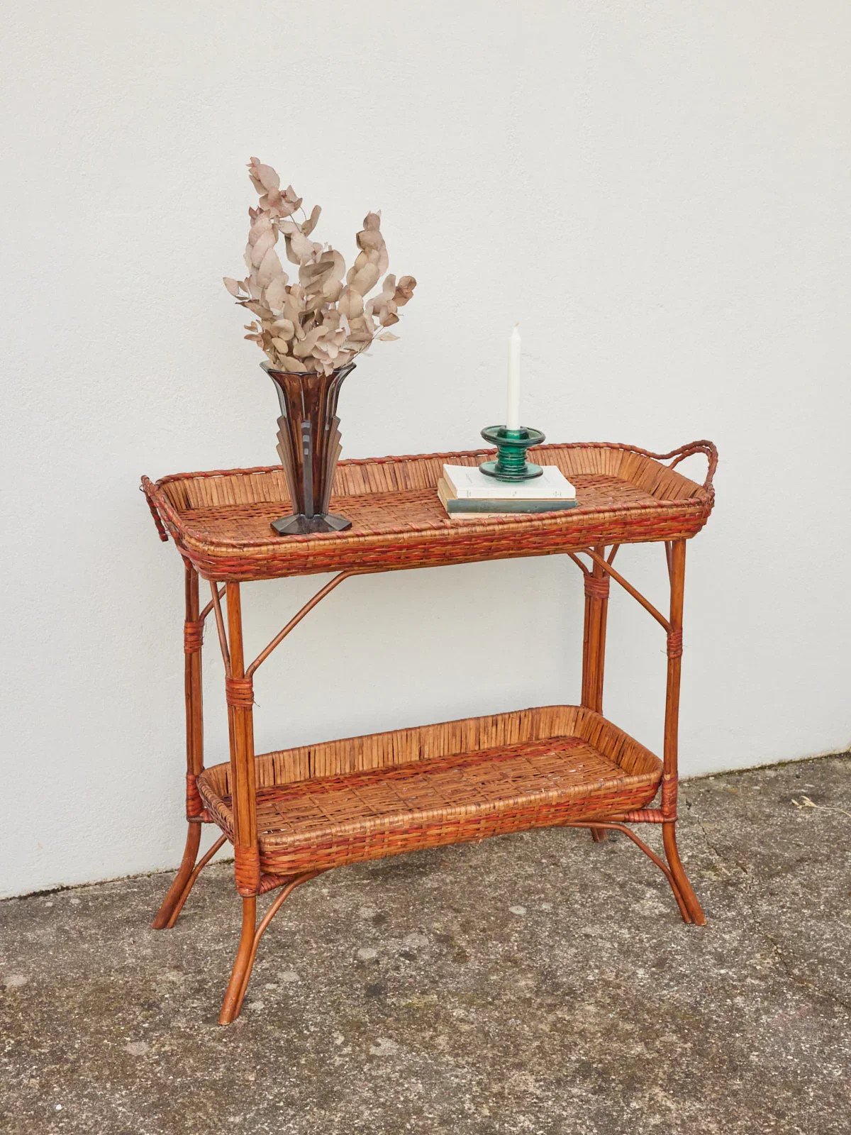 Invitez cette desserte en rotin des Philippines, aux lignes légères et artisanales, qui apporte une élégance naturelle à vos intérieurs. Ses deux paniers superposés offrent un rangement pratique et une capacité adaptée aux usages quotidiens, tandis que les deux poignées facilitent les déplacements d'une pièce à l'autre. Les détails de rotin teinté en rouge apportent une note colorée et authentique, parfaite pour une cuisine, un salon ou une terrasse abritée. Longueur : 79 cm Largeur : 38 cm Hauteur : 90 cm Petite histoire de la desserte La desserte, aussi appelée table servante, voit le jour au XVIIème siècle. À l’époque, elle est utilisée pour servir et desservir les plats et la vaisselle aux cours des repas. Munie de roulettes, elle se transfère d’un endroit à l’autre sans effort et permet de débarrasser la table plus rapidement en réduisant le nombre de trajets entre la salle à manger et la cuisine. C’est par sa grande utilité que la desserte est devenue un élément important du mobilier, servant aussi à servir le thé ou le petit-déjeuner. Cette petite table d’appoint mobile a su trouver au fil des siècles une place de choix dans notre intérieur. État:Occasion: Objet ayant été utilisé. Objet présentant quelques marques d'usure superficielle, ...Occasion: Objet ayant été utilisé. Objet présentant quelques marques d'usure superficielle, entièrement opérationnel et fonctionnant correctement. Il peut s'agir d'un modèle de démonstration ou d'un objet retourné en magasin après une courte période d'utilisation. les éventuelles imperfections. Marque:Debongout Type:Produit chiné Matériau:Rotin Style:Campagne Personnalisé:Dessertes