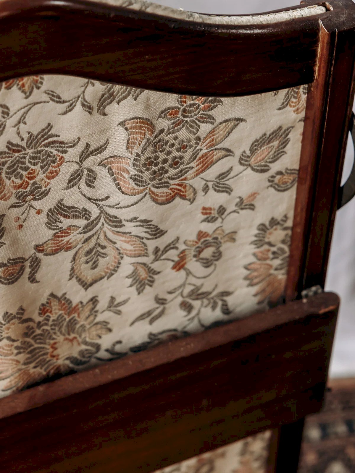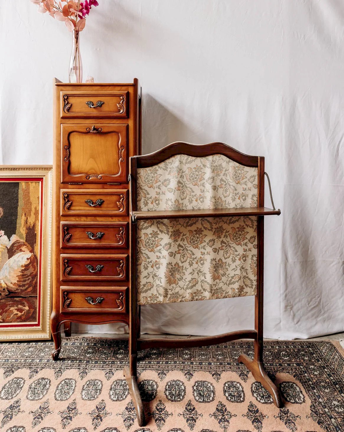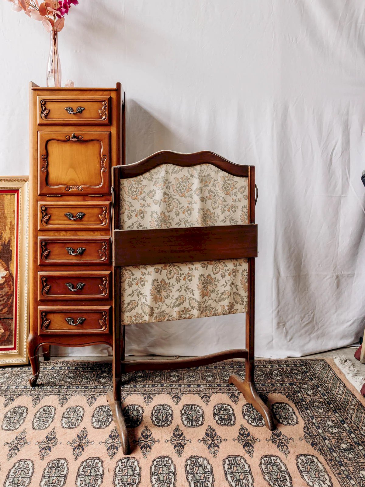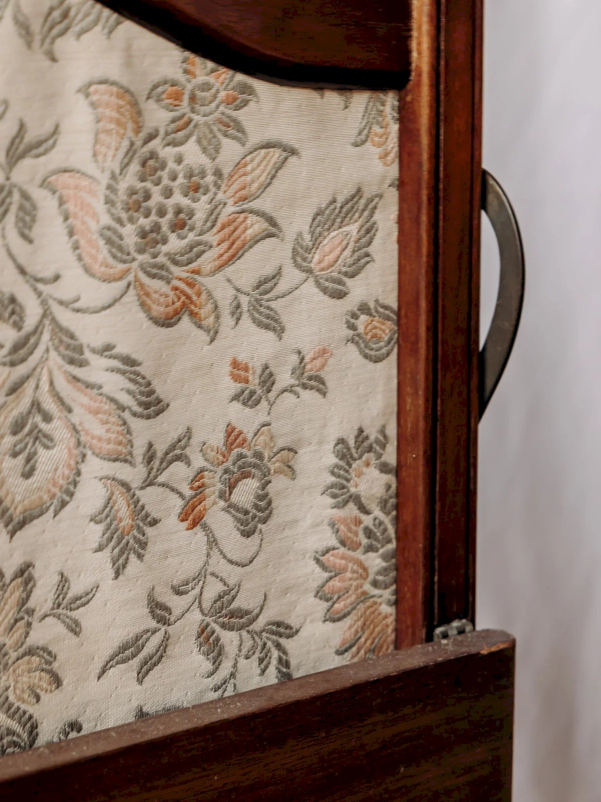 Sublimez votre cheminée avec ce pare-feu en bois foncé, au galbe sobre et au panneau habillé d'un tissu fleuri qui apporte une touche rétro et chaleureuse. Ses pieds écartés assurent une assise stable devant le foyer, tandis que la petite tablette repliable et ses crochets intégrés offrent un espace pratique pour poser une tasse, accrocher un ustensile ou suspendre un accessoire. Idéal pour créer une atmosphère accueillante dans un salon ou une véranda, il allie fonctionnalité et élégance traditionnelle. Longueur : 50 cm Largeur : 35 cm Hauteur : 90 cm État:Occasion: Objet ayant été utilisé. Objet présentant quelques marques d'usure superficielle, ...Occasion: Objet ayant été utilisé. Objet présentant quelques marques d'usure superficielle, entièrement opérationnel et fonctionnant correctement. Il peut s'agir d'un modèle de démonstration ou d'un objet retourné en magasin après une courte période d'utilisation. les éventuelles imperfections. Marque:Debongout Type:Produit chiné Matériau:Bois, Tissu Style:Campagne