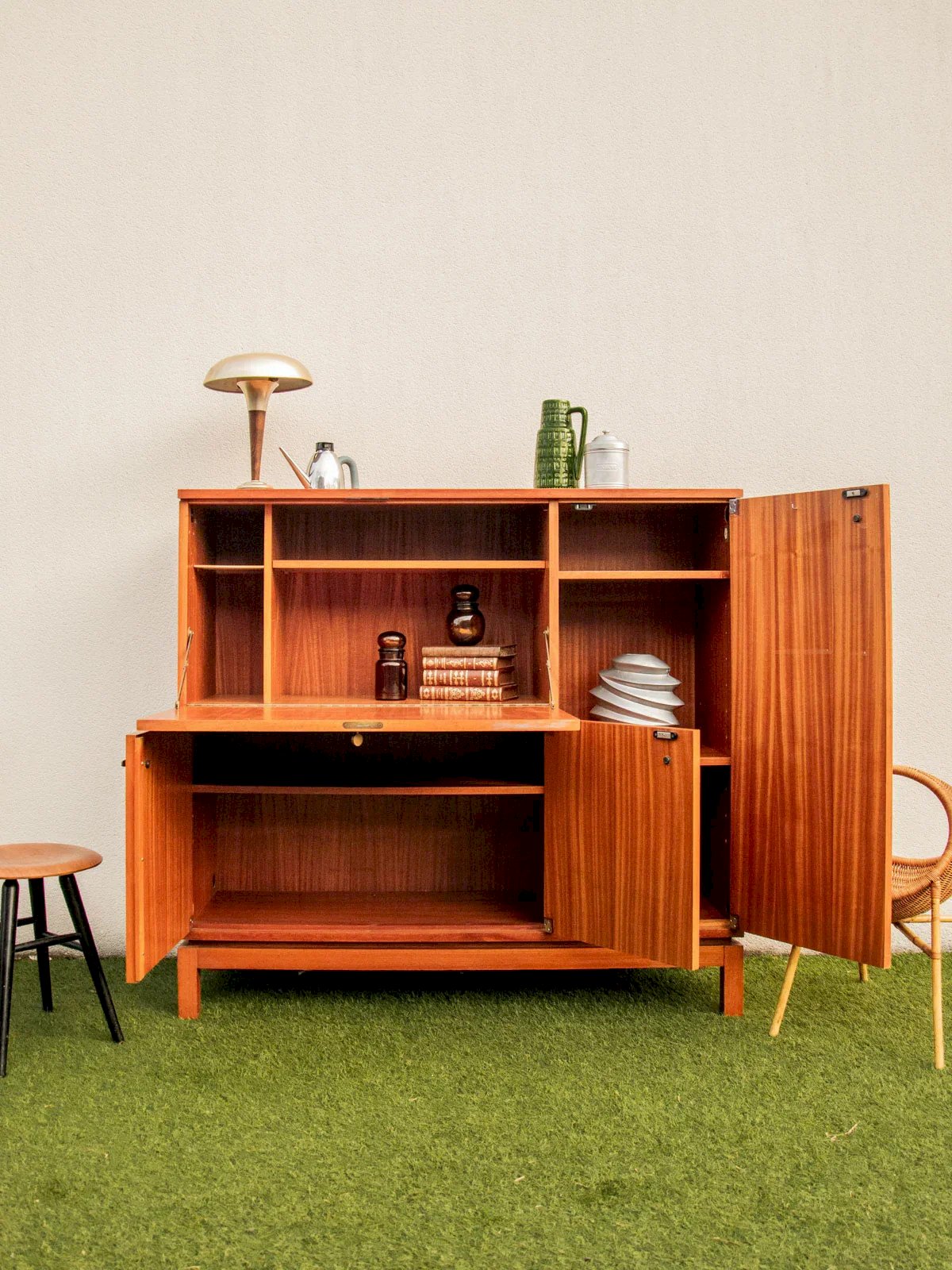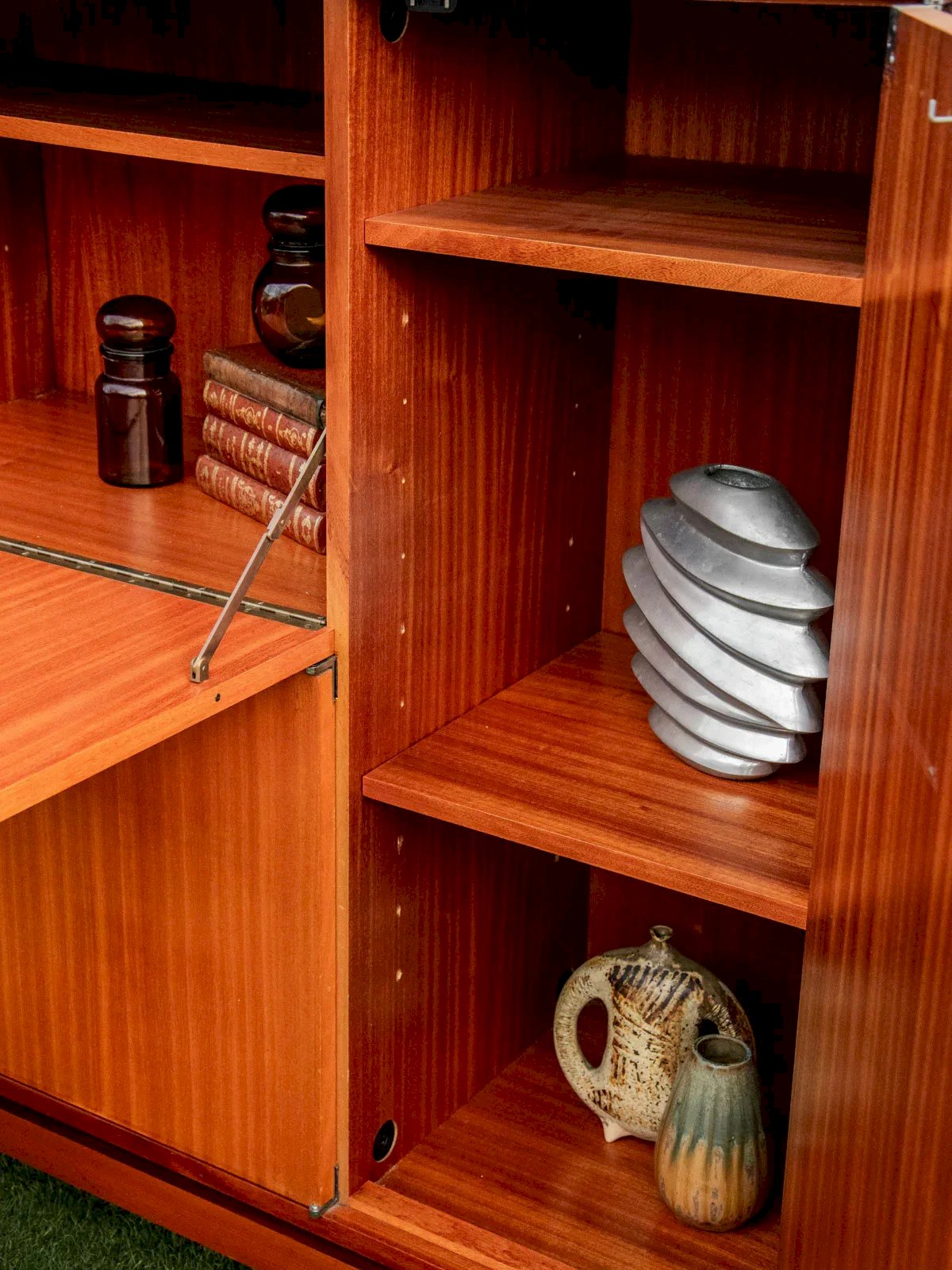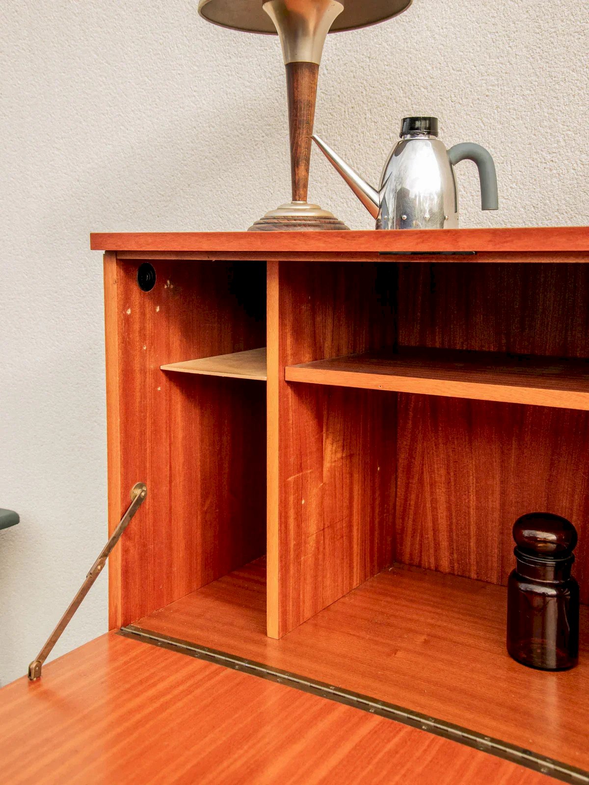 Sublimez votre intérieur avec ce meuble moderniste attribué à Marcel Gascoin, édition Alvéole, qui combine enfilade, secrétaire et buffet dans un volume harmonieux. Son plateau de bureau ouvrable, ses étagères modulables et ses placards à étagères réglables offrent un rangement généreux et organisé, idéal pour le salon ou un espace de travail. Les poignées et la clé du secrétaire en laiton ponctuent la silhouette sobre du bois, apportant une élégante note chaleureuse. Très bon état général. Longueur : 135 cm Largeur : 46 cm Hauteur : 126 cm Plateau du bureau ouvrable : Longueur : 88 cm Largeur : 48 cm Hauteur sous plateau : 74 cm Etagères au-dessus du bureau : Longueur : 17,5 cm et 67 cm Largeur : 33 cm Hauteur totale de la niche : 48 cm Hauteur de l'étagère intermédiaire : 33 cm Placards sous le bureau : Longueur : 86 cm Largeur : 33 cm Hauteur d'étagère ajustable Placard de droite : Longueur : 42 cm Largeur : 33 cm Hauteur d'étagère ajustable État:Occasion: Objet ayant été utilisé. Objet présentant quelques marques d'usure superficielle, ...Occasion: Objet ayant été utilisé. Objet présentant quelques marques d'usure superficielle, entièrement opérationnel et fonctionnant correctement. Il peut s'agir d'un modèle de démonstration ou d'un objet retourné en magasin après une courte période d'utilisation. les éventuelles imperfections. Marque:Debongout Type:Produit chiné Matériau:Bois Style:Contemporain Personnalisé:Secrétaires