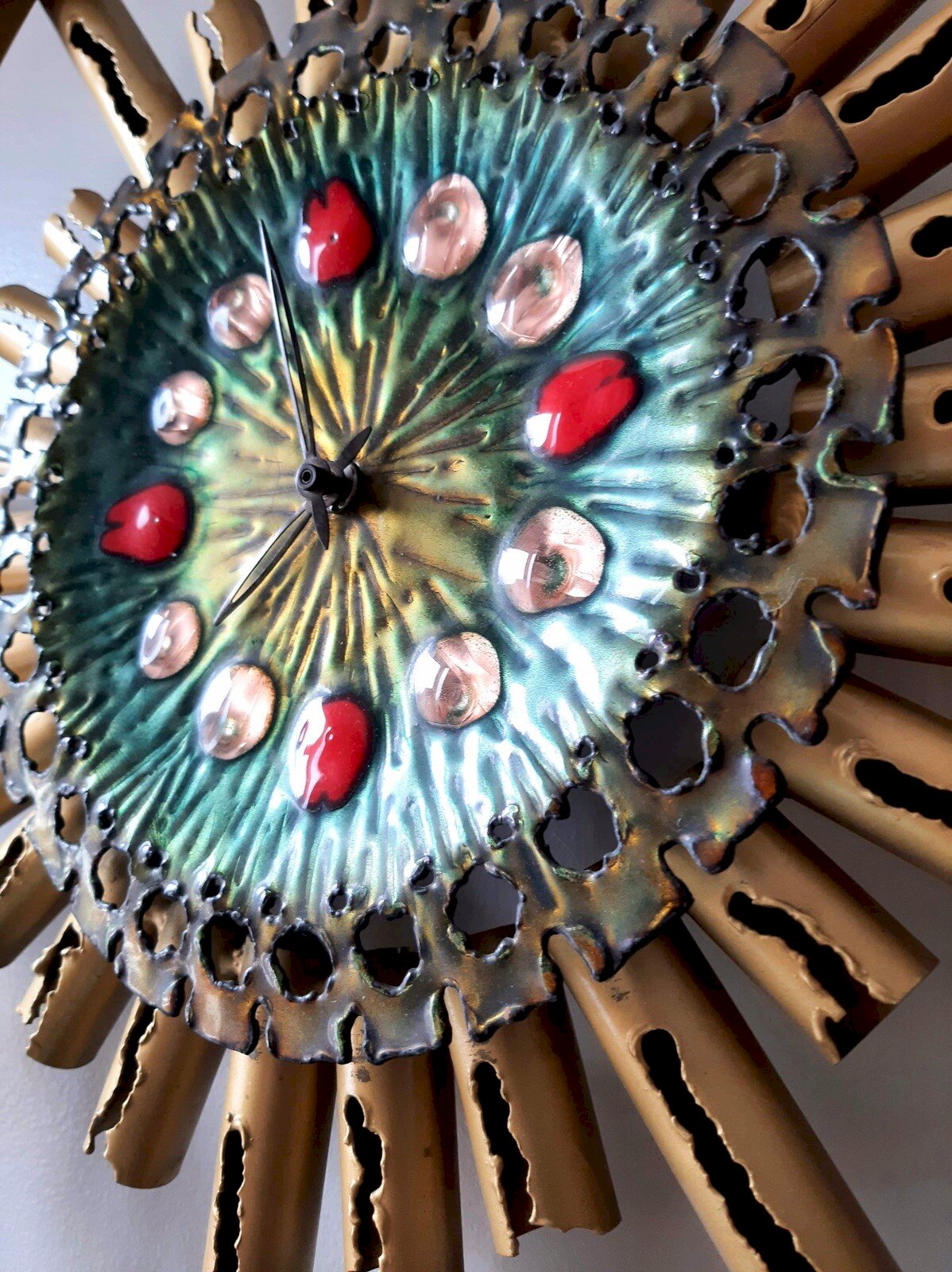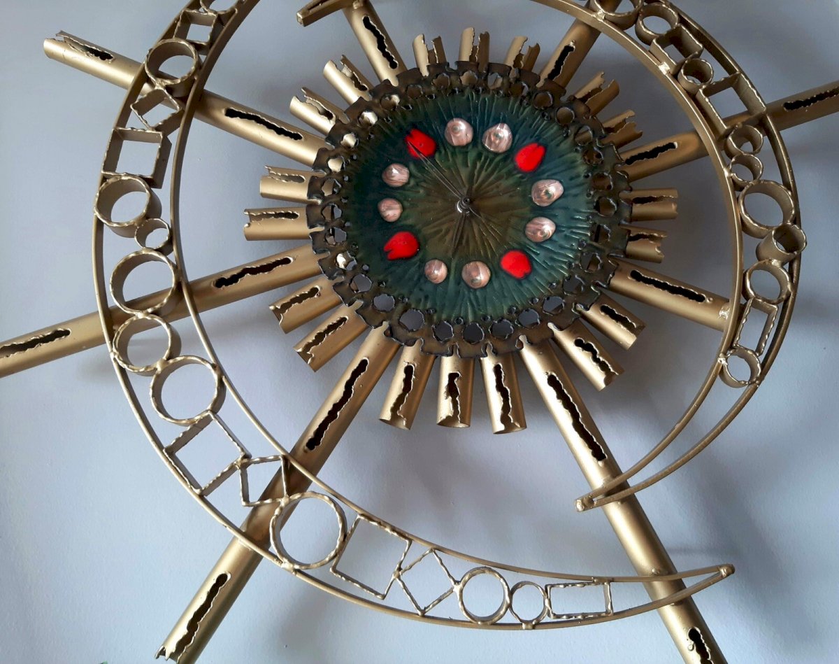 HORLOGE MURALE VINTAGE DE FRANCO BASTIANELLI POUR LE STUDIO LAURANE, 1960 N’hésitez pas à consulter mes autres annonces sur mon autre profil pseudo altaria59. Très grande horloge conçue par l'artiste italien Franco Bastianelli. C'est un objet fait à la main et fabriqué par le Studio Laurane dans les années 1960. L'horloge fonctionne. Étiquette d'origine à l'arrière. Dimensions 75 x 75 x 7 cm Fonctionne. Possibilité de livraison par transporteur (ex 40€ vers Paris et région parisienne, me contacter pour d’autres destinations). Les délais de livraison de 2 à 4 jours sont imposés par et sont donc donnés à titre purement indicatif. Rétro ancien brutaliste lune soleil