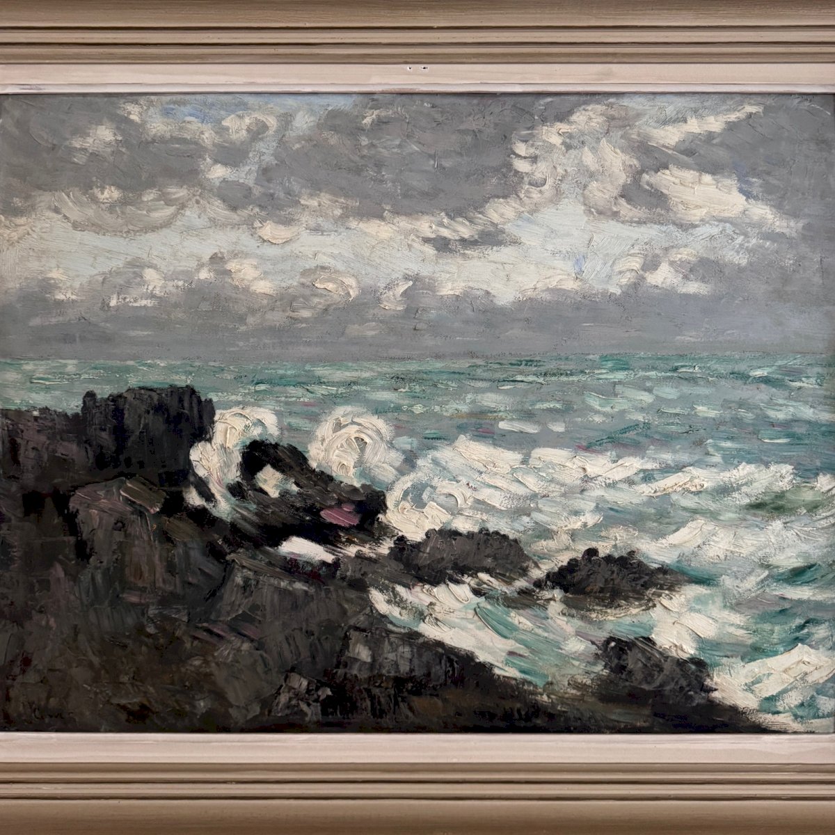 Huile sur carton représentant la houle par Cavver XXe cadre cérusé A5767