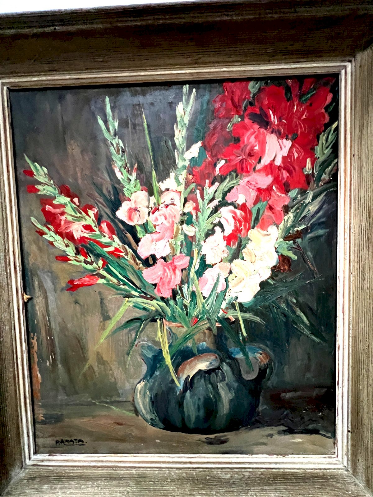 Huile sur isorel "Le bouquet de glaïeuls " signé P . ARATA XX siècle
