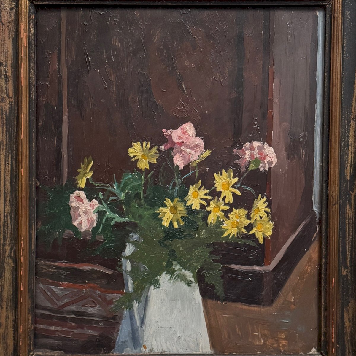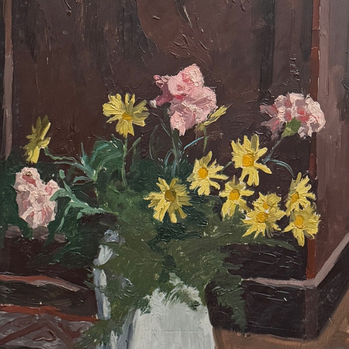 Huile sur panneau début XXe bouquet de fleurs dans son vase A5860 Cette œuvre non signée est joliment amenée, de belle facture. L'œuvre est vendue non préparée, non restaurée, nous signalons des traces d'usure dues au temps, notamment sur le cadre. L'ensemble reste cependant dans un état général tout à fait convenable. Nos photos vous permettent d’apprécier la qualité de l’œuvre. Pour l’état, merci de bien détailler les photos. N’hésitez pas à zoomer. Les photos font partie intégrante de la description. Dimensions : - Cadre Hauteur : 58 cm Largeur : 50 cm Épaisseur : 4,5 cm - Œuvre Hauteur : 44,8 cm Largeur : 36,8 cm A : AJ52TJADCW P : 1681470 Je reste à votre disposition pour toute question. Authenticité:Inconnu Poids:Inconnue Type:Huile Pays d'origine:France métropolitaine Hauteur:58 cm Style:Non-spécifié Genre:Inconnu Longueur:cm Caractéristiques:Encadré, Sur panneau Largeur:50 cm Thème:Nature morte