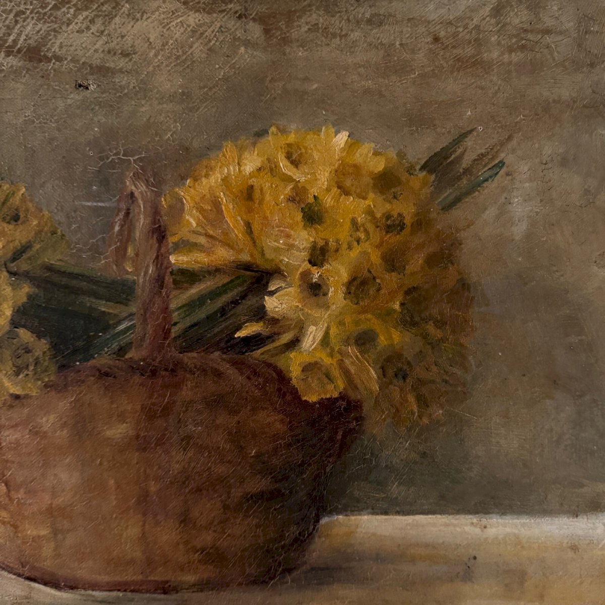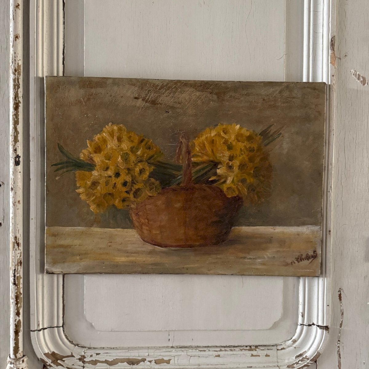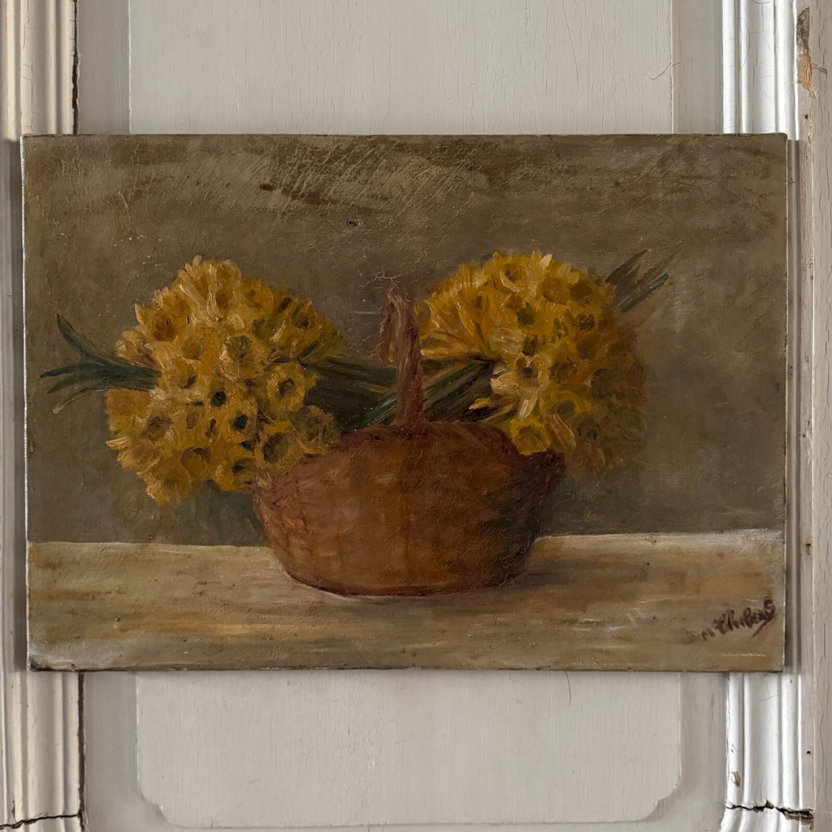 Huile sur toile nature morte bouquets de jonquilles dans un panier XXe A5704