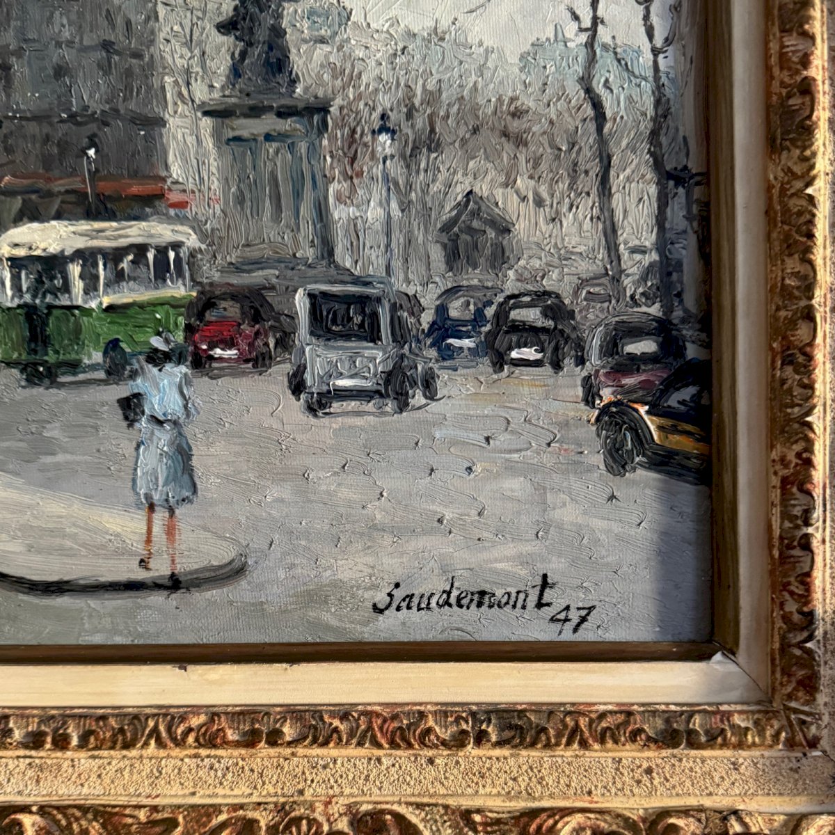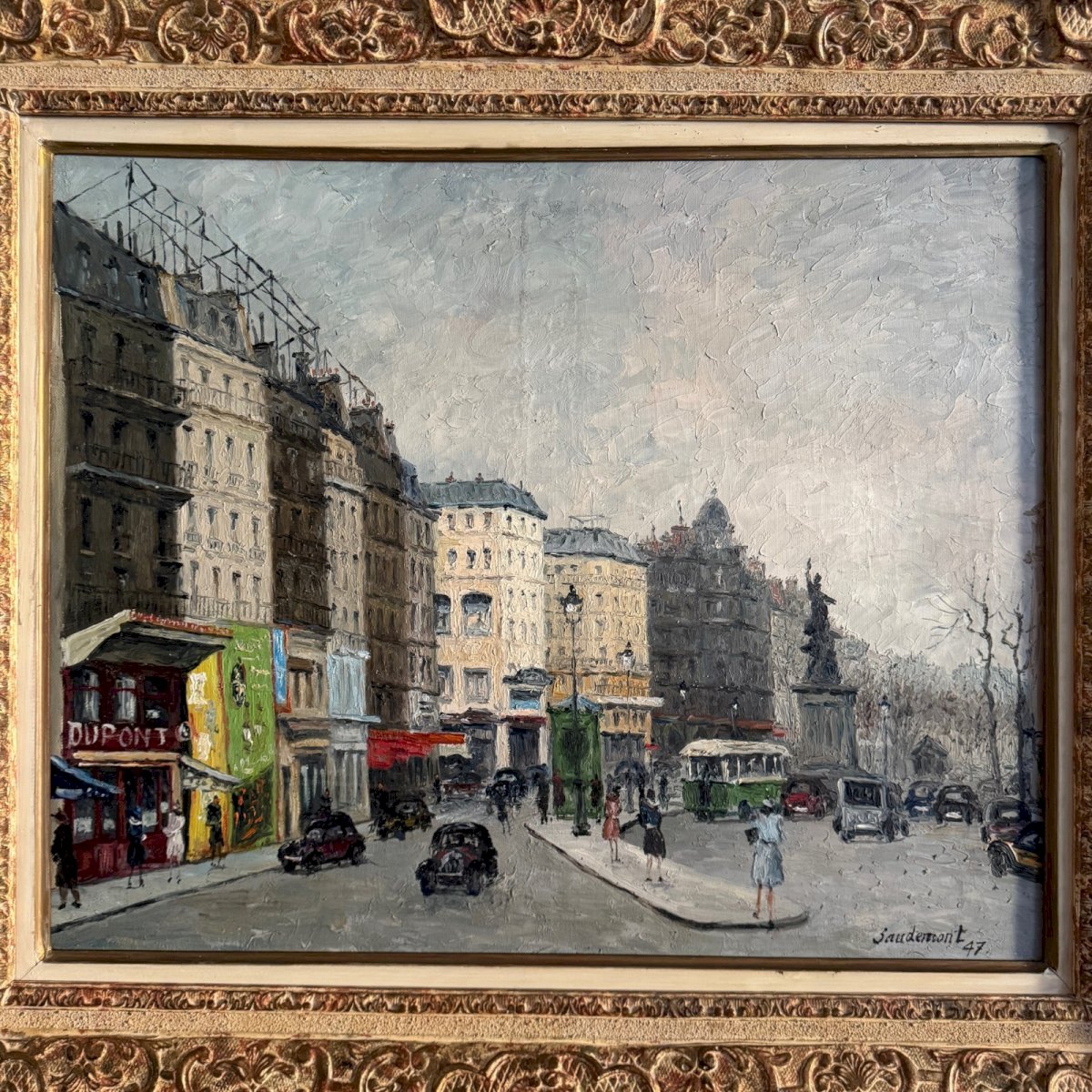 Huile sur toile par Emile Saudemont boulevard parisien cadre cérusé 1947  A5830 Cette huile sur toile a été réalisée par Emile Saudemont, elle représente un boulevard parisien. Elle est de belle facture. Elle est dans un bon état général, notons de minimes accidents sur le cadre. Émile Saudemont (1898-1967) est un peintre français. Il expose régulièrement au Salon des Artistes Français de Paris à partir de 1946, il peint les lieux connus parisiens et décore la mairie de Suresnes. Nos photos vous permettent d’apprécier la qualité de l’œuvre. Pour l’état, merci de bien détailler les photos. N’hésitez pas à zoomer. Les photos font partie intégrante de la description. Dimensions  : - Cadre Hauteur : 67,5 cm Largeur : 78,5 cm Épaisseur : 6 cm - Œuvre Hauteur : 48 cm Largeur : 59,5 cm A :  XJP18B6HNA P :  1664600   Je reste à votre disposition pour toute question. Authenticité:Inconnu Poids:Inconnue Hauteur:67,5 cm Longueur:cm Caractéristiques:Encadré, Signé, Sur toile Largeur:78,5 cm Artiste:Emile Saudemont Type:Huile Pays d'origine:France Style:Non-spécifié Genre:Inconnu Thème:Boulevard parisien