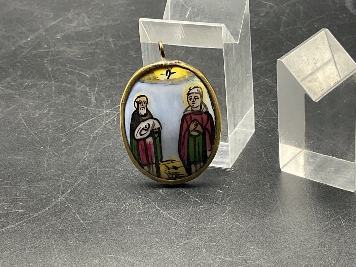 icone de voyage Pendentif Email  recto/verso Russie XVIII-XIX EME Dimension : 3,5 x 3 cm Authenticité:Original Type:Objet de vitrine, Décoratif Origine:Russie Matière:Porcelaine
