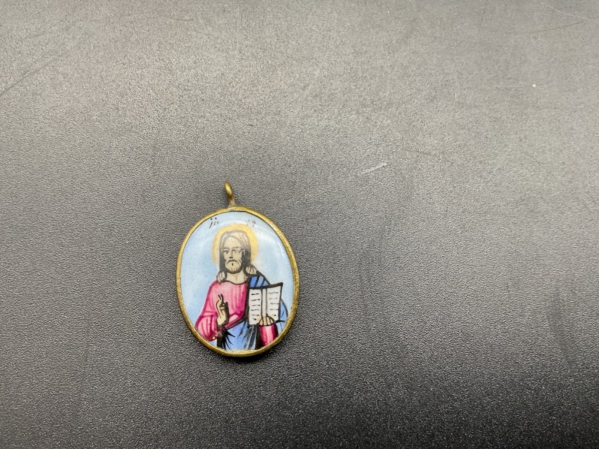 icone de voyage Pendentif Email  recto/verso Russie XVIII-XIX EME Dimension : 2,6 x 2 cm Authenticité:Original Type:Objet de vitrine, Décoratif Origine:Russie Matière:Porcelaine