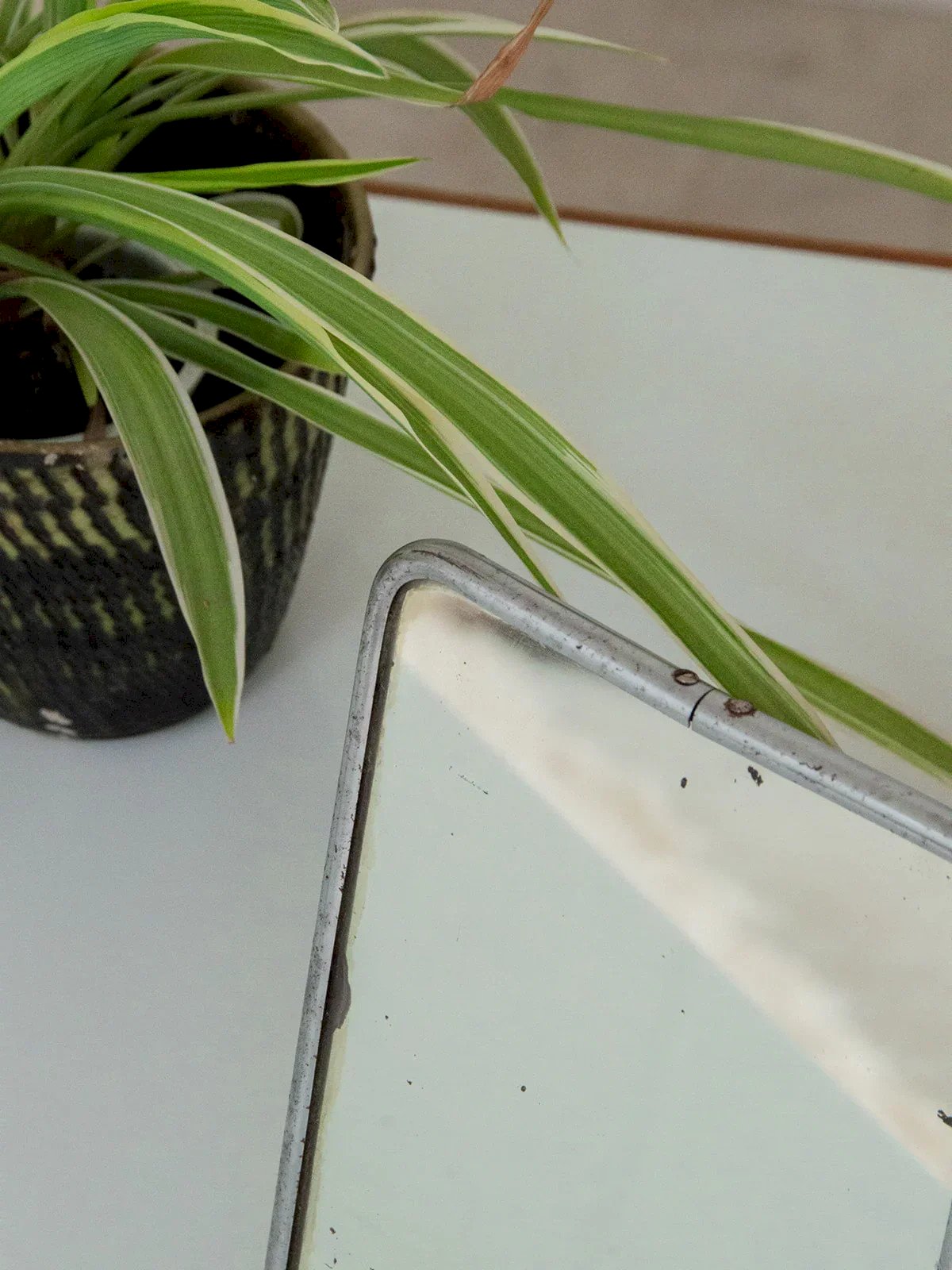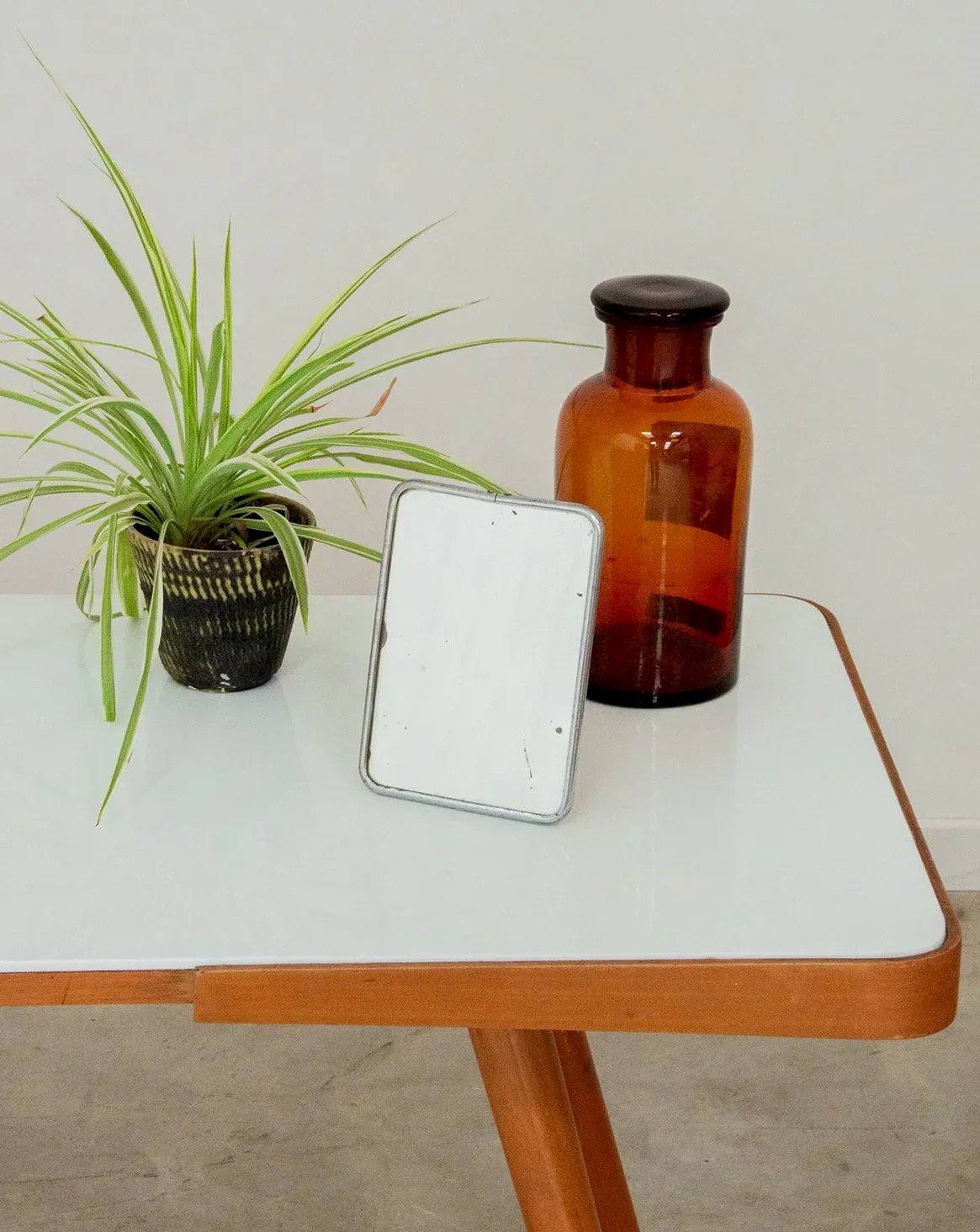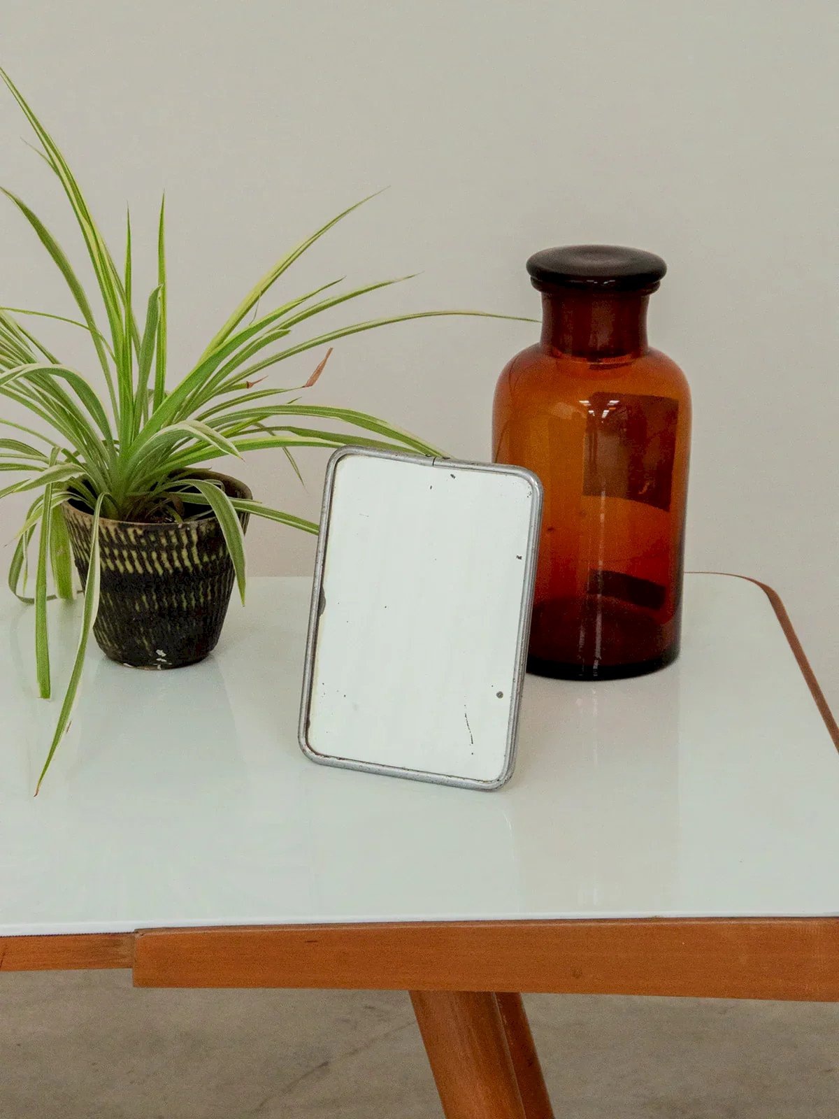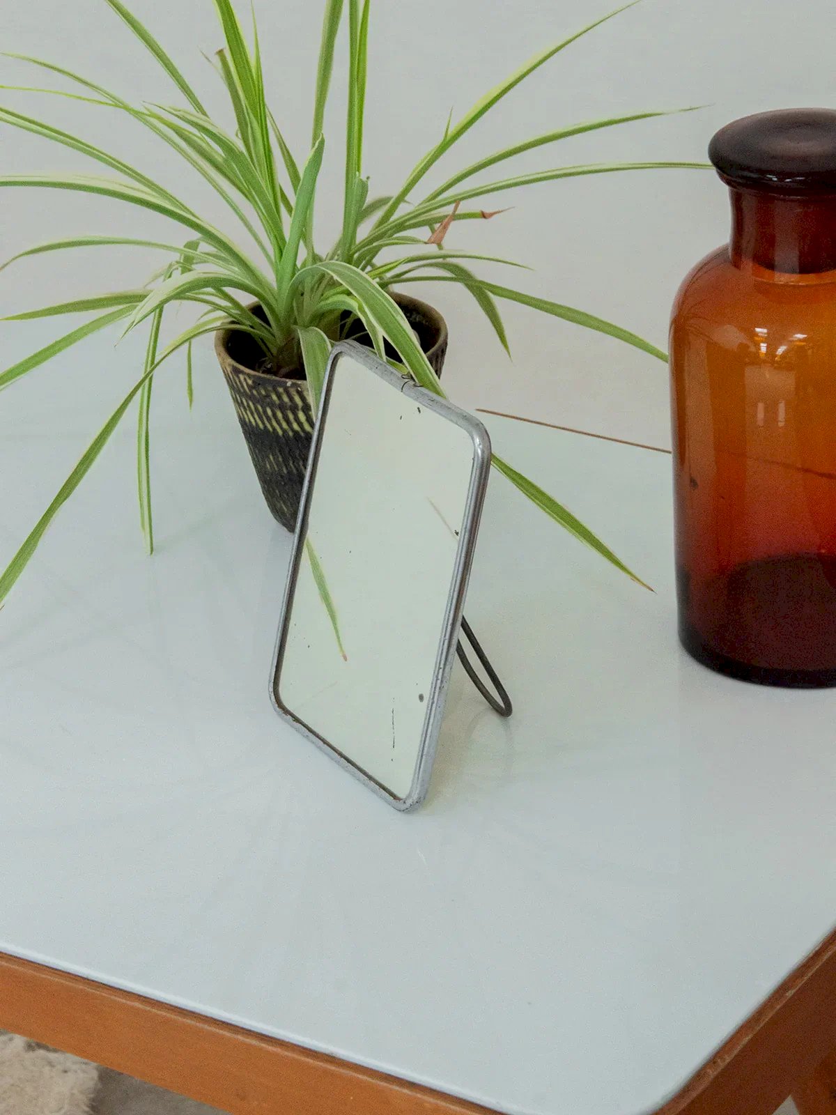 À la fois pratique et décoratif, ce petit miroir s’adapte à vos envies. Grâce à son pied discret, il se pose facilement sur une étagère ou une coiffeuse, mais peut également s'accrocher au mur selon vos besoins. Son cadre en métal légèrement piqué lui donne un charme vintage, tandis que ses bords arrondis apportent douceur et élégance. Un accessoire fonctionnel au style délicatement rétro. Longueur : 18 cm Largeur : 13 cm État:Occasion: Objet ayant été utilisé. Objet présentant quelques marques d'usure superficielle, ...Occasion: Objet ayant été utilisé. Objet présentant quelques marques d'usure superficielle, entièrement opérationnel et fonctionnant correctement. Il peut s'agir d'un modèle de démonstration ou d'un objet retourné en magasin après une courte période d'utilisation. les éventuelles imperfections. Marque:Debongout Type:Produit chiné Matériau:Verre, Métal Style:Contemporain
