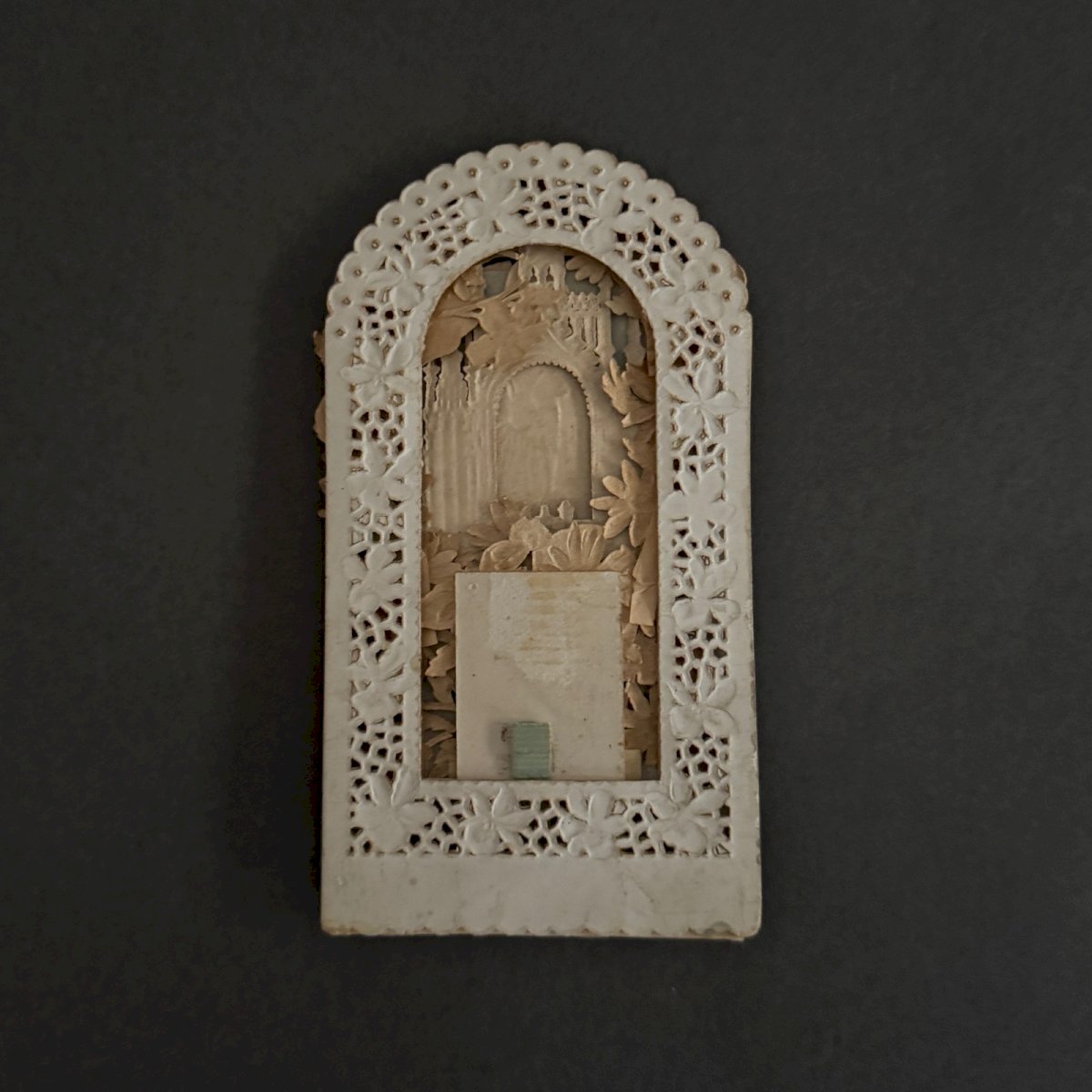 Image pieuse canivet Souvenir de Première Communion XIXe A5784 Cette image pieuse ou canivet est  rehaussée en couleur avec un joli travail de découpe. Nous signalons un léger jaunissement par endroits, de minimes taches, cependant elle reste dans un état tout à fait présentable. Nos photos vous permettent d'apprécier la qualité de l'objet. Pour l'état, merci de bien détailler les photos. N'hésitez pas à zoomer . Les photos font partie intégrante de la description. Dimensions : Hauteur : 13 cm Largeur : 7 cm Profondeur : 11 cm   Je reste à votre disposition pour toute question. État:OccasionObjet ayant été utilisé. les éventuelles imperfections. Type:Christianisme Sous-type:Image pieuse Pays d'origine:France Matière:Papier, Carton