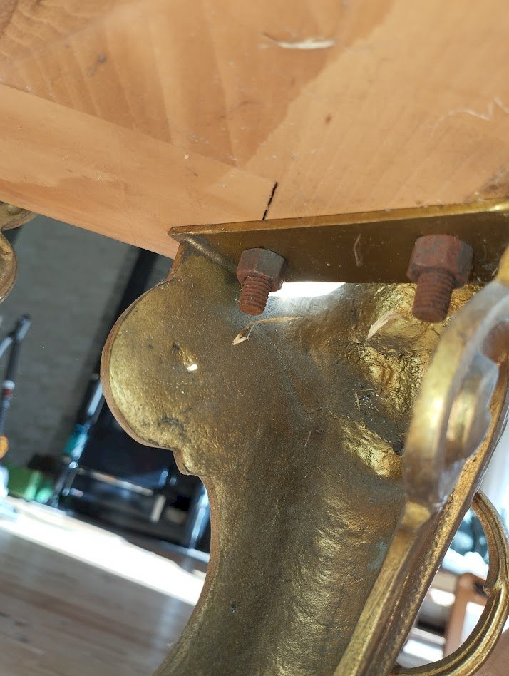 Ce piètement repose sur quatre pieds richement décorés, ornés de mascarons barbus tenant des anneaux, typiques de l’esthétique Second Empire.