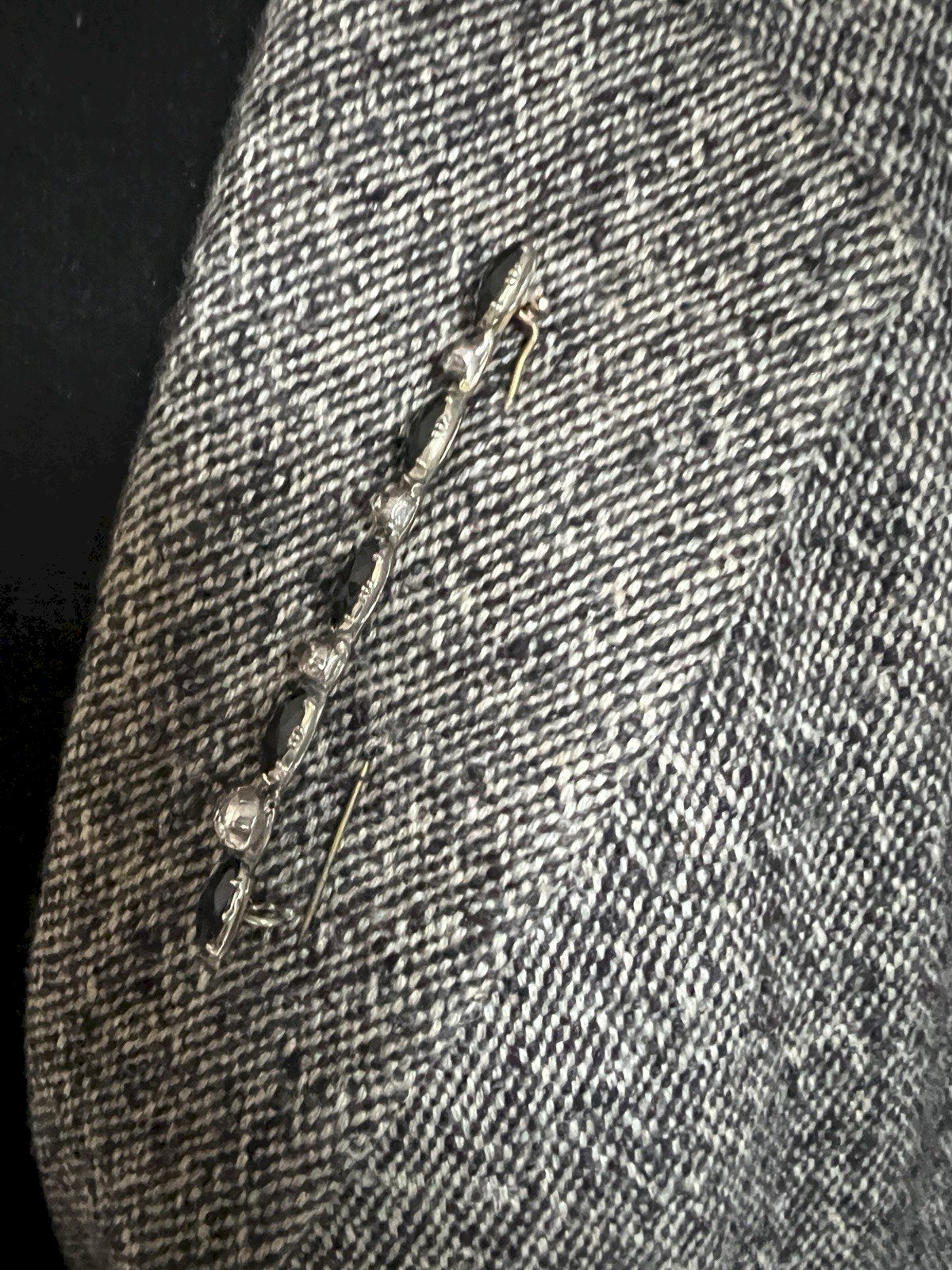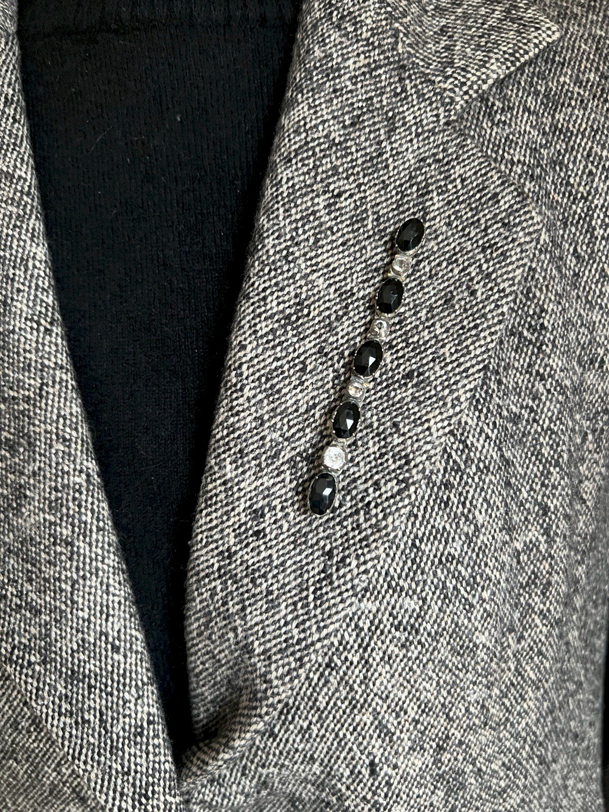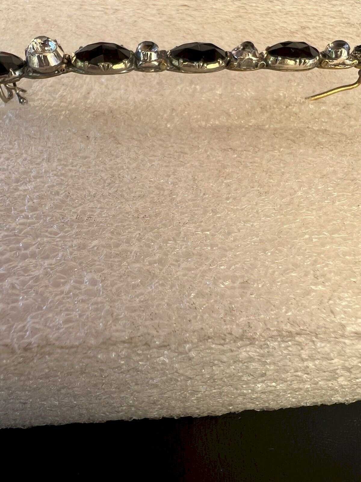 Cette broche barrette ancienne du XIXe siècle est un bijou de curiosité au montage artisanal unique. Elle alterne cinq pierres en verre noir facetté et quatre pierres du Rhin de dimensions variées, ces dernières étant serties dans des montures anciennes en argent. L'ensemble est fixé sur une monture en métal par des soudures à l'étain anciennes et robustes. Notez que l'ensemble des pierres présente des traces d'usure d'usage conformes à son ancienneté, ce qui confirme son caractère authentique. Ce modèle mesure environ 8,5 cm de long pour environ 0,7 cm de large. Elle dispose d'une fermeture par épingle longue et fonctionnelle. Bon état antique . Petite sécurité sur fermoir État:Occasion: Objet ayant été porté. ...Occasion: Objet ayant été porté. les éventuelles imperfections. Type:Broche Marque:Xixe Siècle Couleur dominante:Argenté Matière:Pierre