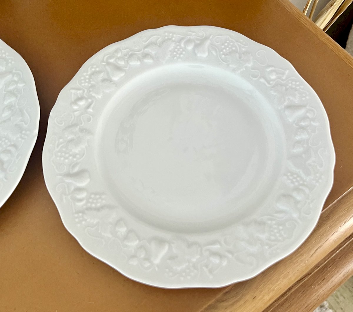 Apportez une touche de campagne chic à votre table avec ces 2 assiettes à gâteau "California" en porcelaine blanche bordée de feuilles et fruits en reliefs. Référence lot n° 11.