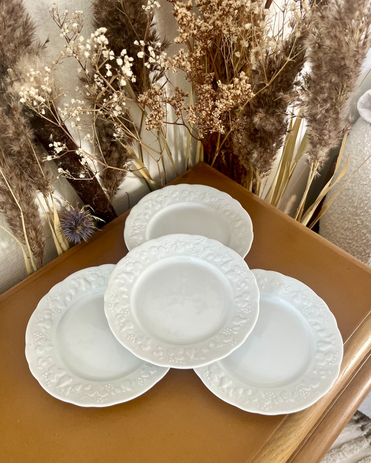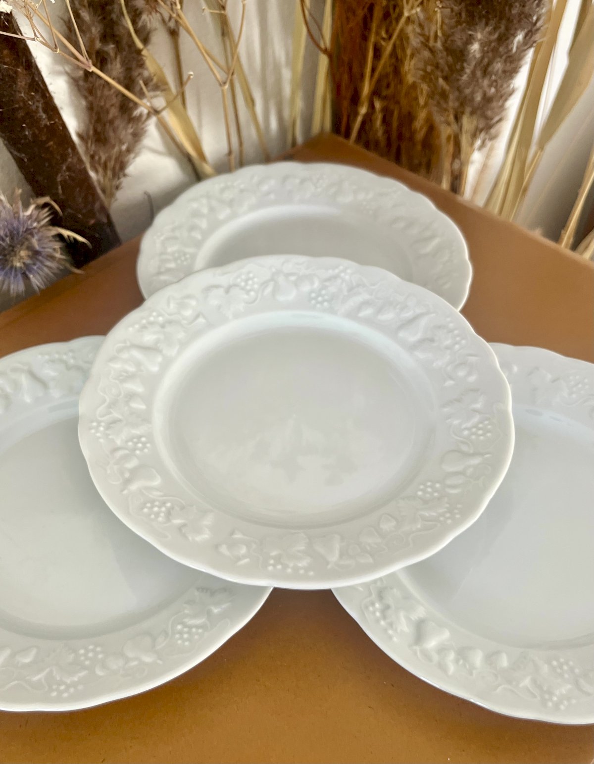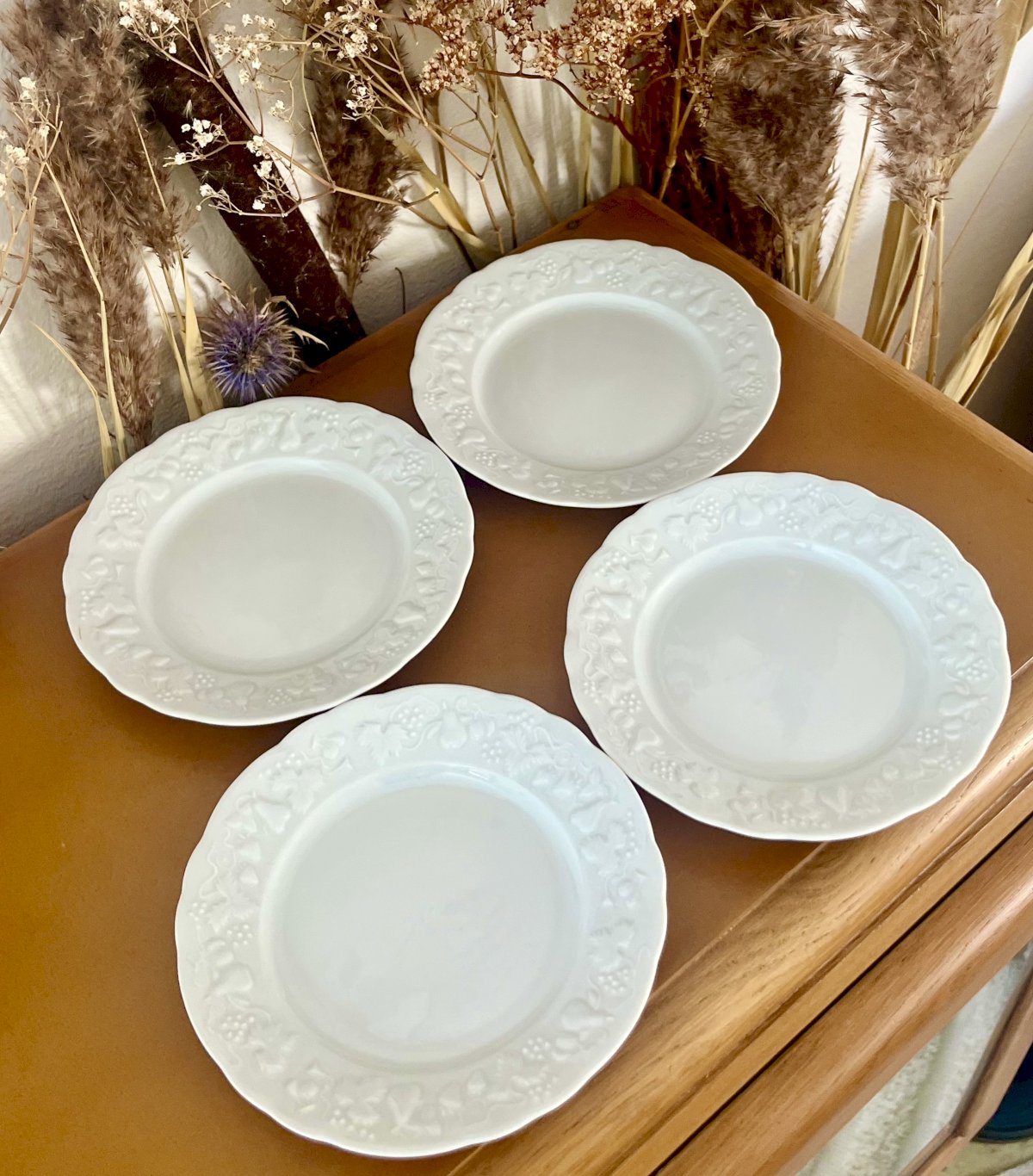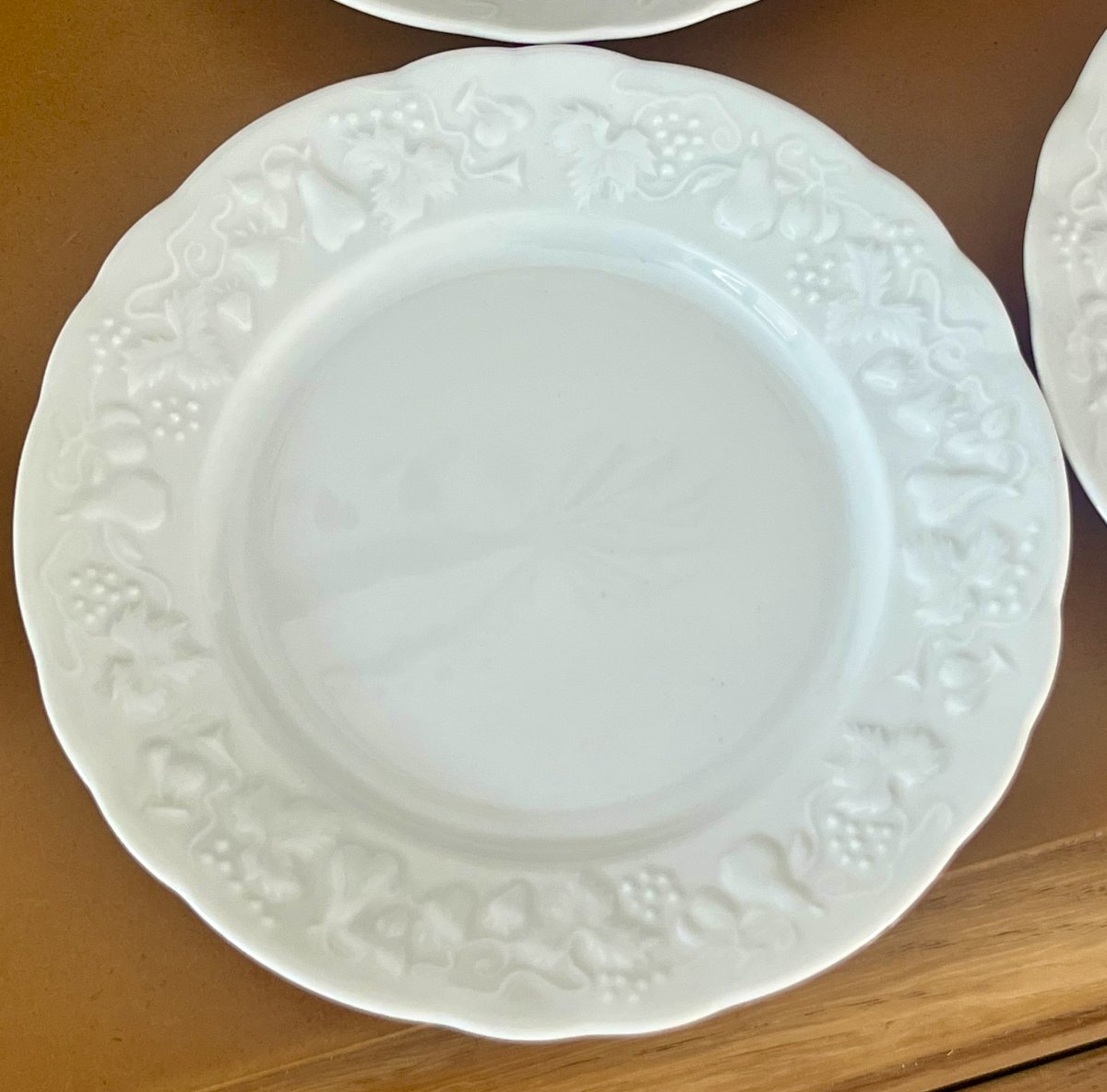 Apportez une touche de campagne chic à votre table avec ces 4 assiettes à pain "California" en porcelaine blanche bordée de feuilles et fruits en reliefs. Référence lot n° 15.