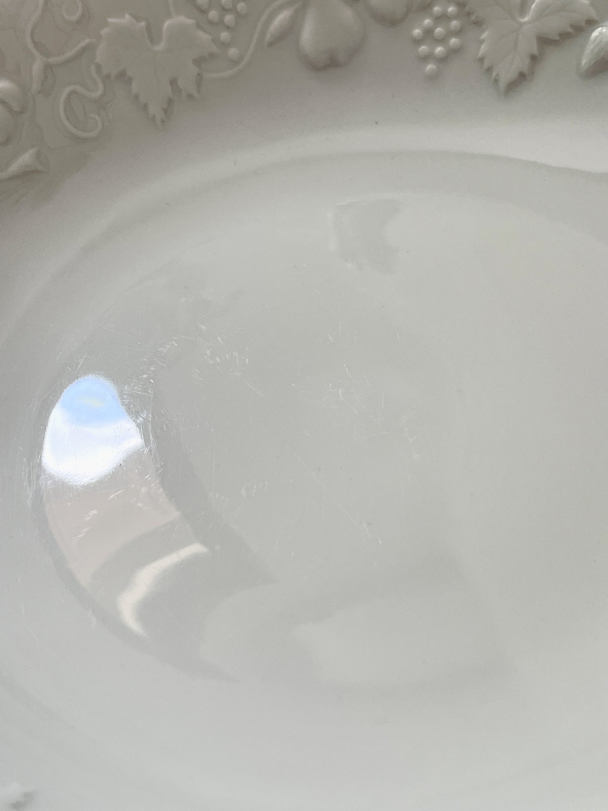 Apportez une touche de campagne chic à votre table avec ce grand plat de service creux "California" en porcelaine blanche bordée de feuilles et fruits en reliefs. Référence lot n° 18.