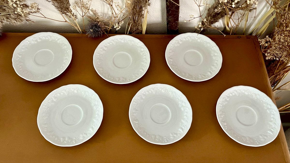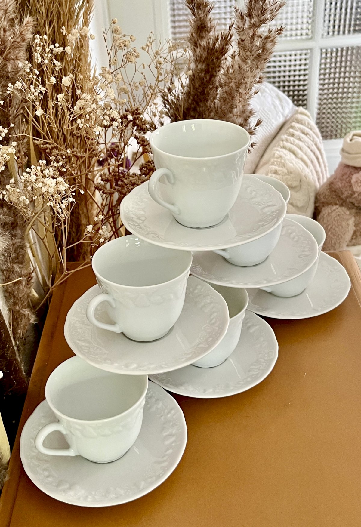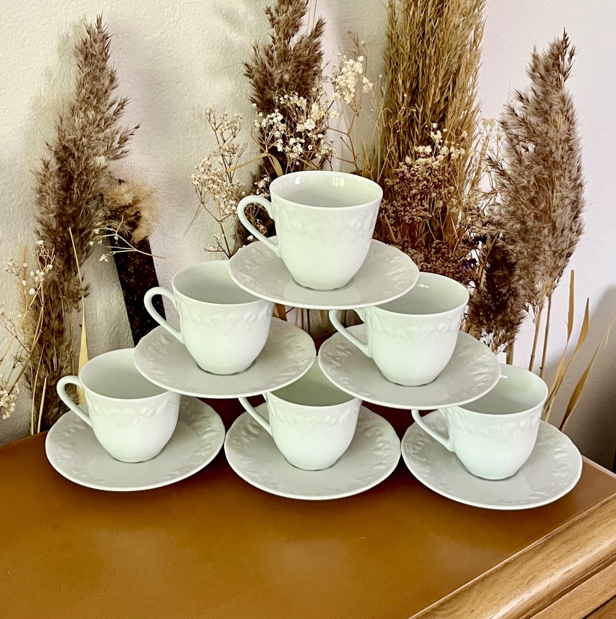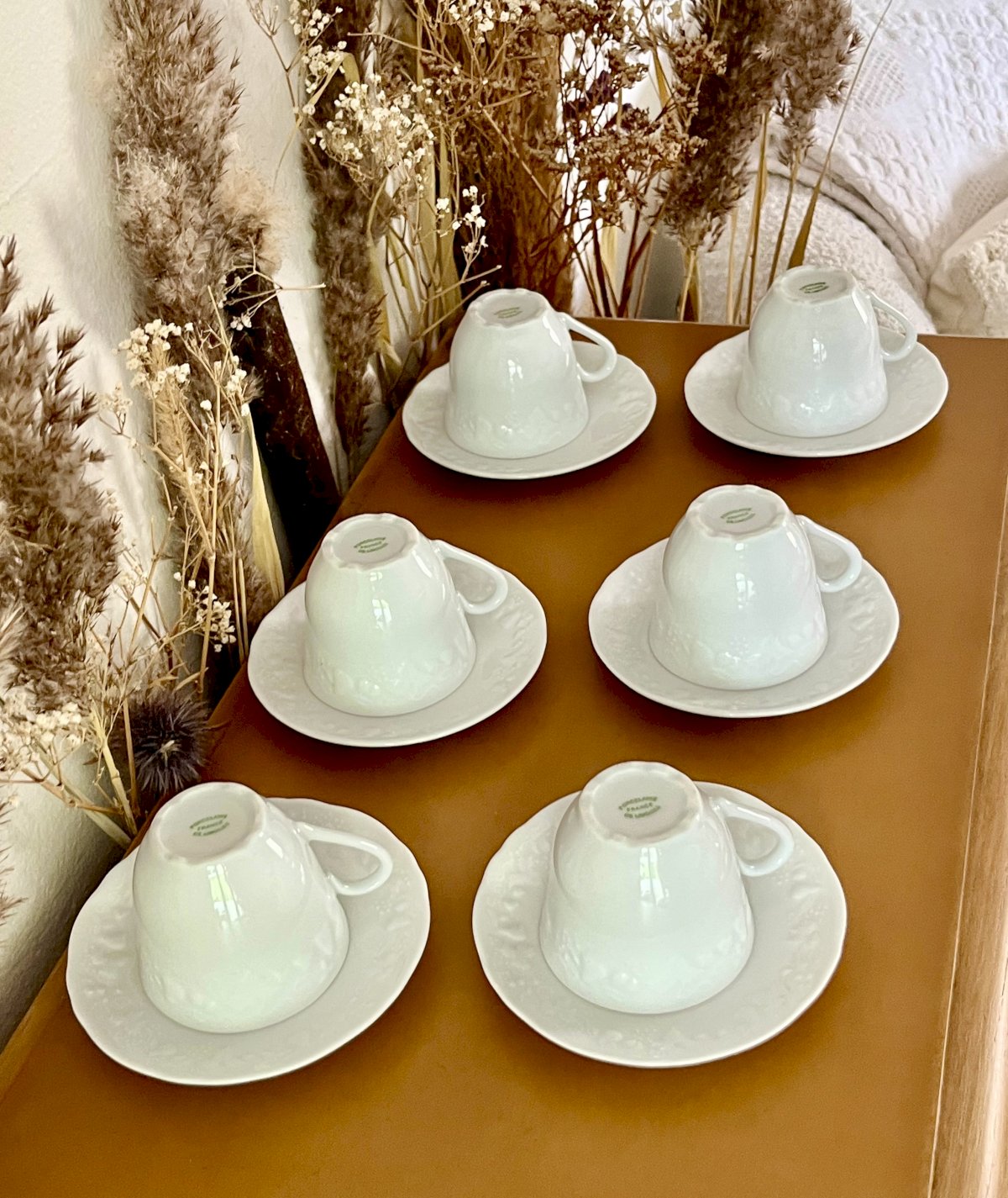 Apportez une touche de campagne chic à votre table avec ces 6 tasses à café avec leurs sous-tasses "California" en porcelaine blanche bordée de feuilles et fruits en reliefs. Référence lot n° 30.