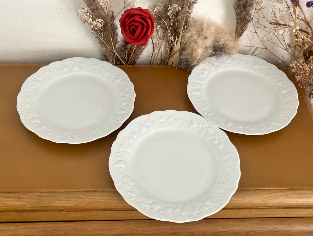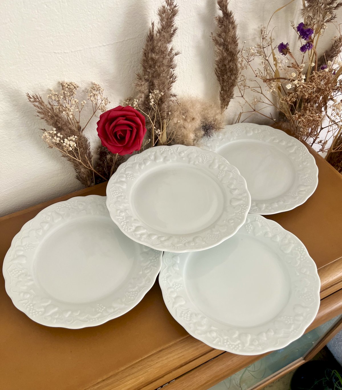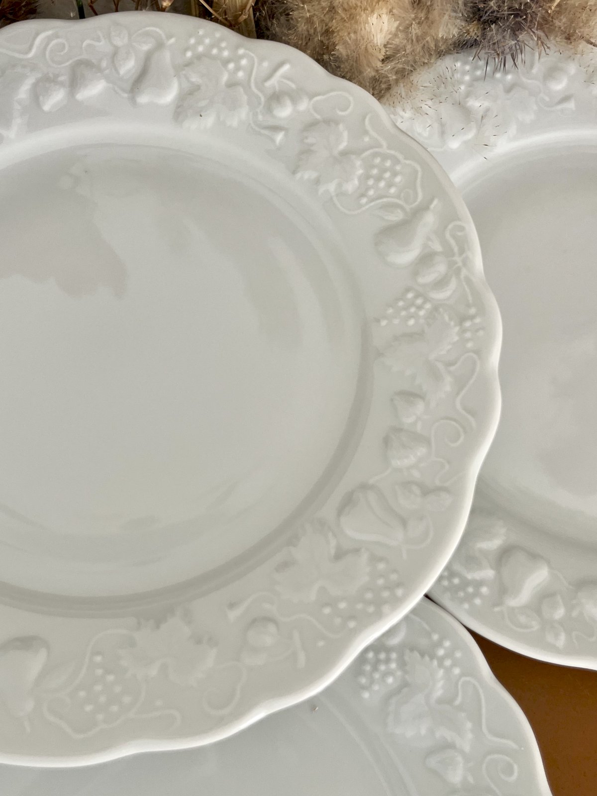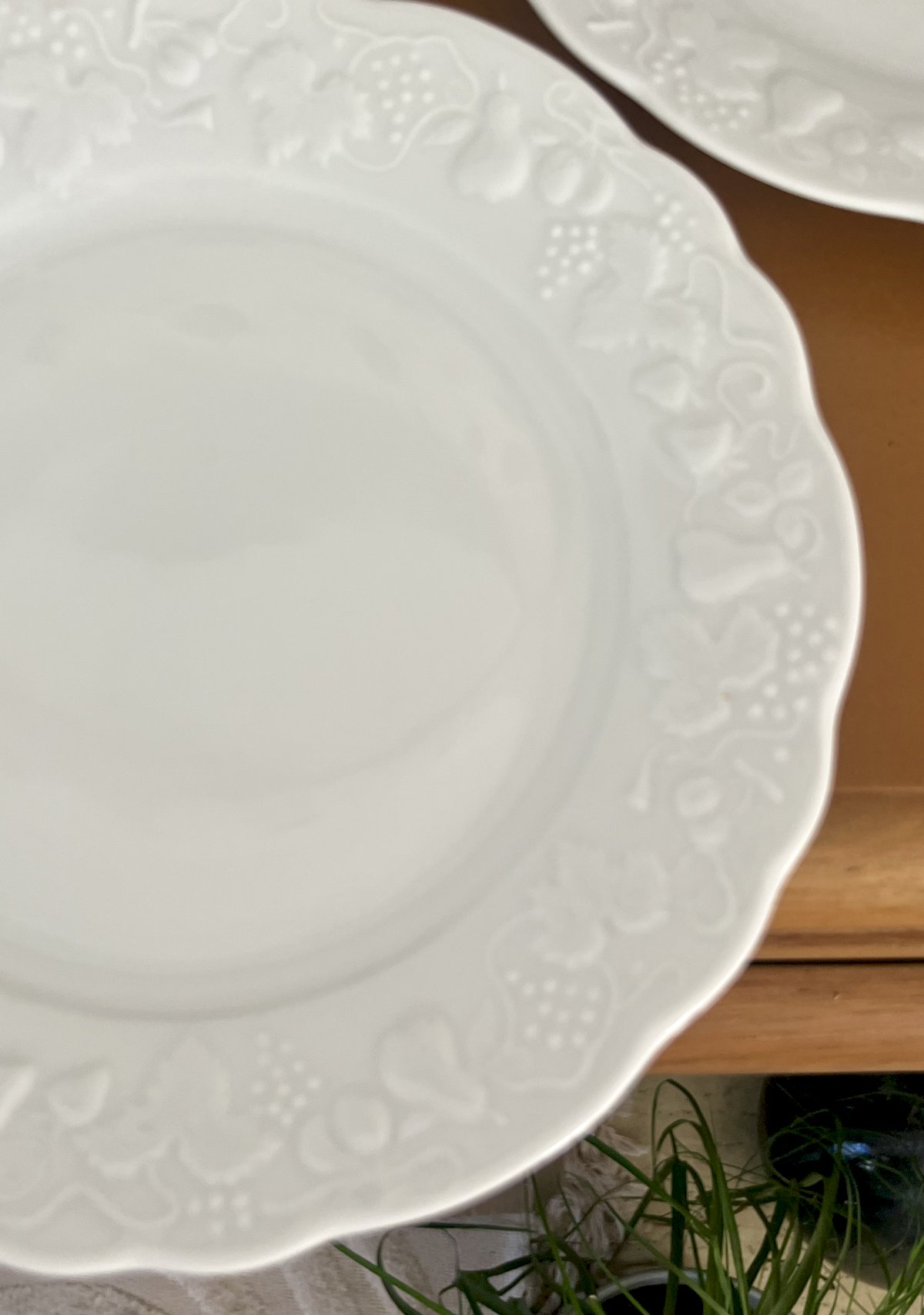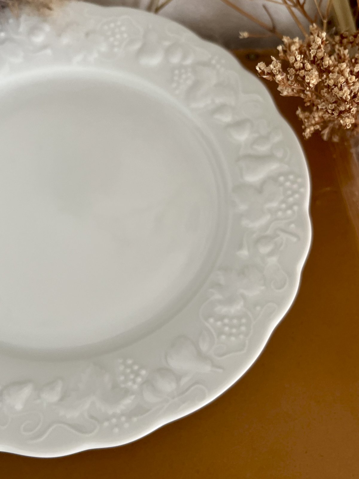 Apportez une touche de campagne chic à votre table avec ces 4 assiettes à dessert "California" en porcelaine blanche bordée de feuilles et fruits en reliefs.