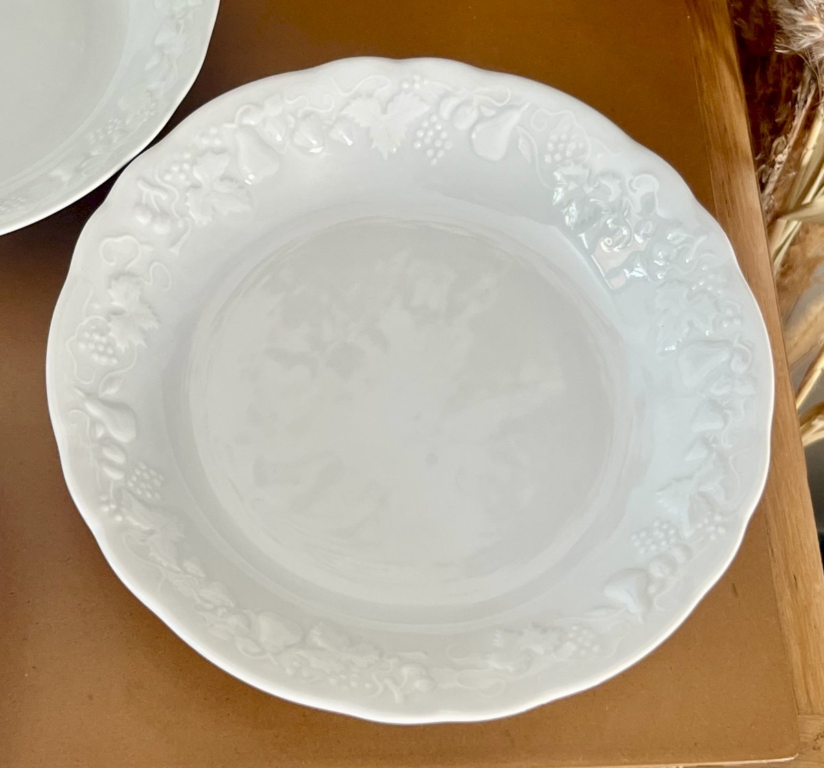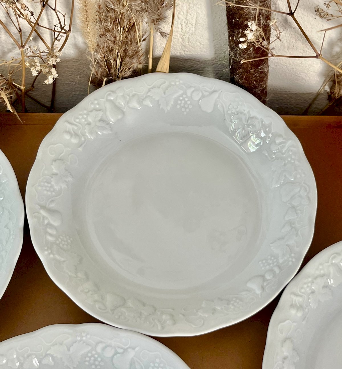 Apportez une touche de campagne chic à votre table avec ces 6 assiettes creuses calottes "California" en porcelaine blanche bordée de feuilles et fruits en reliefs.