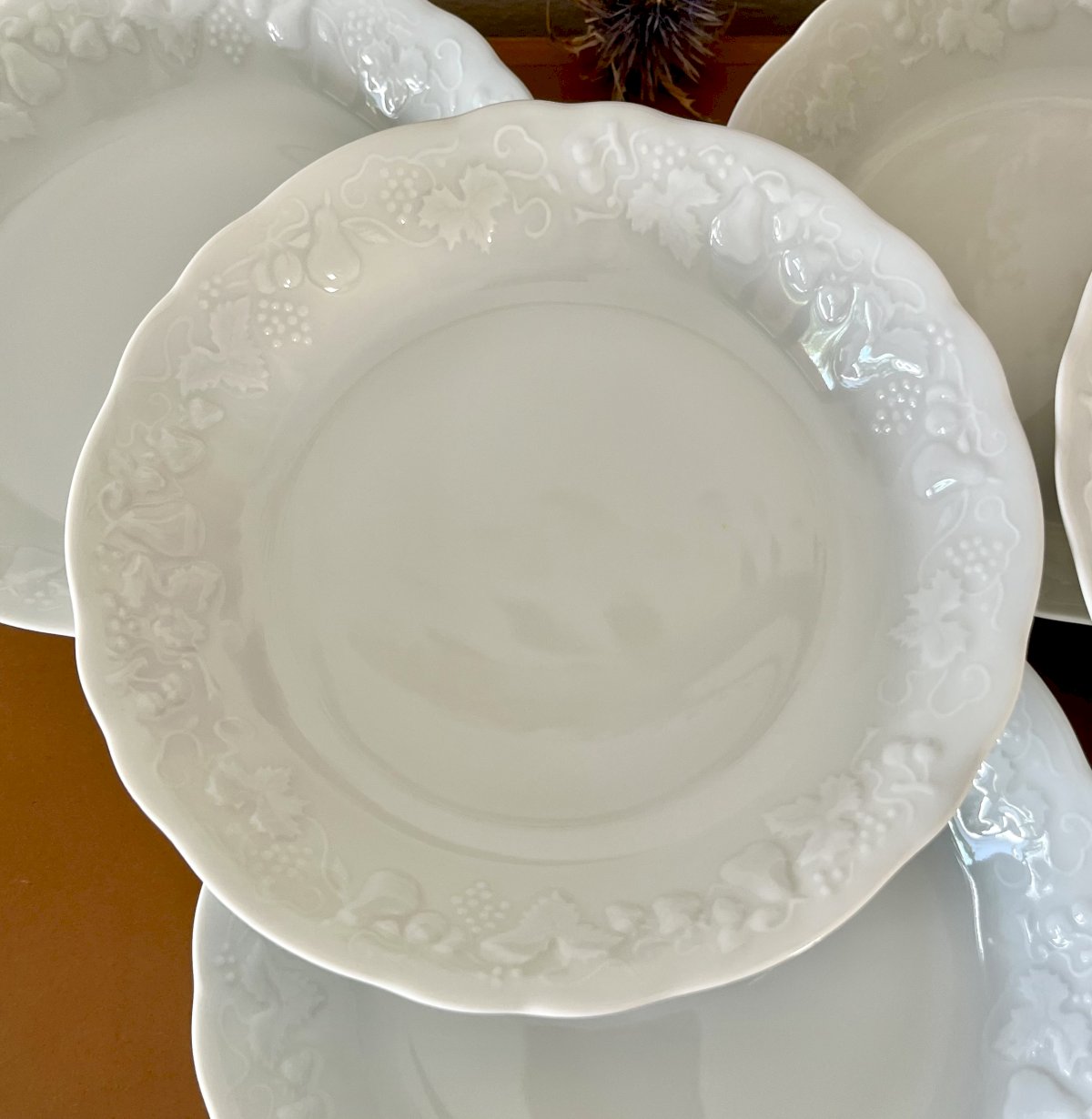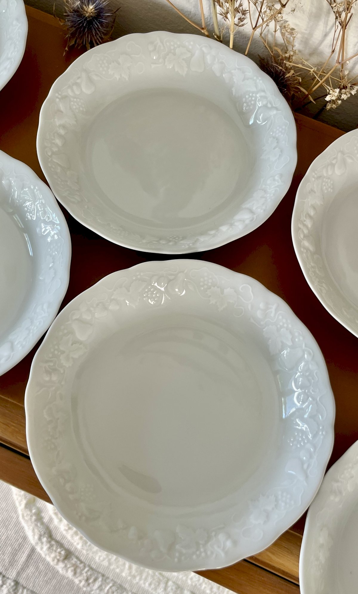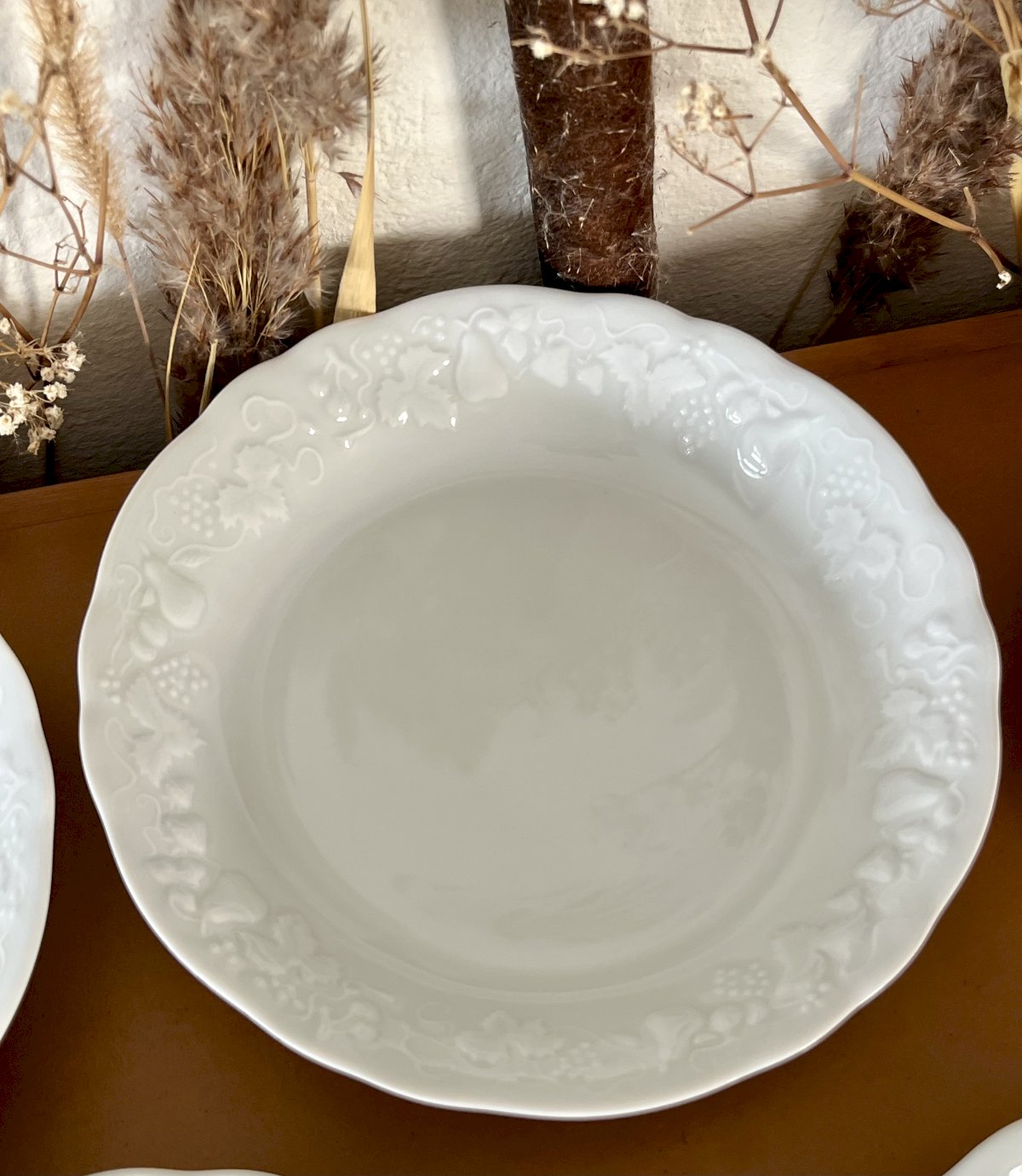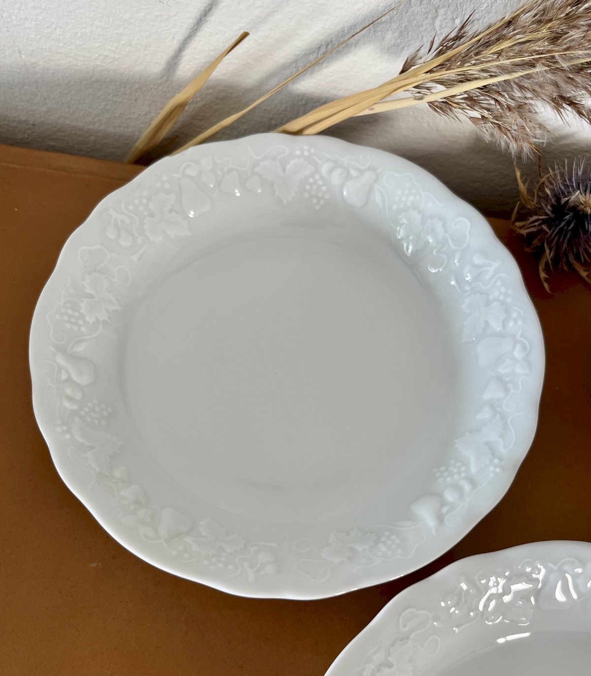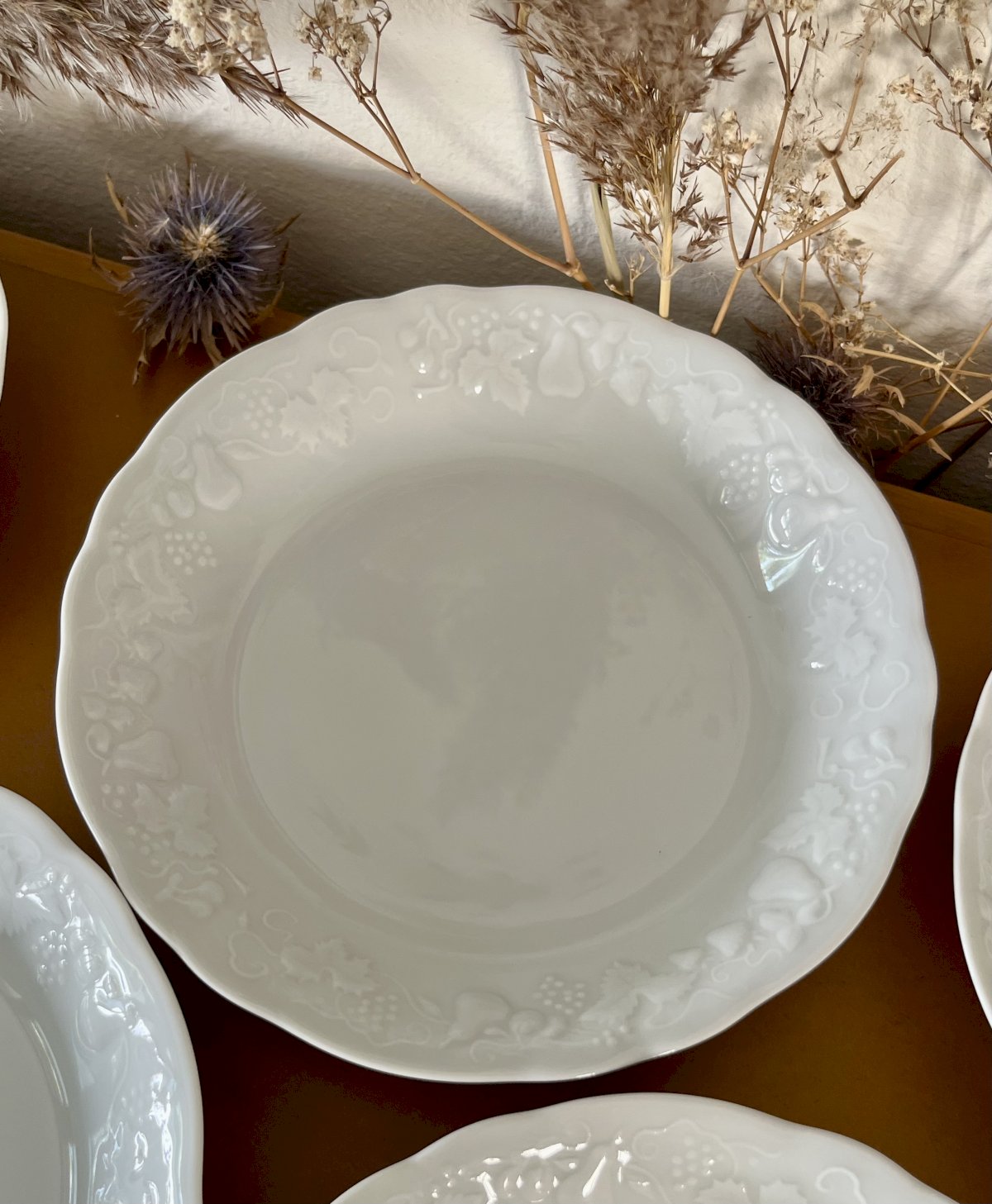 Apportez une touche de campagne chic à votre table avec ces 10 assiettes creuses calottes "California" en porcelaine blanche bordée de feuilles et fruits en reliefs.