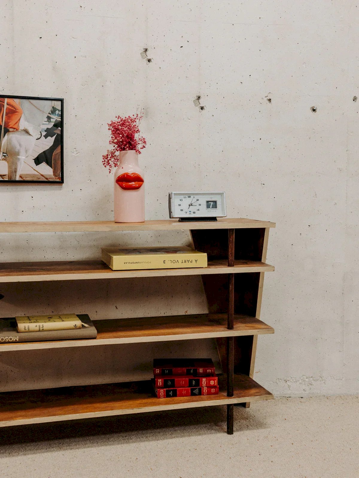 Ajoutez une touche de charme vintage à votre intérieur avec ce meuble étagère à quatre niveaux. Fabriqué à partir de bois peint en beige et de bois naturel foncé, ce meuble allie élégance et fonctionnalité. Ses pieds originaux lui confèrent un style unique, tandis que les légères traces d’usure racontent son histoire et ajoutent du caractère. Parfait pour exposer vos livres, plantes ou objets décoratifs, cet étagère s'intégrera harmonieusement dans tout type de décoration. Longueur : 124 cm Hauteur : 75,5 cm Profondeur : 31 cm Hauteur de la niche : 20 cm État:Occasion: Objet ayant été utilisé. Objet présentant quelques marques d'usure superficielle, ...Occasion: Objet ayant été utilisé. Objet présentant quelques marques d'usure superficielle, entièrement opérationnel et fonctionnant correctement. Il peut s'agir d'un modèle de démonstration ou d'un objet retourné en magasin après une courte période d'utilisation. les éventuelles imperfections. Marque:Debongout Type:Produit chiné Matériau:Bois Style:Contemporain Personnalisé:Etagères