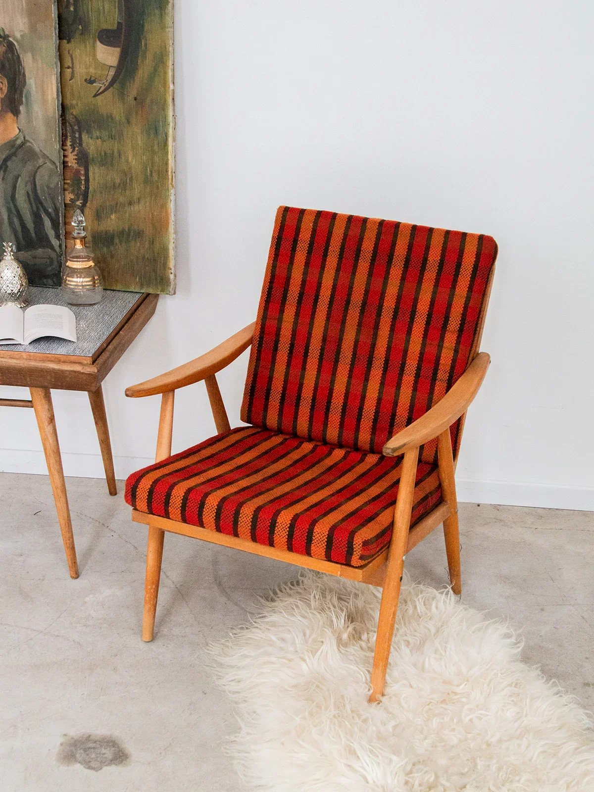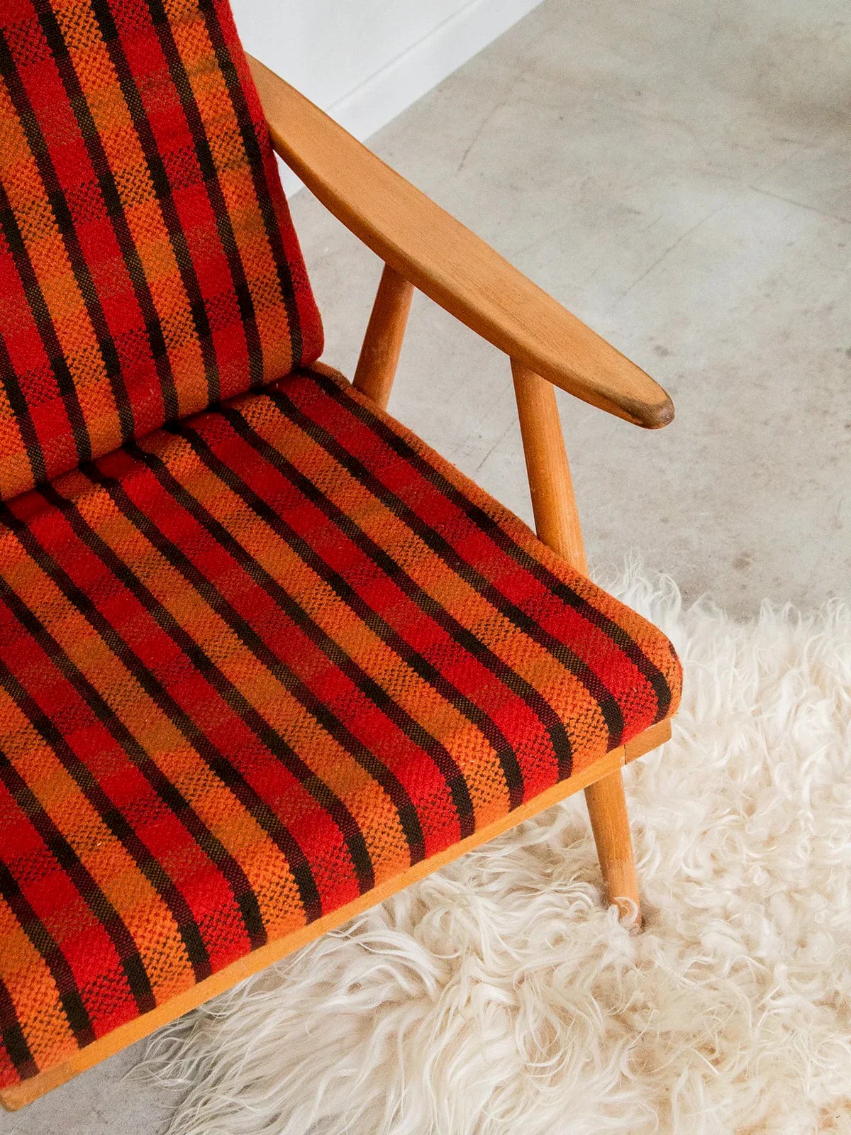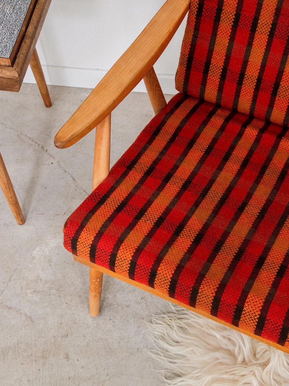 Apportez une touche rétro et chaleureuse à votre intérieur avec notre fauteuil à carreaux rouge. Sa structure en bois clair et ses pieds compas assurent une stabilité tout en ajoutant du caractère à votre décor. Les accotoirs plats et le confort de l'assise en tissu garantissent des moments de détente inoubliables. Parfait pour compléter un salon ou une salle à manger, ce fauteuil allie esthétique et fonctionnalité. Vendu à l'unité, deux quantités sont disponibles. Longueur : 60 cm Largeur : 60 cm Hauteur : 80 cm Hauteur d'assise : 42 cm Largeur de l'assise : 52 cm Profondeur de l'assise : 57 cm État:Occasion: Objet ayant été utilisé. Objet présentant quelques marques d'usure superficielle, ...Occasion: Objet ayant été utilisé. Objet présentant quelques marques d'usure superficielle, entièrement opérationnel et fonctionnant correctement. Il peut s'agir d'un modèle de démonstration ou d'un objet retourné en magasin après une courte période d'utilisation. les éventuelles imperfections. Couleur:Multicouleur Hauteur:Bois, Tissu Largeur:Fauteuils et chauffeuses Marque:Debongout Type:Produit chiné Matériau:Bois, Tissu Style:Contemporain