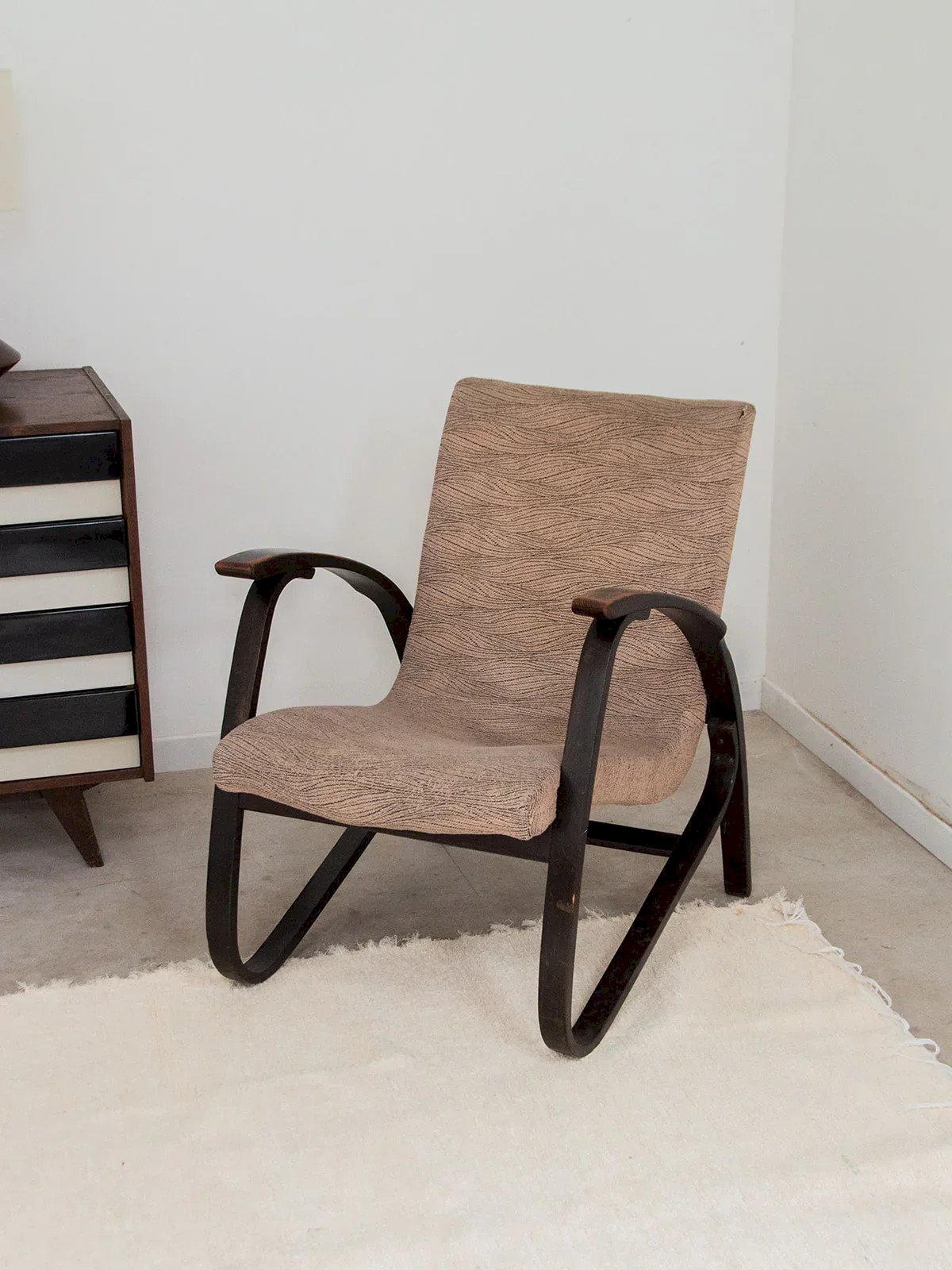 Découvrez ce fauteuil en bois foncé signé Jan Vanek, une pièce unique alliant confort et style. Bien que des traces d’usure sont présentes sur les accotoirs, son assise et son dossier en tissu continu beige/zébré apportent une touche d'élégance à votre intérieur. Idéal pour créer une ambiance chaleureuse, ce fauteuil s’intégrera parfaitement dans votre décoration. Offrez-vous un moment de détente dans ce mobilier au charme authentique. Longueur : 63 cm Largeur : 76 cm Hauteur : 79 cm Hauteur d'assise : 36 cm Largeur de l'assise : 49 cm Profondeur de l'assise : 47 cm État:Occasion: Objet ayant été utilisé. Objet présentant quelques marques d'usure superficielle, ...Occasion: Objet ayant été utilisé. Objet présentant quelques marques d'usure superficielle, entièrement opérationnel et fonctionnant correctement. Il peut s'agir d'un modèle de démonstration ou d'un objet retourné en magasin après une courte période d'utilisation. les éventuelles imperfections. Couleur:Multicouleur Hauteur:Bois, Tissu Largeur:Fauteuils et chauffeuses Marque:Debongout Type:Produit chiné Matériau:Bois, Tissu Style:Contemporain