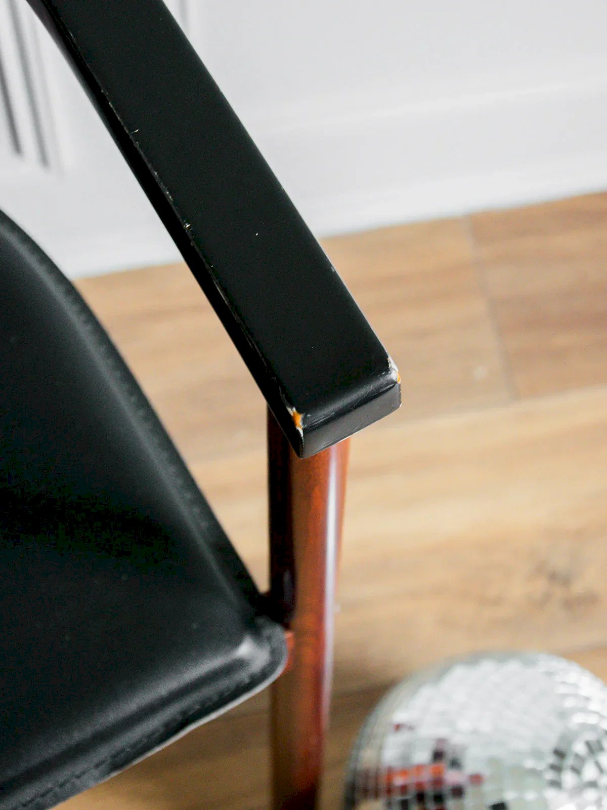 Découvrez ce fauteuil scandinave des années 1970, alliant élégance et confort. Son armature en bois, avec des accoudoirs et un dossier peint en noir d'origine, apporte une touche vintage à votre intérieur. L'assise en simili cuir offre un confort agréable et un entretien facile. Associez ce fauteuil à une table basse en bois brut ou en marbre pour un contraste harmonieux entre modernité et authenticité. Ce fauteuil est en parfait état, bien qu'il présente quelques éclats mineurs à l'arrière du dossier et sur les accoudoirs. Vendus séparément, deux exemplaires disponibles. Largeur : 54 cm Largeur d'assise : 46 cm Hauteur : 77 cm Hauteur d'assise : 45,5 cm Profondeur : 43 cm État:Occasion: Objet ayant été utilisé. Objet présentant quelques marques d'usure superficielle, ...Occasion: Objet ayant été utilisé. Objet présentant quelques marques d'usure superficielle, entièrement opérationnel et fonctionnant correctement. Il peut s'agir d'un modèle de démonstration ou d'un objet retourné en magasin après une courte période d'utilisation. les éventuelles imperfections. Couleur:Multicouleur Hauteur:Skaï, Bois Largeur:Fauteuils et chauffeuses Marque:Debongout Type:Produit chiné Matériau:Skaï, Bois Style:Contemporain