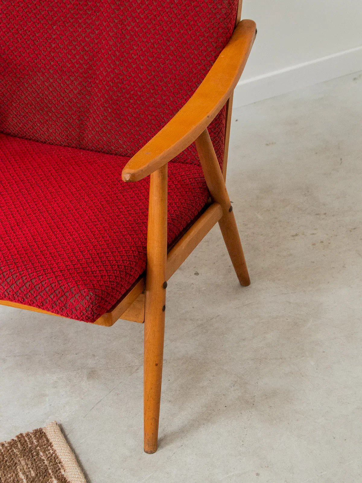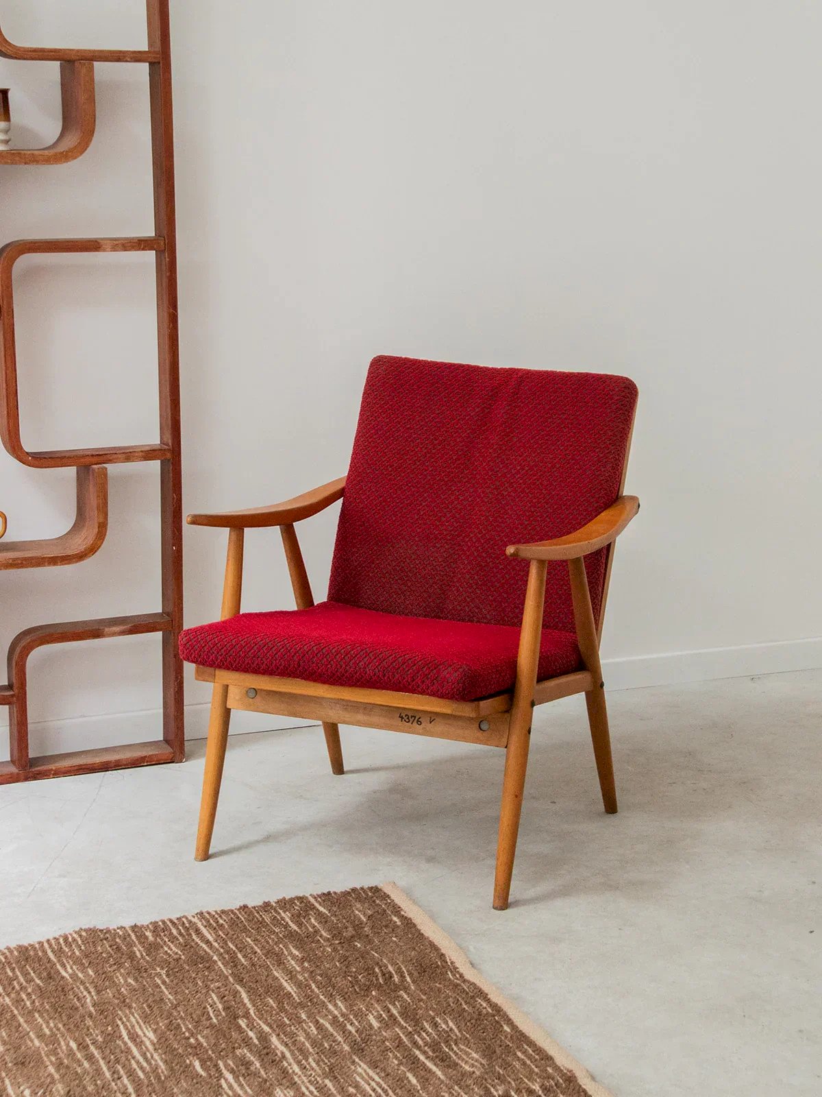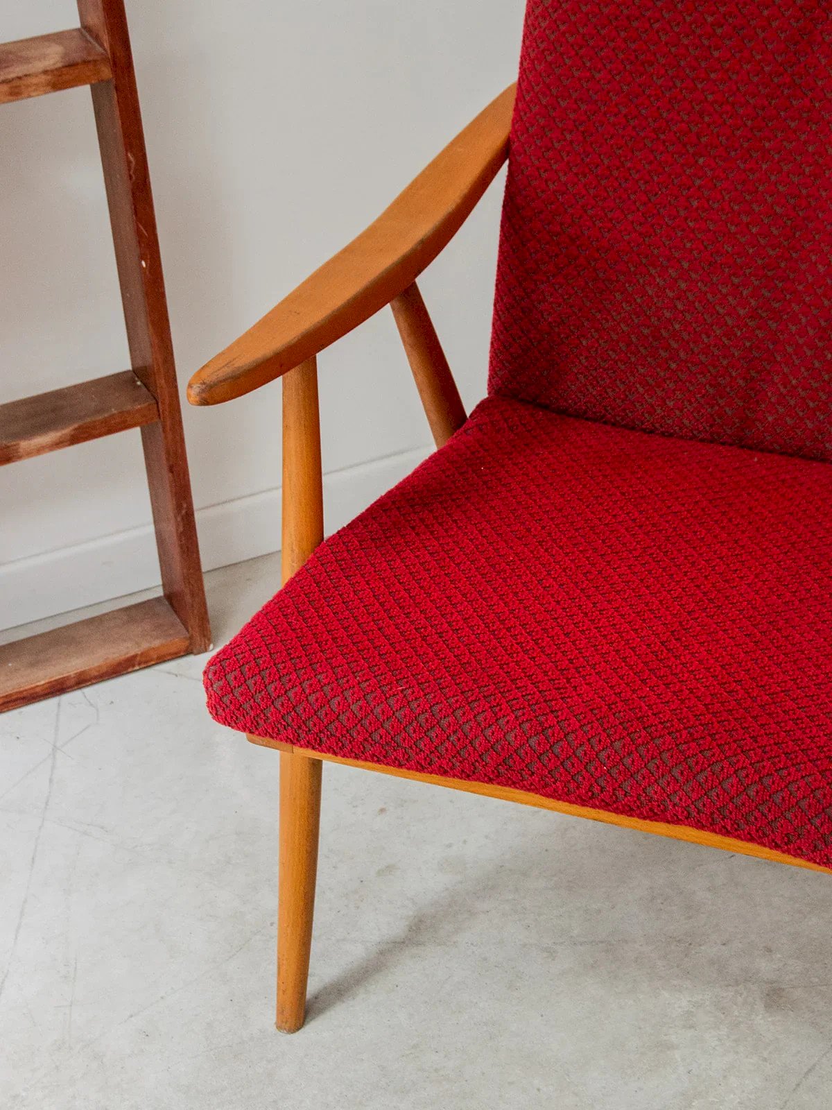 Ce fauteuil en bois clair séduit par ses lignes douces et son esprit rétro. Son assise et son dossier en tissu rouge apportent une touche chaleureuse et dynamique à votre intérieur. Le dossier incurvé, les accoudoirs enveloppants et les pieds compas typiques du design scandinave offrent à la fois confort et élégance. Une pièce pleine de caractère, parfaite pour sublimer un salon ou un coin lecture. Vendu à l'unité, 2 quantités sont disponibles. Longueur : 62 cm Largeur : 52 cm Hauteur : 75 cm Hauteur d'assise : 40 cm État:Occasion: Objet ayant été utilisé. Objet présentant quelques marques d'usure superficielle, ...Occasion: Objet ayant été utilisé. Objet présentant quelques marques d'usure superficielle, entièrement opérationnel et fonctionnant correctement. Il peut s'agir d'un modèle de démonstration ou d'un objet retourné en magasin après une courte période d'utilisation. les éventuelles imperfections. Couleur:Multicouleur Hauteur:Bois, Tissu Largeur:Fauteuils et chauffeuses Marque:Debongout Type:Produit chiné Matériau:Bois, Tissu Style:Contemporain