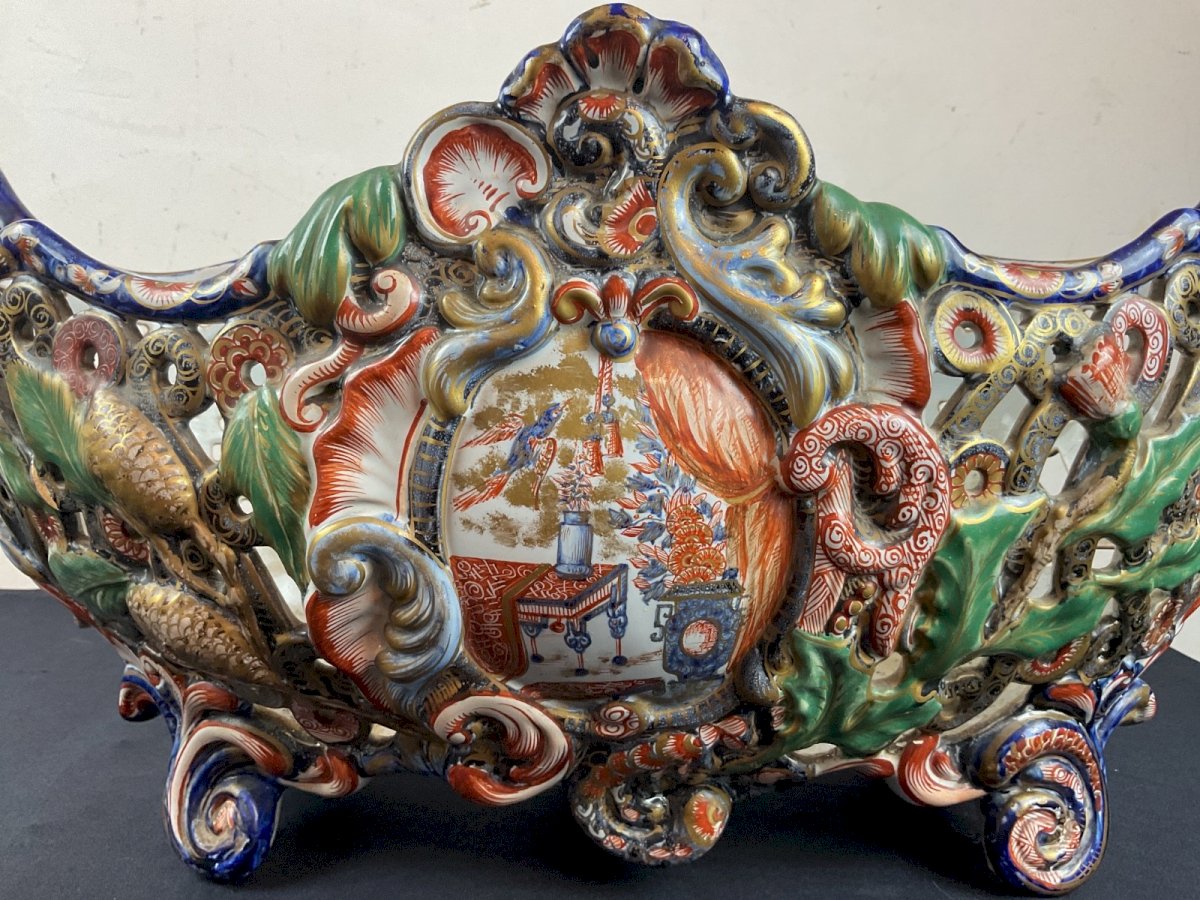Jardinier faïence céramique 1880 décor aux chinois  ( DLG= Dans le Goût) car pas vue de signature  Émile galle (1846 1904) Attention restauration à prévoir plusieurs photos disponibles  Longueur : 58 cm Largeur : 25 cm Hauteur : 23,5 cm Authenticité:Original Type:Art de la table, Cuisine Marque:Saint clément Origine:France Sous-type:jardiniere Matière:Faïence Style:art nouveau