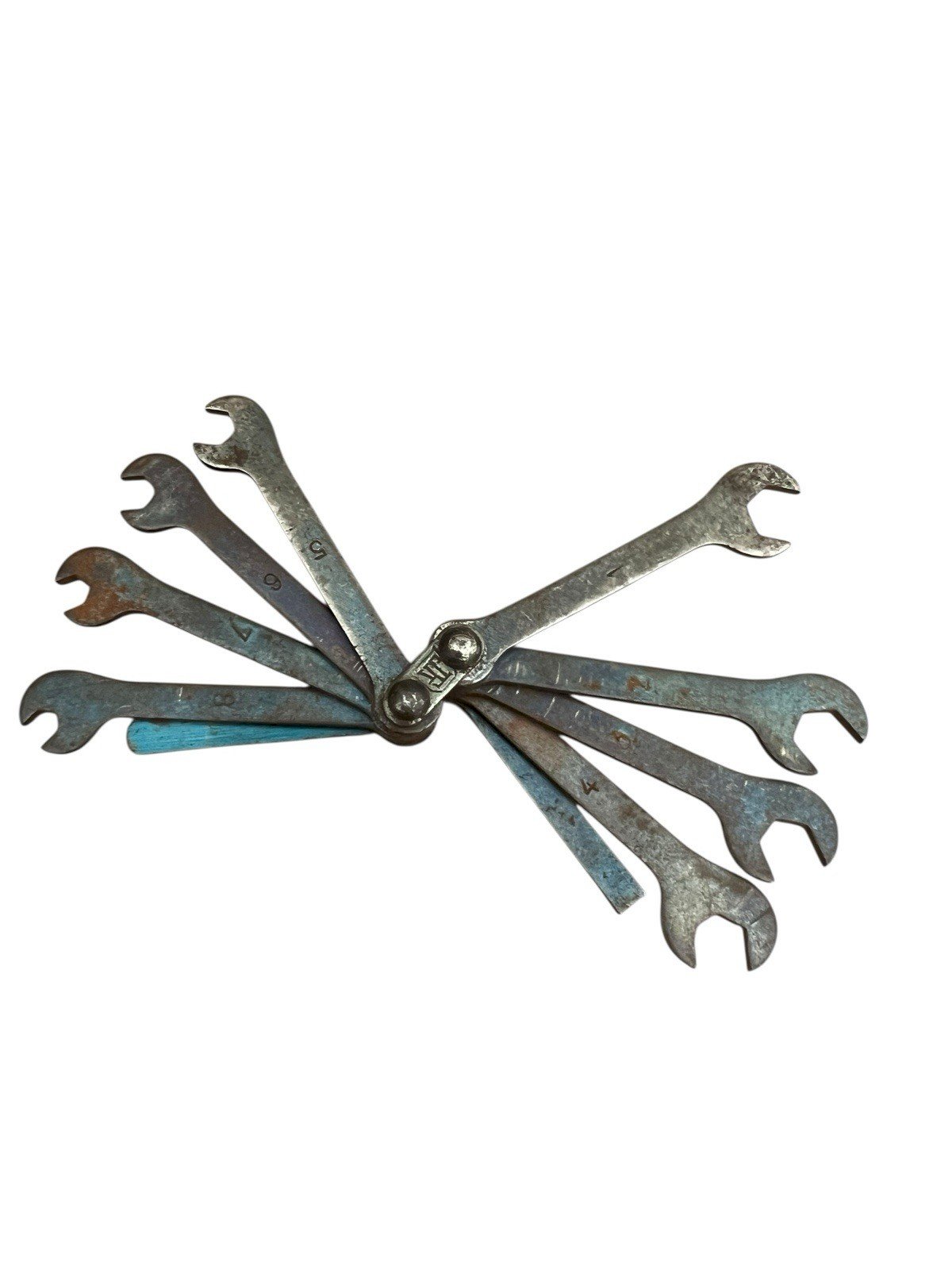 Jeu De Mini Clé À Molette Pliable 19E- Étui, Cuir-curiosité, collection miniature Rare outil de poche miniature antique fin XIXe siècle, jeu de clés à molette pliable, avec étui en cuir Mettez la main sur cet objet de curiosité datant de la fin du XIXe siècle. Il s'agit d'un jeu de clés à molette miniatures pliables, logé dans son étui d'origine en cuir marron, magnifiquement patiné par le temps. Cet outil ingénieux et compact s'ouvre pour révéler plusieurs clés de différentes tailles, toutes articulées sur un axe central. Il porte une petite initiale du fabricant, ce qui en fait un objet de collection encore plus précieux pour les amateurs d'histoire et de mécanique ancienne. L'état général est bon pour son âge, avec une patine authentique qui témoigne de son histoire. C'est un véritable témoignage de l'ingéniosité de l'époque et un ajout remarquable à toute collection d'outils anciens, d'objets miniatures ou de curiosités. * État : Usé par le temps, patine authentique. L'étui en cuir présente des signes d'usure, mais est intact. * Période : Fin XIXe siècle. * Marque : Initiales de la manufacture visiblesJR * Contenu : 1 jeu de clés pliables, 1 étui en cuir. * Dimensions environ 7,8 cm de long pour 3,5 cm de large dans sa pochette Authenticité:Original Type:Objet de métier Origine:France Sous-type:Étui Matière:Metal Style:Antiquité