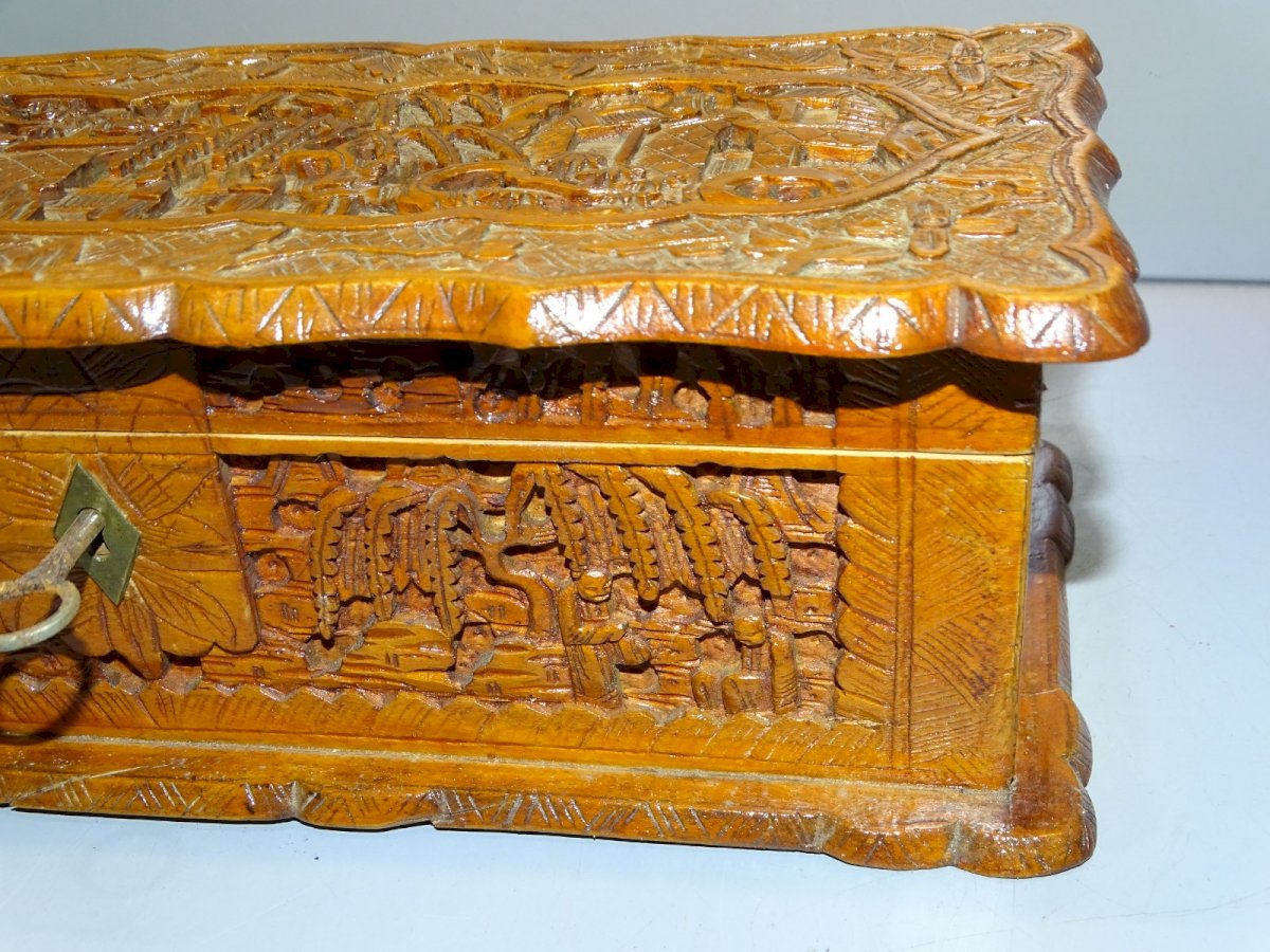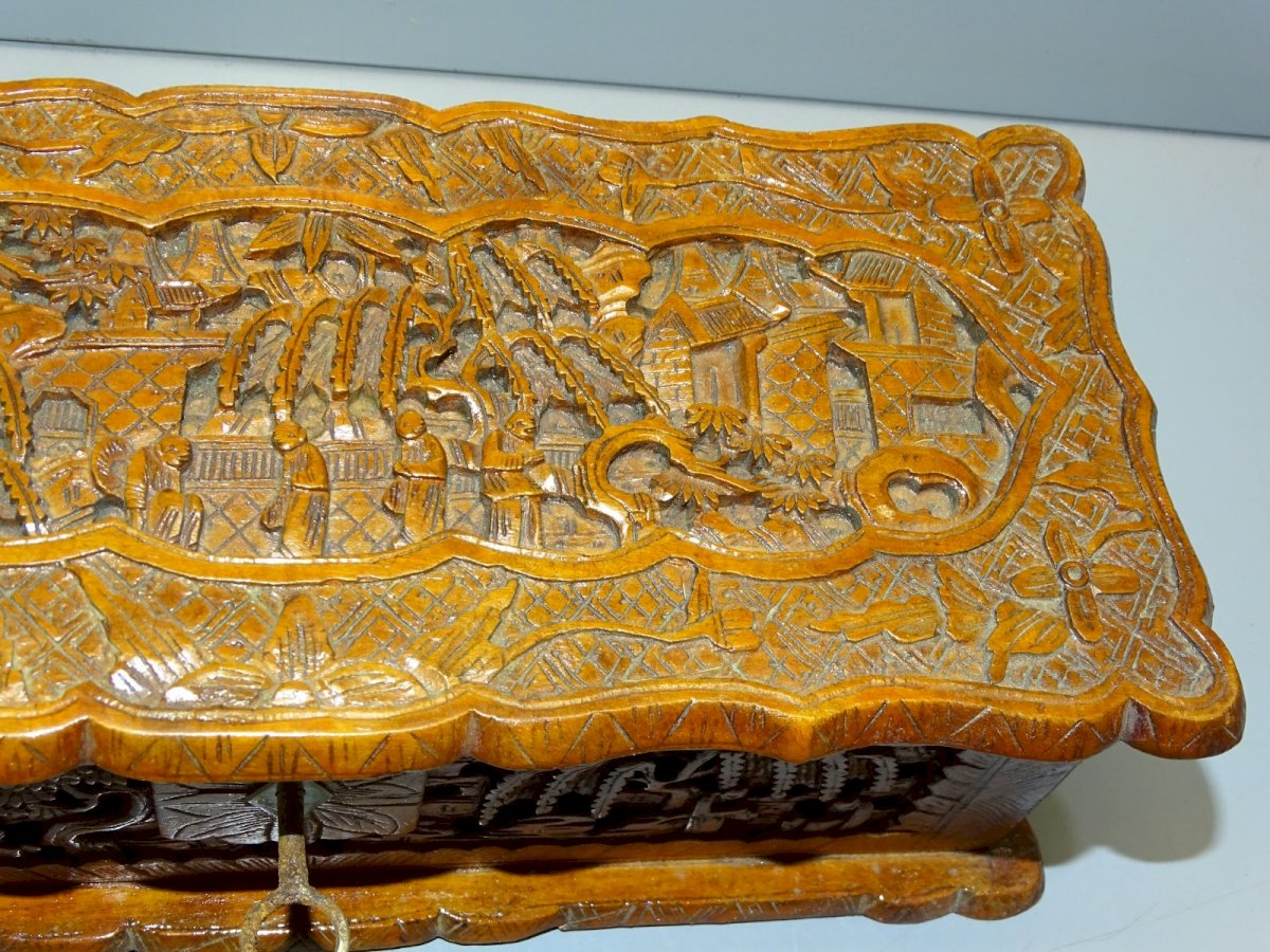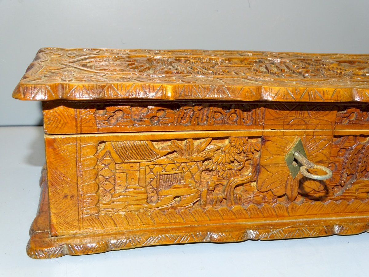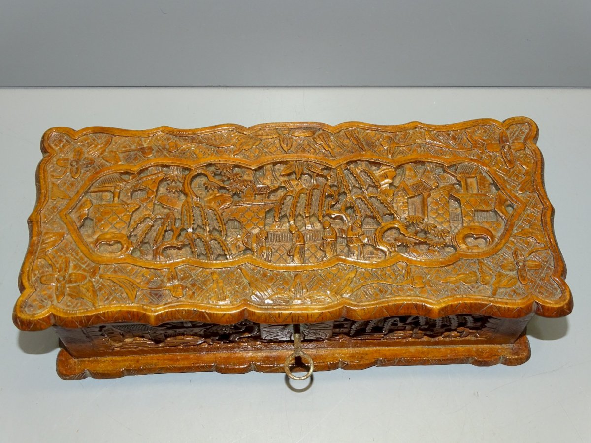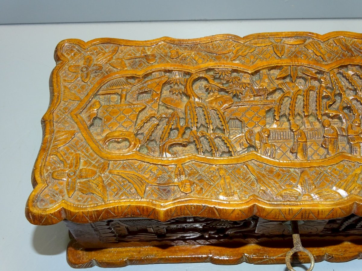 Joli ancien coffret, boite à gants en bois sculpté scènes asiatiques - intérieur tissu bleu - manque partie haute de la serrure - avec sa clé ( rouillée ) ( Voir photos) - en bel état d'usage - dans son état de trouvailles - jus de grenier - Réf. 1V240718/447 26,7 x 11,6 cm 8,3 cm - Hauteur poids 500 g - Pour toutes questions : EXPEDITION POSSIBLE EN MONDIAL RELAY ou COLISSIMO sur demande TRES BON EMBALLAGE GARANTI MERCI de BIEN REGARDER TOUTES les PHOTOS car ELLES FONT PARTIE INTEGRANTE de la DESCRIPTION et PERMETTENT de VOIR l'OBJET AU MIEUX avec SES PETITS DEFAUTS EVENTUELS -