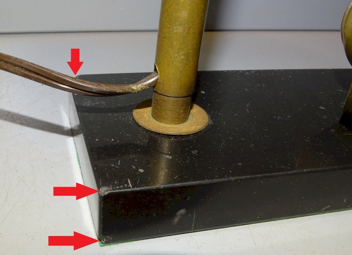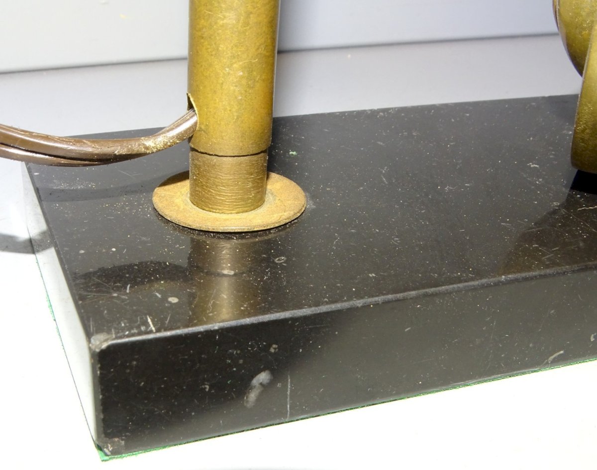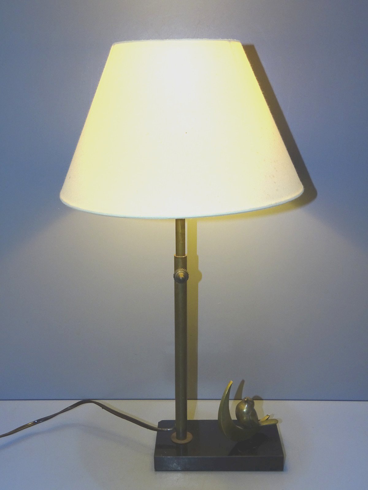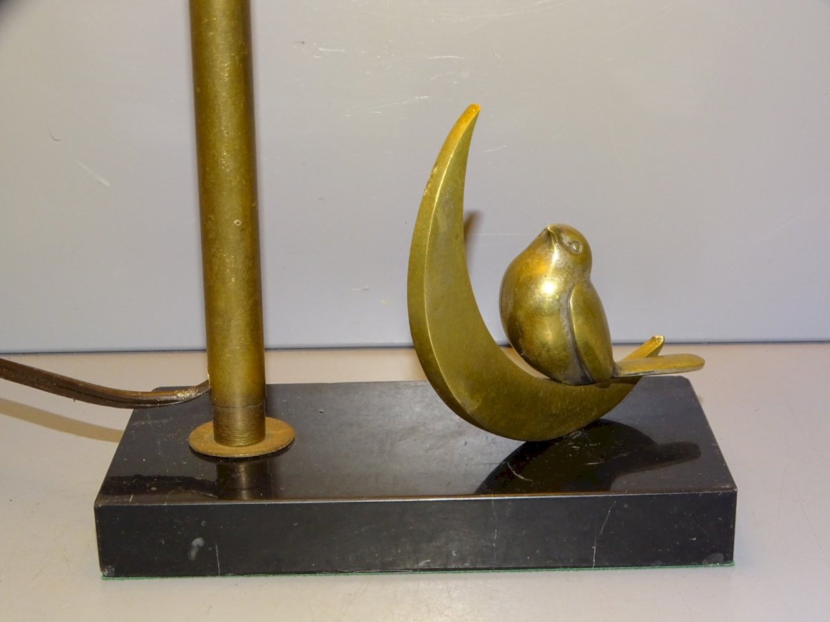 Joli pied de lampe socle marbre noir avec un oiseau en bronze ( marqué bronze ) posé sur un quart de lune - à signaler petits éclats sur les angles du marbre - l'abat jour est juste là pour l'illustration, ne sera pas expédié avec car a de nombreuses tâches  ( voir photos ) - jus de trouvailles,  sortie de grenier, en très bon état d'usage  -  Réf.42141025/11  -  Hauteur 43,5 cm avec abat jour - Hauteur légèrement réglable max 38,5 cm et 35,5 cm mini - socle 14,7 x 7,5 cm -   Poids 1,280 kg   -   EXPEDITION en Mondial Relay OU Colissimo possible sur demande   EMBALLAGE GARANTI très protecteur  MERCI de BIEN REGARDER TOUTES les PHOTOS car ELLES FONT PARTIE INTEGRANTE de la DESCRIPTION et PERMETTENT de VOIR l'OBJET AU MIEUX -