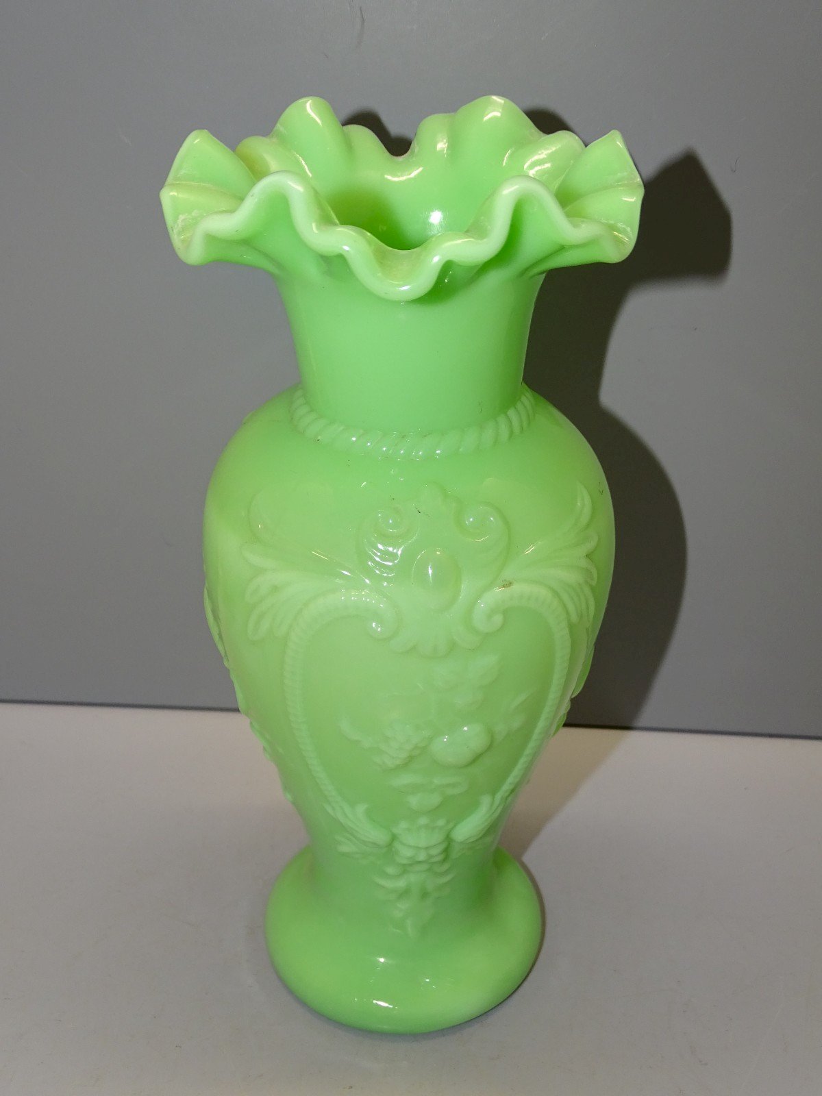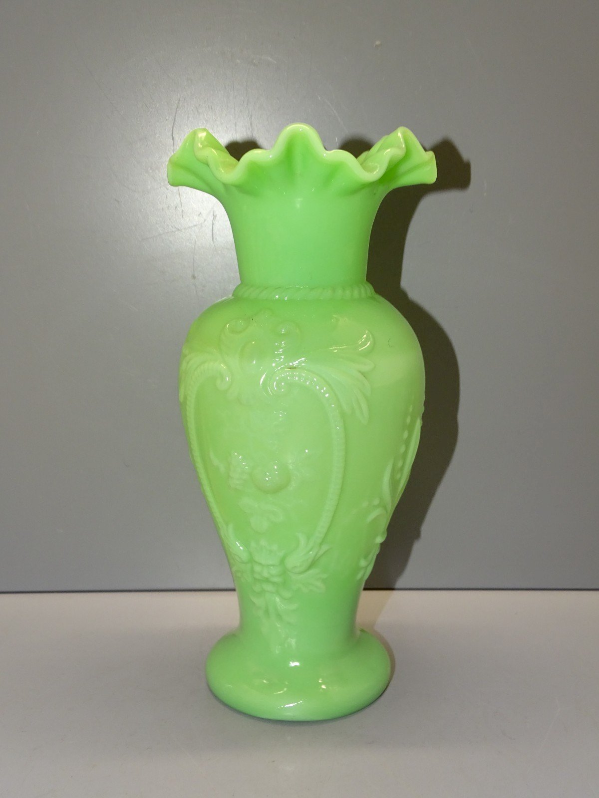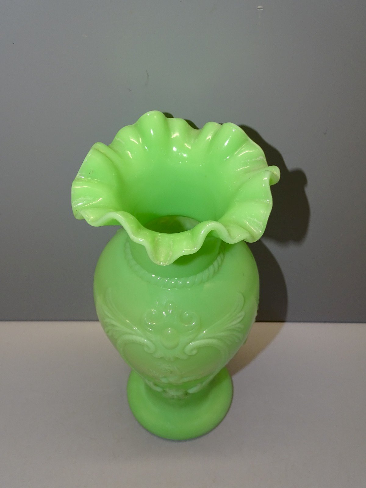 Joli ancien vase en opaline de foire de couleur verte ( no ouraline ) avec un joli décor en épaisseur de volutes, mascarons - joli col volanté - ( voir photos ) - En bon état d'usage - Réf: 1V251219/34  - Hauteur 23 cm - Diamètre col 10 cm - Diamètre max 10 cm - Poids 0,530 kg -   Pour toutes questions :  EXPEDITION POSSIBLE EN MONDIAL RELAY ou COLISSIMO sur demande TRES BON EMBALLAGE GARANTI       MERCI de BIEN REGARDER TOUTES les PHOTOS car ELLES FONT PARTIE INTEGRANTE de la DESCRIPTION et PERMETTENT de VOIR l'OBJET AU MIEUX  avec SES PETITS DEFAUTS EVENTUELS -