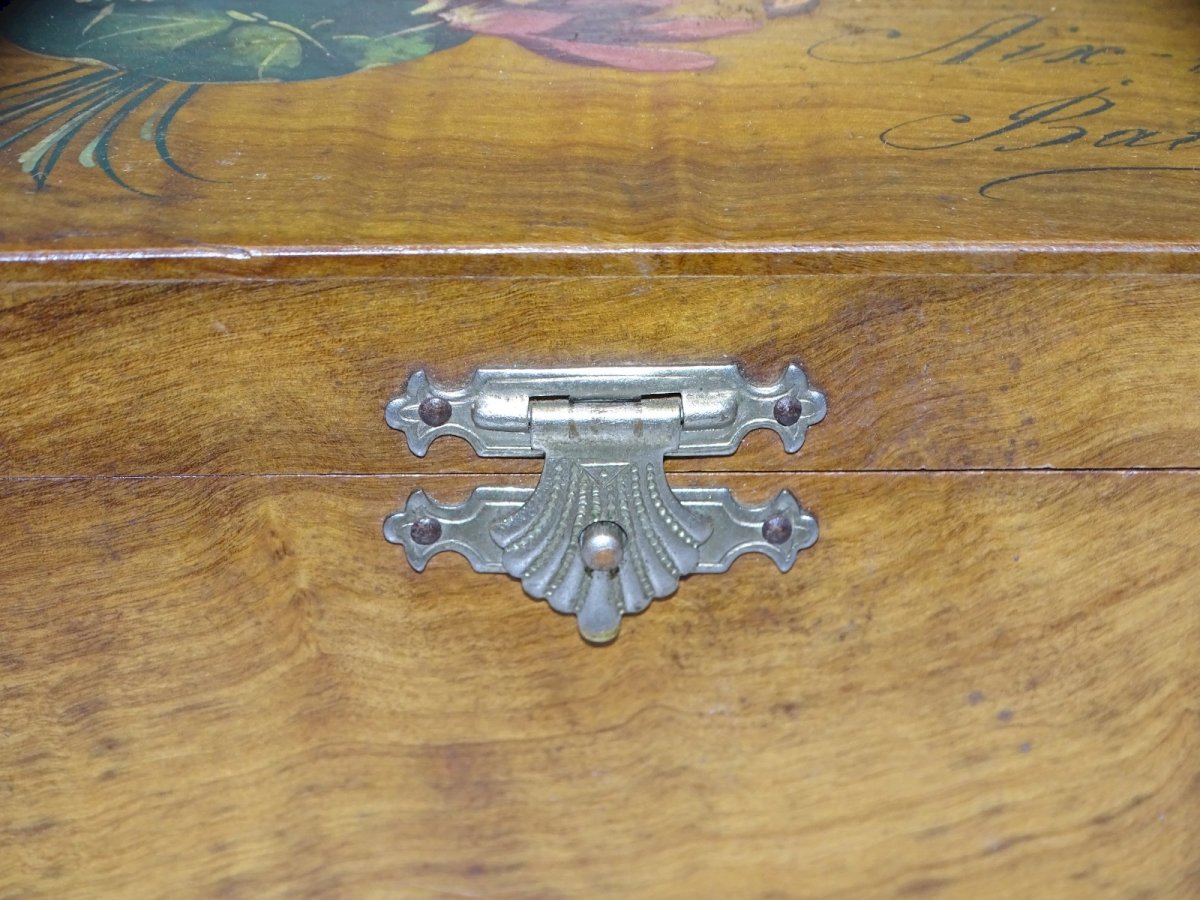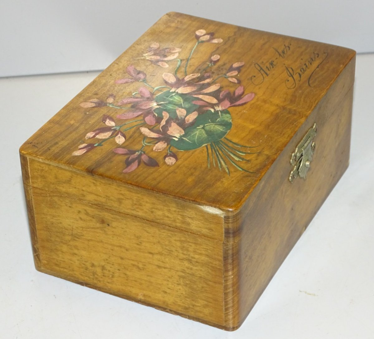 Jolie Boite coffret à bijoux en olivier massif, souvenir d'AIX les BAINS avec un joli décor de bouquet de violettes - intérieur capitonné couleur parme - joli fermoir - dans son jus de trouvailles, avec un petit frottement bord extérieur couvercle et quelques petites traces sur le couvercle - état sorti de grenier - Ref: 1V250703/170 -   - Hauteur  6,8 cm - Longueur 14,8 cm - Largeur 10,8 cm -  poids 0,280 Kg                                         EXPEDITION en Mondial relay ou Colissimo sur demande    EMBALLAGE GARANTI très protecteur MERCI de BIEN REGARDER TOUTES les PHOTOS car ELLES FONT PARTIE INTEGRANTE de la DESCRIPTION et PERMETTENT de VOIR l'OBJET AU MIEUX  avec SES PETITS DEFAUTS EVENTUELS - Authenticité:Original Type:Objet de vitrine, Décoratif Origine:France Période:Design du XXème Sous-type:Coffret Matière:Bois Style:1900