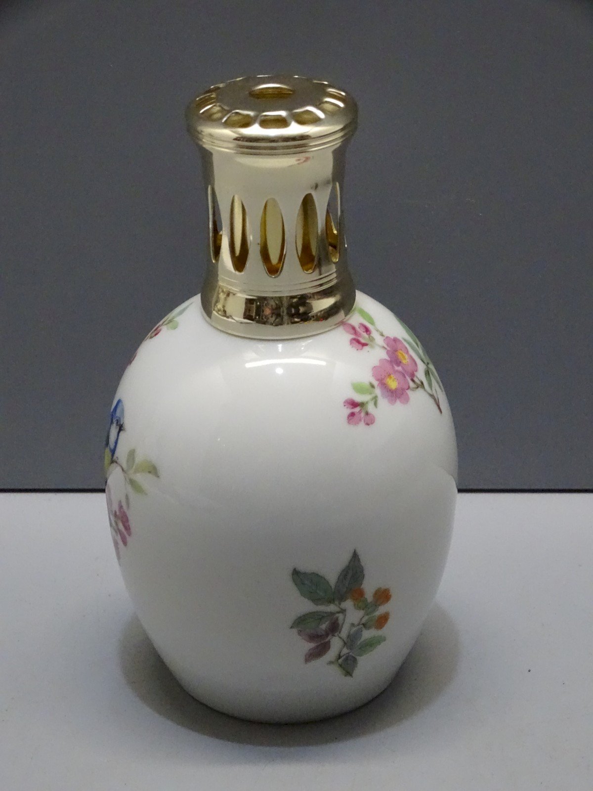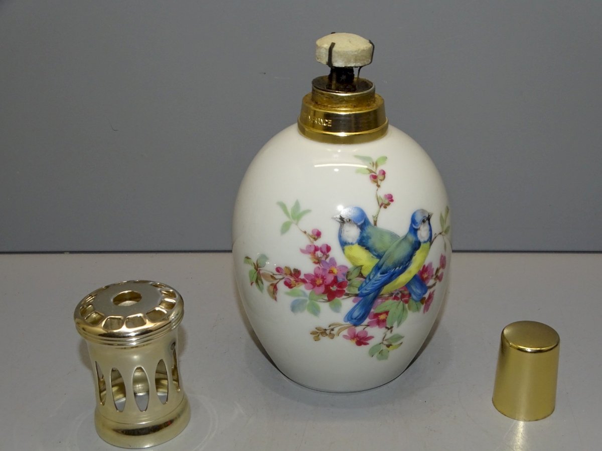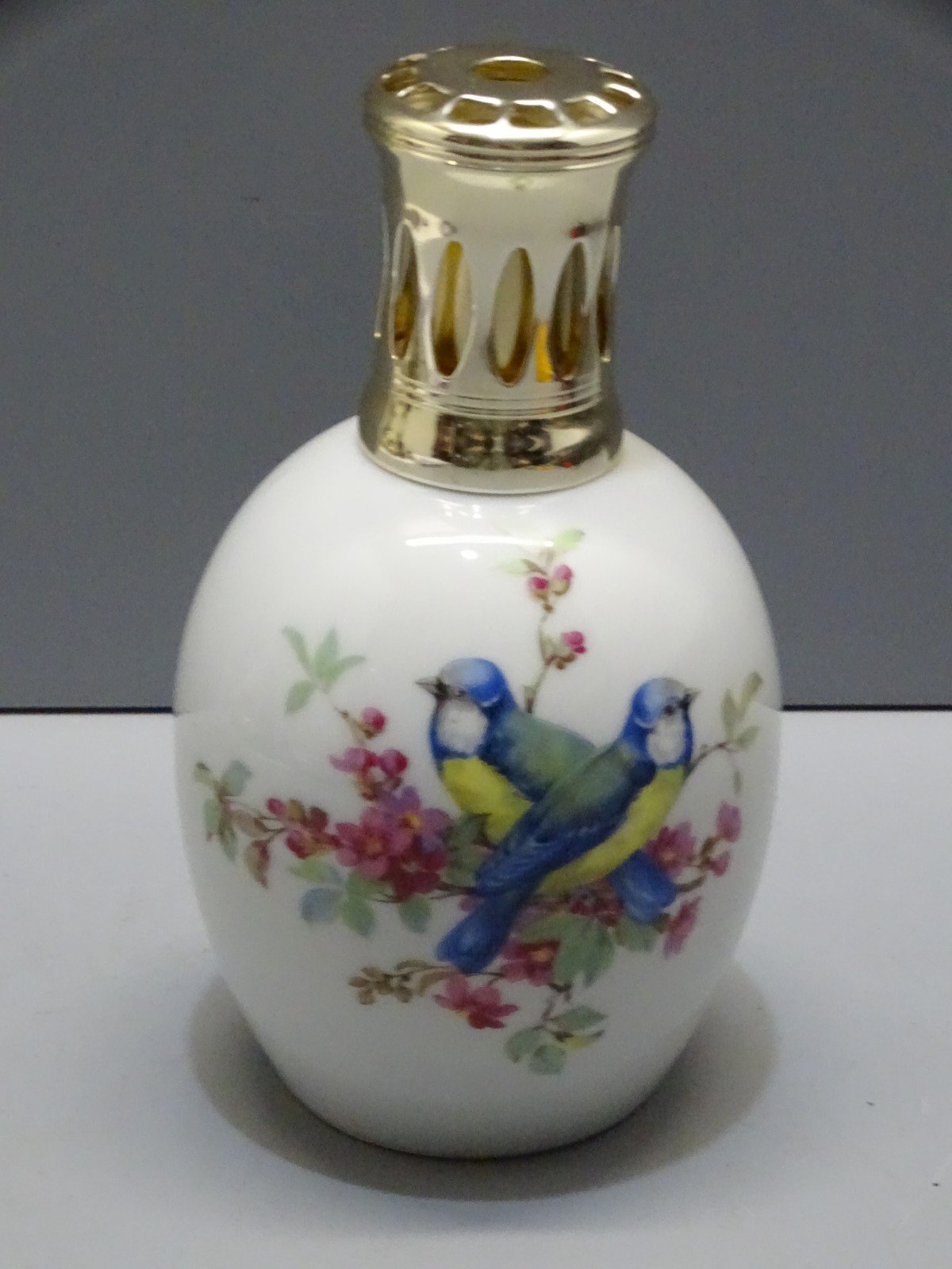 -JOLIE LAMPE BERGER PORCELAINE LIMOGES Déco PETITES MESANGES BLEUES FLEURS D