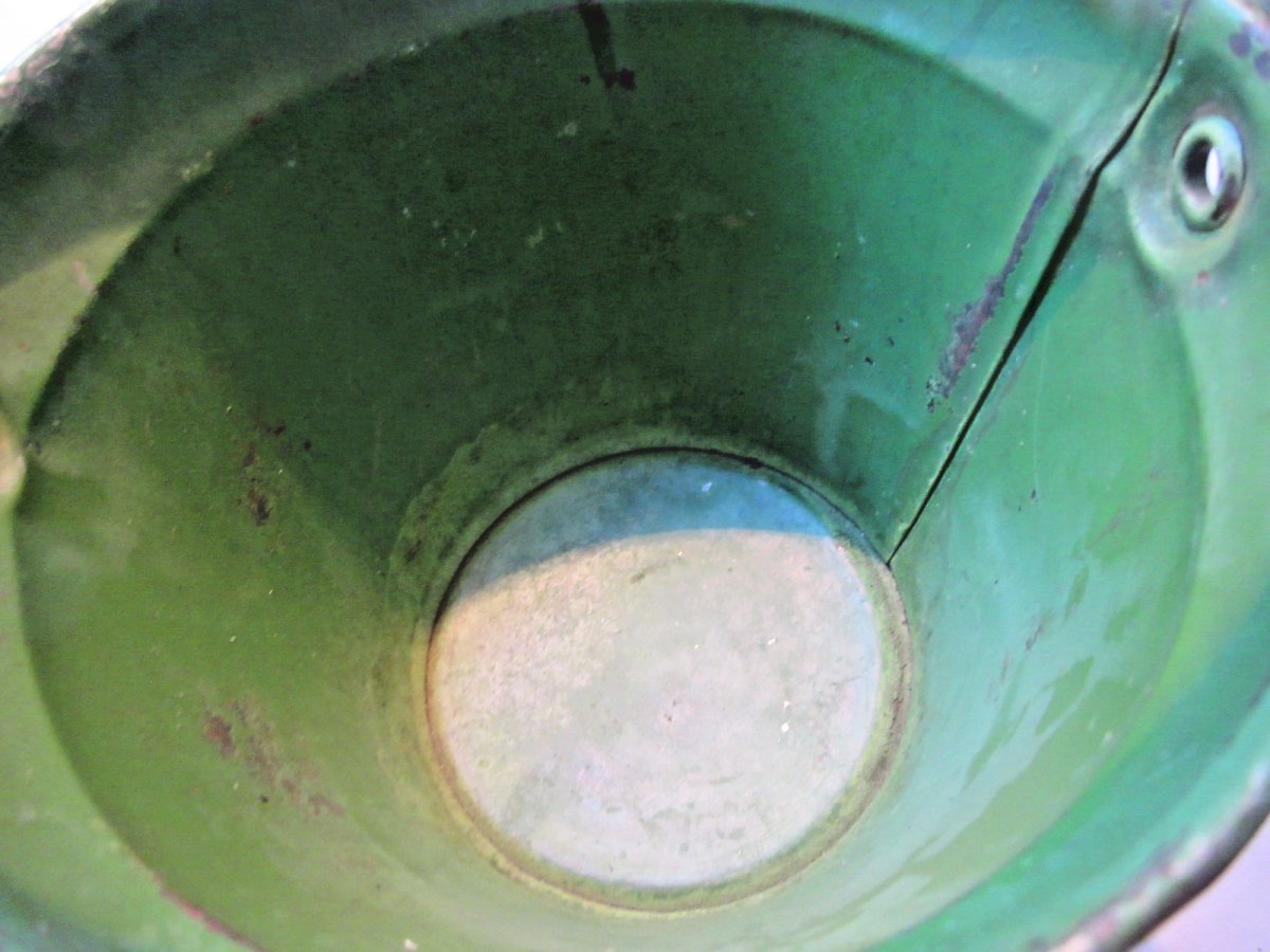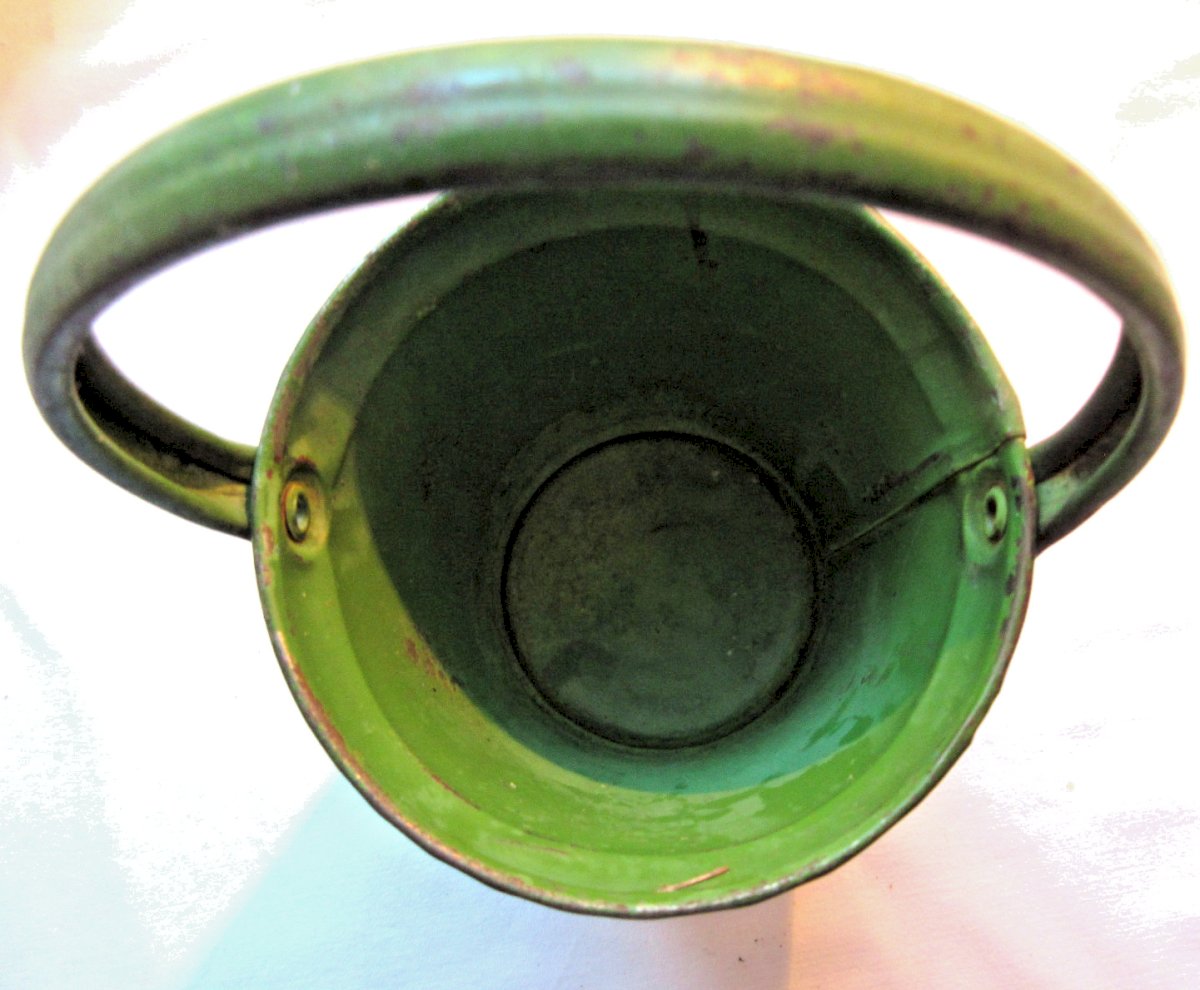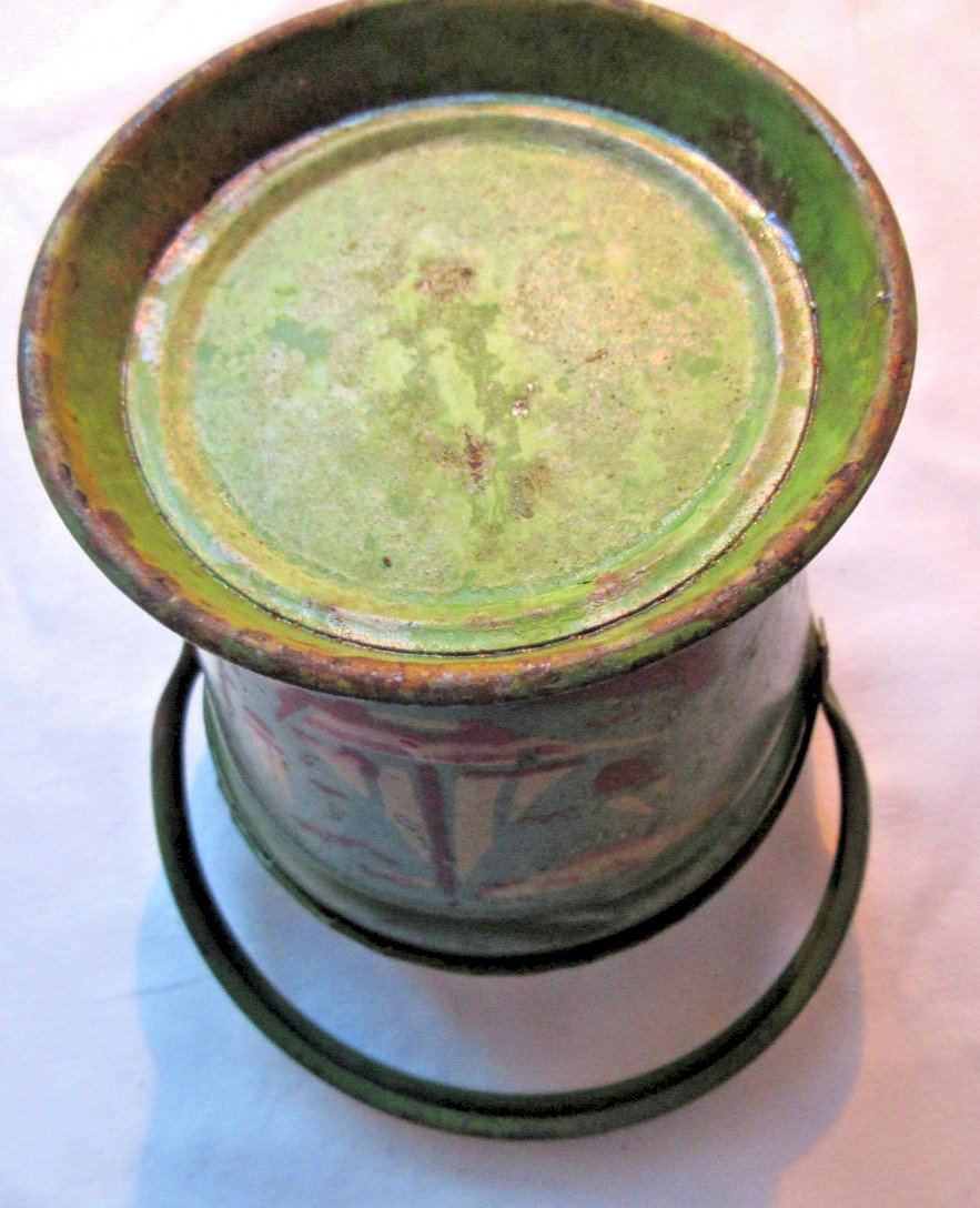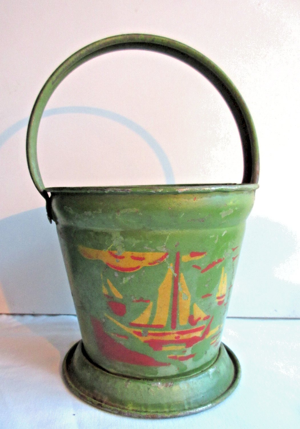 Jouet de plage vers 1950, seau vert en tôle décoré d'un bateau jaune et rouge