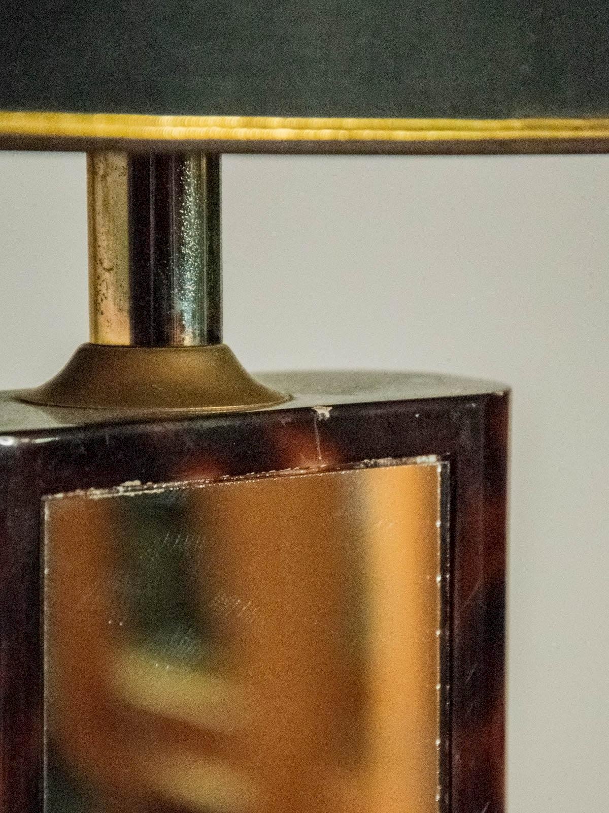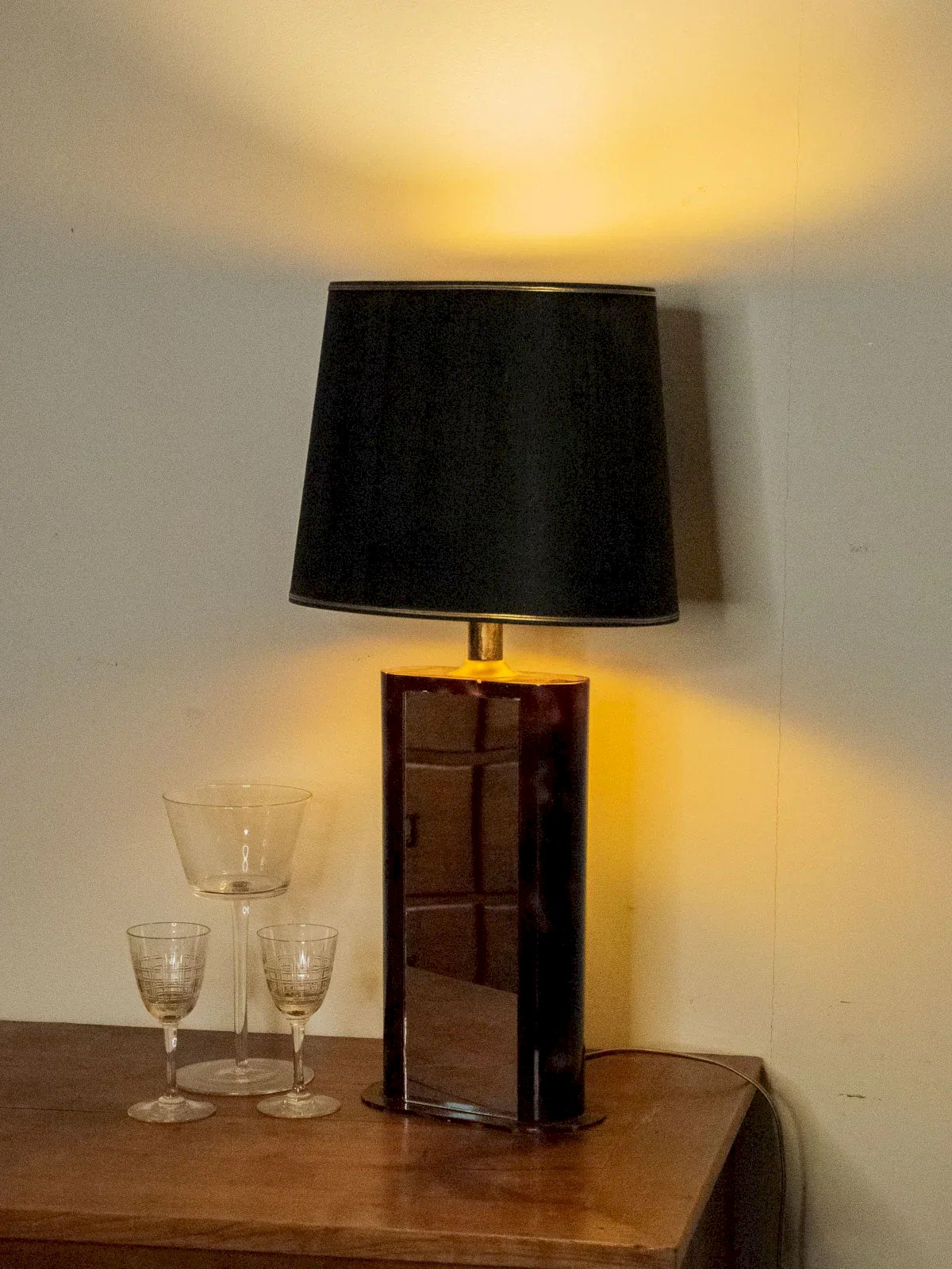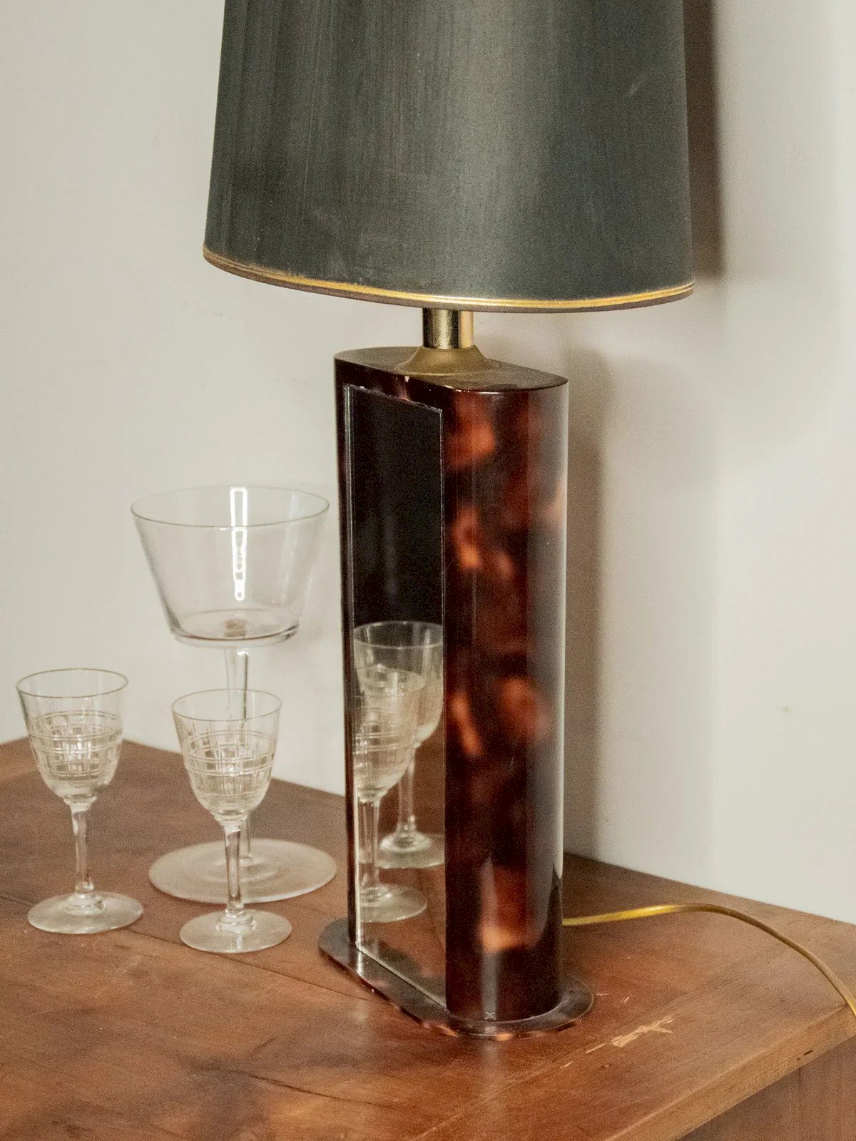 Découvrez cette lampe à poser des années 70 en résine plastique et métal doré, au design rétro-chic qui apporte une touche chaleureuse et élégante à tout intérieur. Son abat-jour d'époque diffuse une lumière douce et enveloppante, tandis que la base à l'aspect chaud et organique offre une présence stable et des proportions adaptées à un chevet, une console ou un bureau. La restauration a intégré un miroir subtilement ajouté qui multiplie la lumière et joue avec les reflets pour une mise en scène raffinée. Largeur du pied de lampe : 16 cm Hauteur avec abat-jour : 58,5 cm Hauteur du pied de lampe : 42 cm Diamètre minimum de l'abat-jour : 23,5 cm Diamètre maximum de l'abat-jour : 28,5 cm État:Occasion: Objet ayant été utilisé. Objet présentant quelques marques d'usure superficielle, ...Occasion: Objet ayant été utilisé. Objet présentant quelques marques d'usure superficielle, entièrement opérationnel et fonctionnant correctement. Il peut s'agir d'un modèle de démonstration ou d'un objet retourné en magasin après une courte période d'utilisation. les éventuelles imperfections. Marque:Debongout Type:Produit chiné Vintage:Oui Style:Contemporain