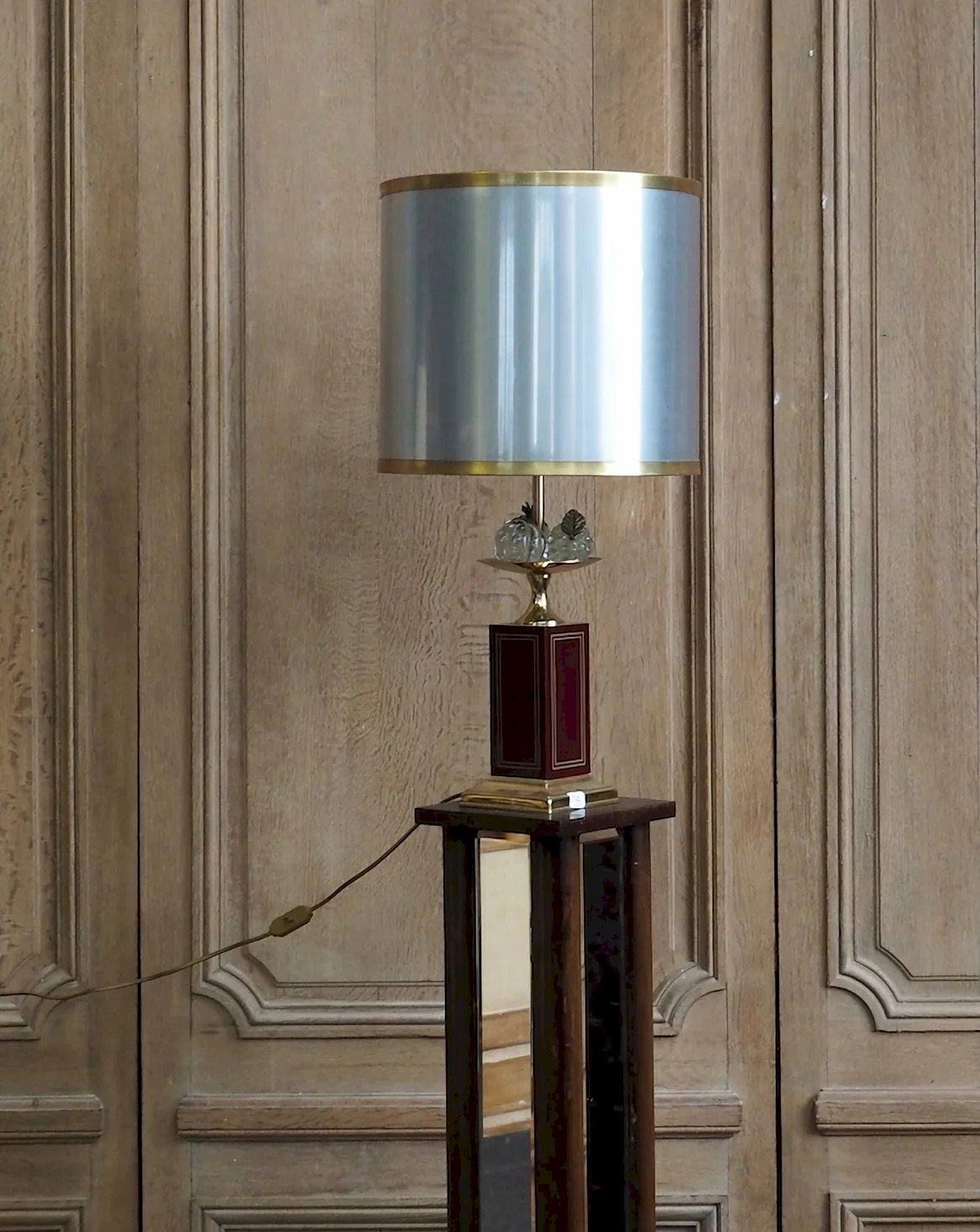 Adoptez cette lampe au corps en plastique effet métal, soulignée d'un bandeau et d'une base en laiton, qui puise son inspiration dans le style Maison Charles. Les fruits en verre et l'abat-jour généreux en mélaminé rouge offrent un jeu de matières et une lumière douce, ses proportions élancées la destinent à une console, une bibliothèque ou un coin lecture. Le mariage du métal, du laiton et du verre crée une ambiance chaleureuse et élégante. Hauteur totale : 74 cm Mesures de l'abat-jour : Diamètre : 38 cm Hauteur : 34 cm État:Occasion: Objet ayant été utilisé. Objet présentant quelques marques d'usure superficielle, ...Occasion: Objet ayant été utilisé. Objet présentant quelques marques d'usure superficielle, entièrement opérationnel et fonctionnant correctement. Il peut s'agir d'un modèle de démonstration ou d'un objet retourné en magasin après une courte période d'utilisation. les éventuelles imperfections. Marque:Debongout Type:Produit chiné Vintage:Oui Style:Contemporain