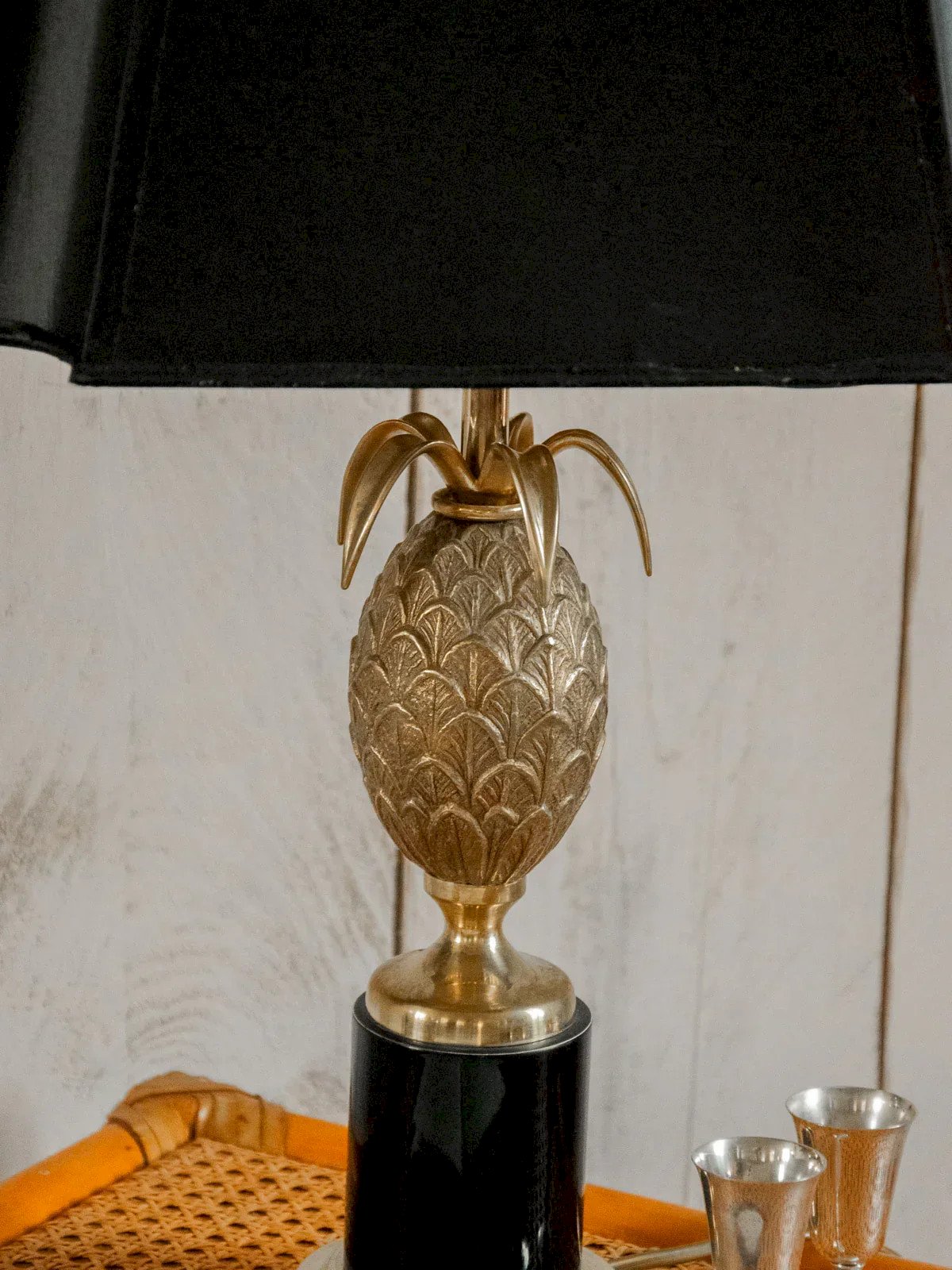 Sublimez votre intérieur avec ce pied de lampe ananas au style Hollywood Regency, sculpté en bronze doré et couronné d’un abat-jour noir. Sa silhouette raffinée apporte une présence affirmée et un charme vintage-chic, idéale pour mettre en scène une console, un salon ou une chambre. Le contraste entre le métal doré et le tissu sombre sublime la lumière pour une atmosphère chaleureuse et théâtrale, tandis que ses proportions équilibrées en font une pièce à la fois décorative et fonctionnelle. Longueur : 35 cm Largeur : 24,5 cm Hauteur : 58,5 cm Diamètre base : 11 cm État:Occasion: Objet ayant été utilisé. Objet présentant quelques marques d'usure superficielle, ...Occasion: Objet ayant été utilisé. Objet présentant quelques marques d'usure superficielle, entièrement opérationnel et fonctionnant correctement. Il peut s'agir d'un modèle de démonstration ou d'un objet retourné en magasin après une courte période d'utilisation. les éventuelles imperfections. Marque:Debongout Type:Produit chiné Vintage:Oui Style:Contemporain