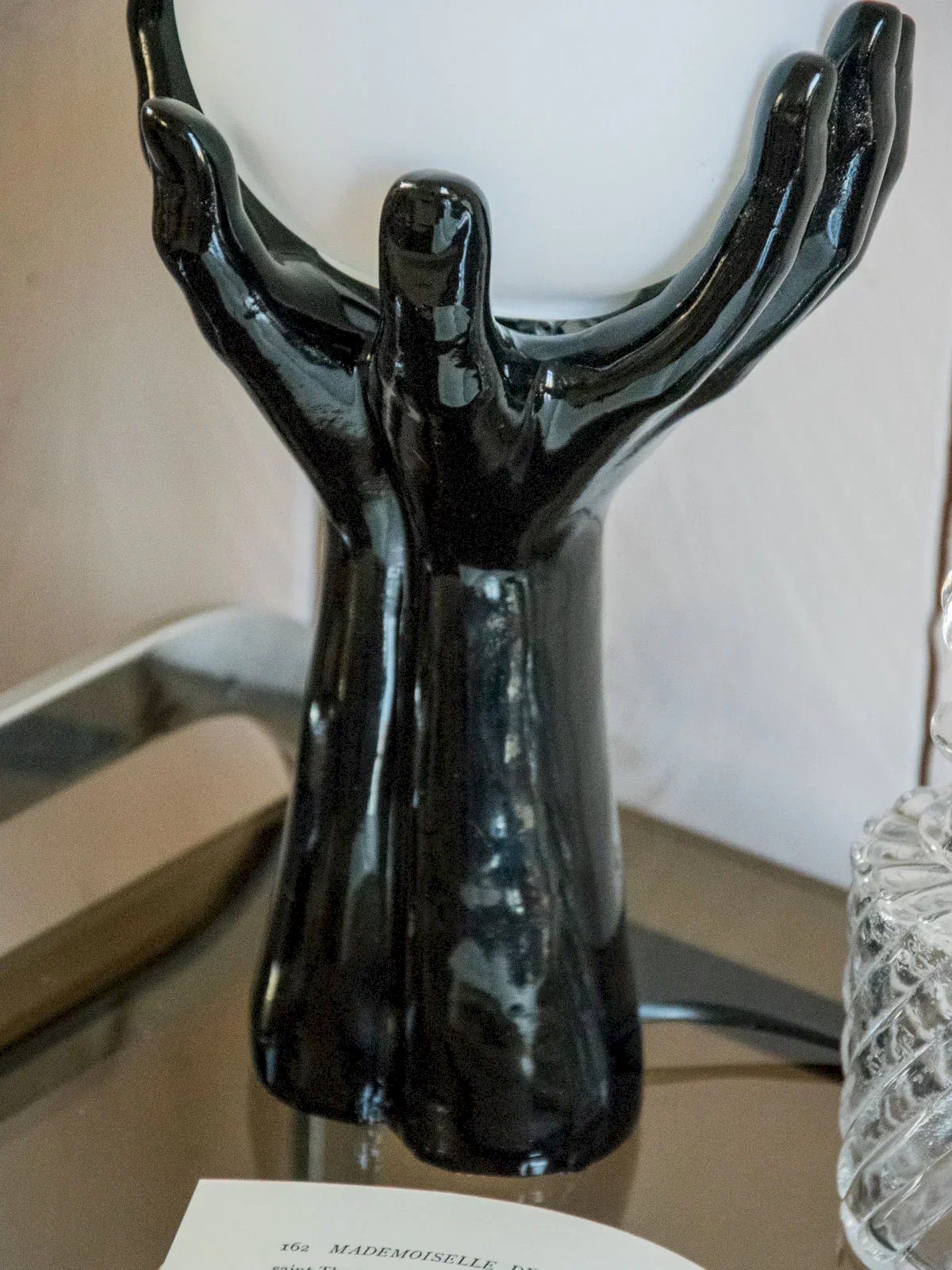 Découvrez cette lampe sculpturale où une structure en céramique noire, stylisée en forme de mains, soutient un globe blanc opaline qui diffuse une lumière douce et enveloppante. Son design à la fois graphique et élégant s'intègre aussi bien sur une table de chevet que posée sur un bureau ou une console, apportant une touche d'originalité maîtrisée. Les contrastes de matières créent une ambiance chaleureuse et contemporaine, idéale pour éclairer un coin lecture ou sublimer un salon. Longueur : 18 cm Largeur : 20 cm Hauteur : 35 cm État:Occasion: Objet ayant été utilisé. Objet présentant quelques marques d'usure superficielle, ...Occasion: Objet ayant été utilisé. Objet présentant quelques marques d'usure superficielle, entièrement opérationnel et fonctionnant correctement. Il peut s'agir d'un modèle de démonstration ou d'un objet retourné en magasin après une courte période d'utilisation. les éventuelles imperfections. Marque:Debongout Type:Produit chiné Vintage:Oui Style:Contemporain
