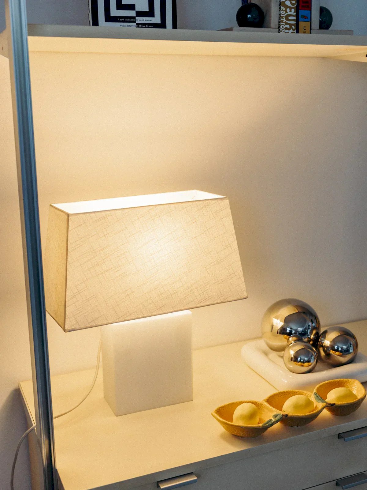Ajoutez une note lumineuse et raffinée avec cette lampe en verre blanchi et son abat-jour rectangulaire en toile beige. Dotée de deux interrupteurs et d'une variation d'intensité, elle permet de moduler l'éclairage selon l'ambiance désirée. Le verre blanchi diffuse une lumière douce et veloutée tandis que l'abat-jour beige habille l'espace d'une élégance sobre. Son format aux proportions équilibrées la rend idéale sur une console, une table de chevet ou un bureau, apportant une atmosphère chaleureuse et contemporaine. Longueur de l'abat-jour : 40 cm Largeur de l'abat-jour : 20 cm Longueur du pied : 18 cm Largeur du pied : 10 cm Hauteur : 45 cm État:Occasion: Objet ayant été utilisé. Objet présentant quelques marques d'usure superficielle, ...Occasion: Objet ayant été utilisé. Objet présentant quelques marques d'usure superficielle, entièrement opérationnel et fonctionnant correctement. Il peut s'agir d'un modèle de démonstration ou d'un objet retourné en magasin après une courte période d'utilisation. les éventuelles imperfections. Marque:Debongout Type:Produit chiné Vintage:Oui Style:Contemporain