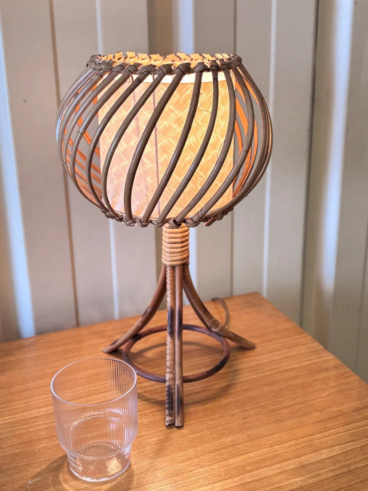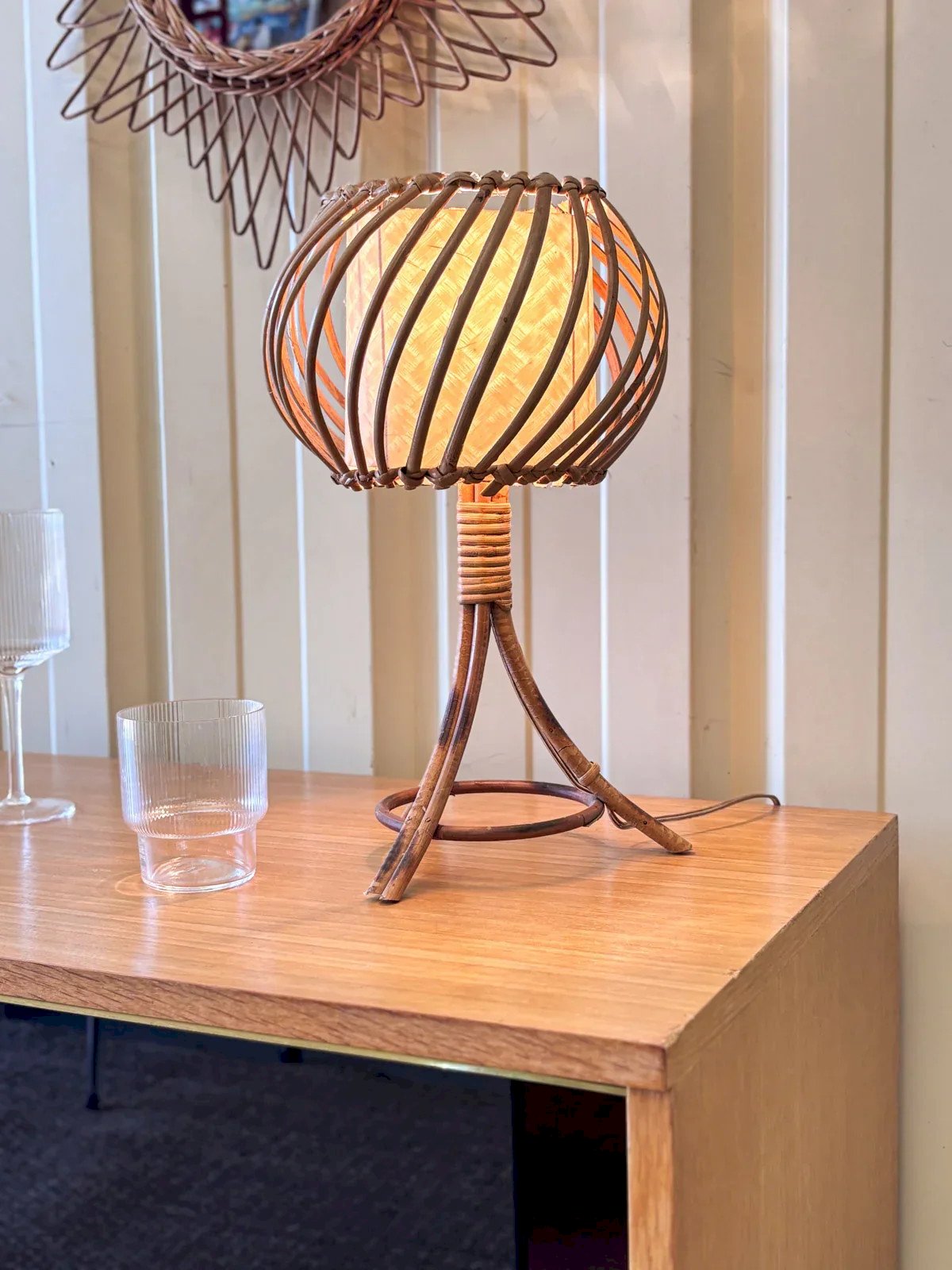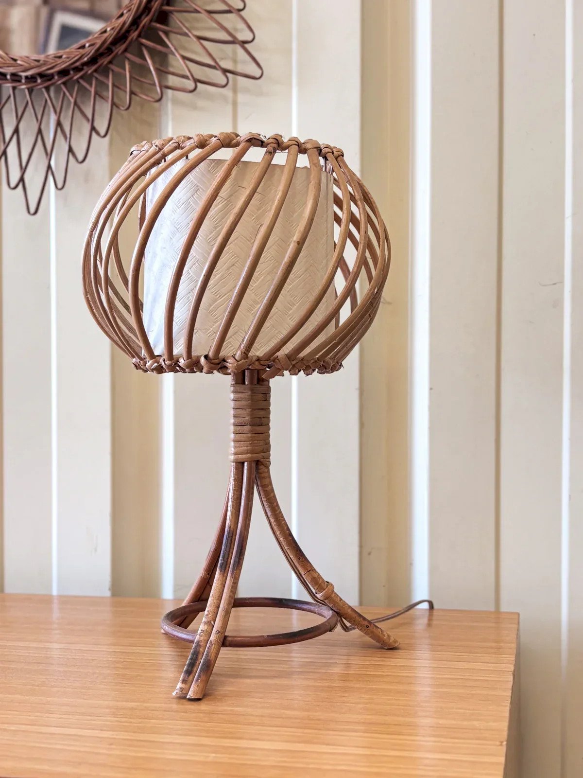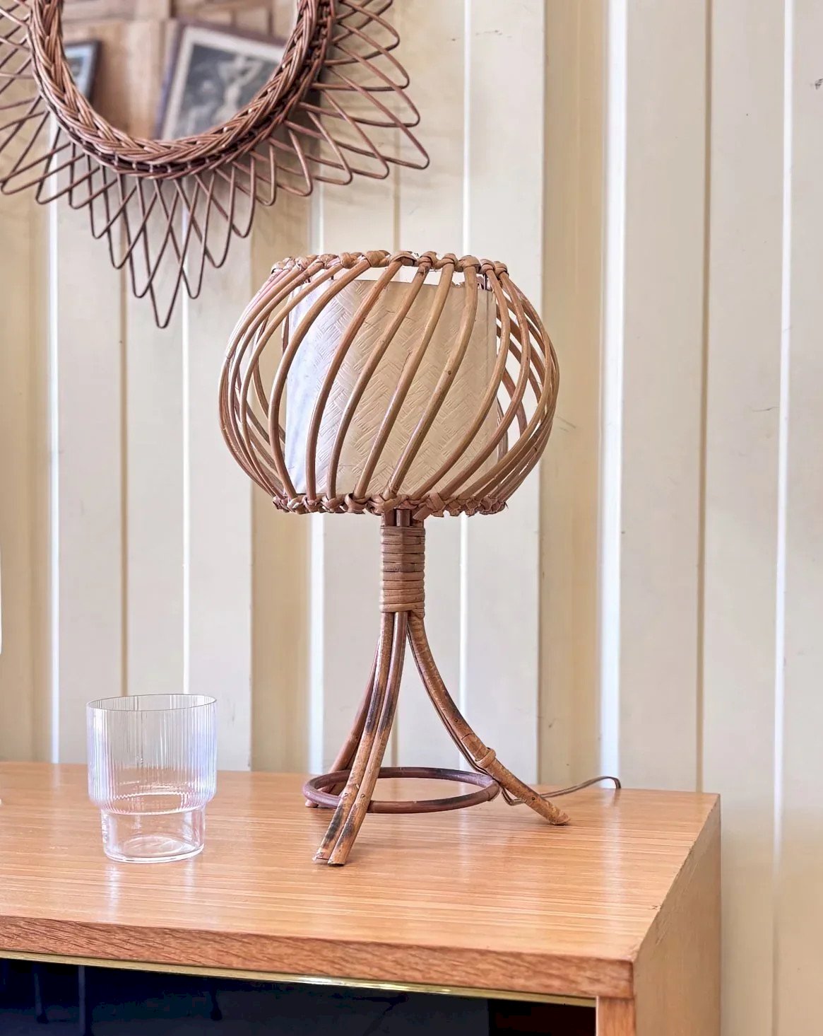 Découvrez la lampe vintage en rotin, inspirée par l'esprit Louis Sognot, qui apportera une touche chaleureuse et nostalgique à votre intérieur. Avec son design élégant et ses lignes douces, cette pièce unique illumine votre espace avec style tout en évoquant le charme du mobilier d'époque. Éveillez votre décoration avec cette pièce artisanale, parfaite pour créer une ambiance cosy et raffinée dans votre maison. Hauteur : 40 cm Diamètre : 24 cm État:Occasion: Objet ayant été utilisé. Objet présentant quelques marques d'usure superficielle, ...Occasion: Objet ayant été utilisé. Objet présentant quelques marques d'usure superficielle, entièrement opérationnel et fonctionnant correctement. Il peut s'agir d'un modèle de démonstration ou d'un objet retourné en magasin après une courte période d'utilisation. les éventuelles imperfections. Marque:Debongout Type:Produit chiné Style:Contemporain Matériau:Rotin Vintage:Oui