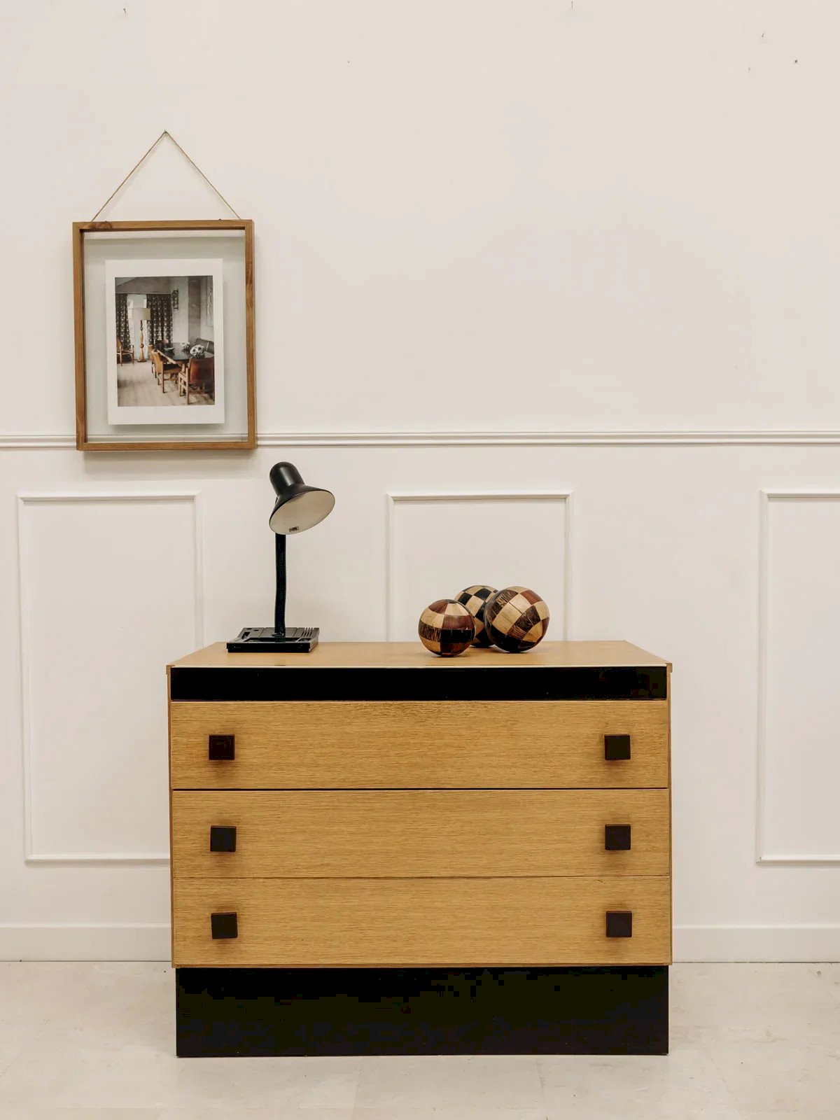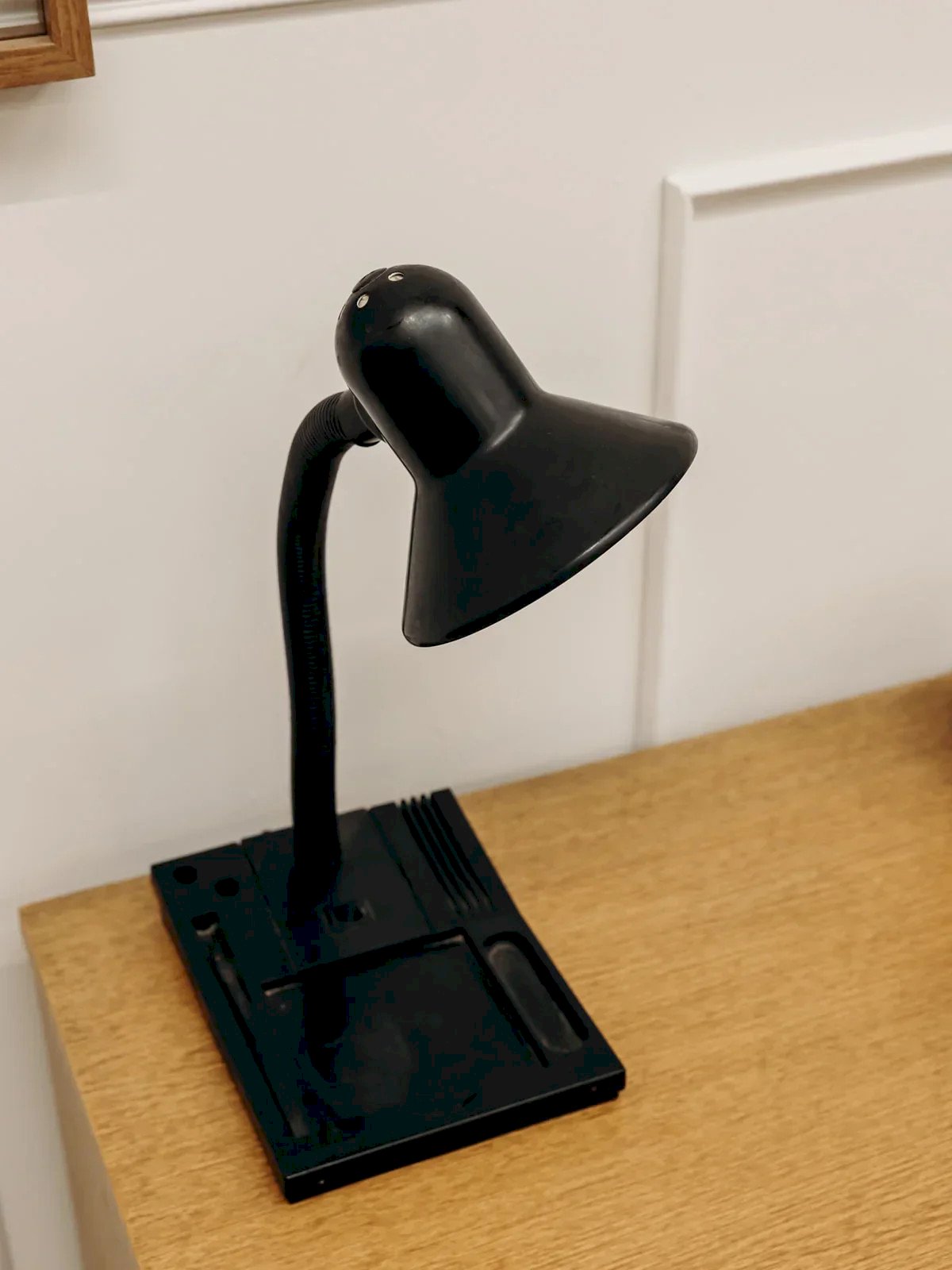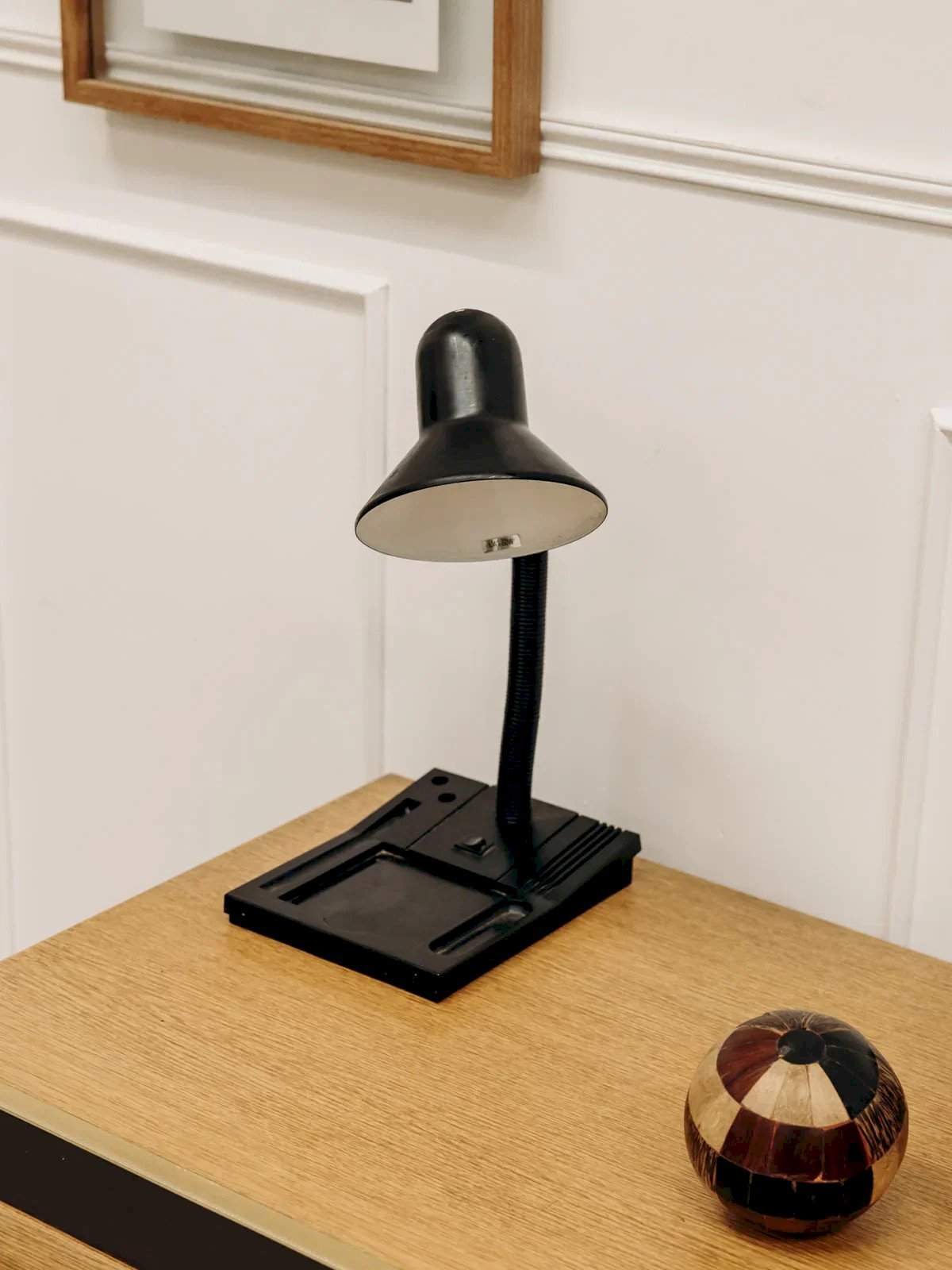 Apportez une touche d'élégance rétro à votre intérieur avec notre lampe noire vintage. Dotée d'un socle en plastique compartimenté, elle allie esthétique et fonctionnalité. Parfaite pour illuminer vos espaces tout en ajoutant un charme intemporel, cette lampe se marie aisément avec différents styles de décoration. Son design soigné et son allure classique en font un véritable atout pour votre maison. Longueur : 21 cm Hauteur : 39 cm État:Occasion: Objet ayant été utilisé. Objet présentant quelques marques d'usure superficielle, ...Occasion: Objet ayant été utilisé. Objet présentant quelques marques d'usure superficielle, entièrement opérationnel et fonctionnant correctement. Il peut s'agir d'un modèle de démonstration ou d'un objet retourné en magasin après une courte période d'utilisation. les éventuelles imperfections. Marque:Debongout Type:Produit chiné Style:Contemporain Matériau:Plastique, Métal Vintage:Oui