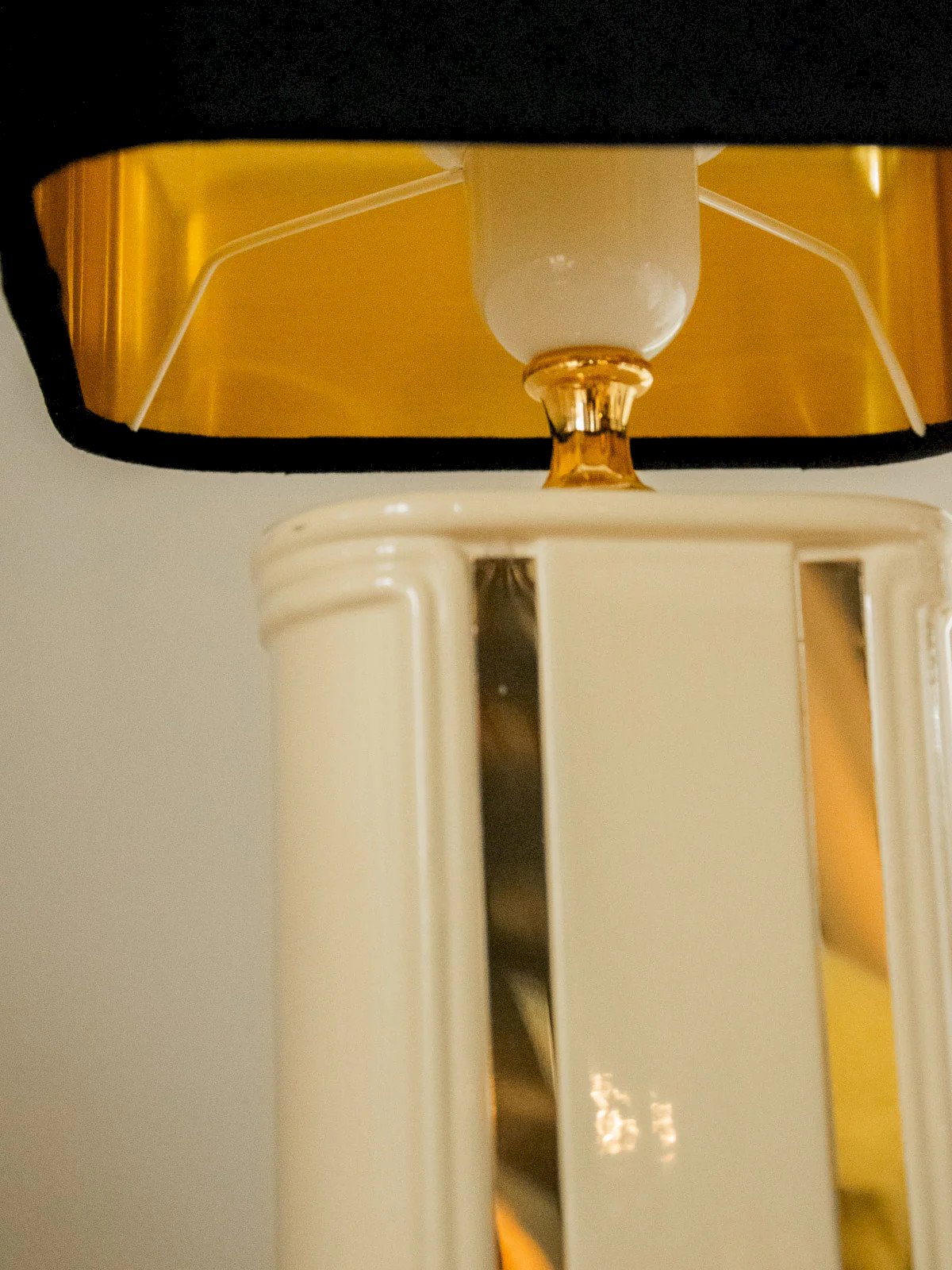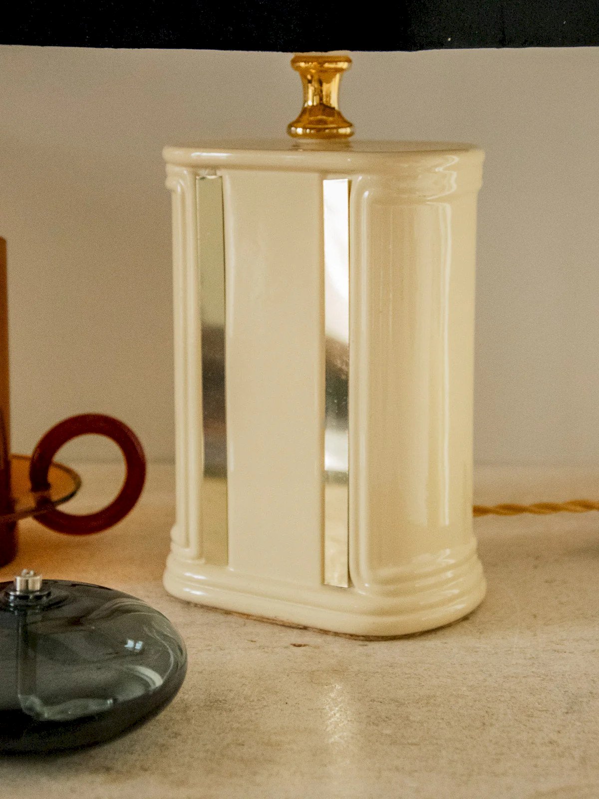 Découvrez cette lampe en céramique à pieds rectangulaires, émaillée d'un beige doux rehaussé d'un détail miroir qui capte la lumière. Son abat-jour carré effet velours noir offre une diffusion chaude et feutrée, idéale pour une chambre ou un coin lecture. Sa silhouette compacte et stable s'adapte à une table de chevet ou un bureau, tandis que l'électricité a été refaite à neuf pour un usage sûr. Compatible avec une ampoule à gros culot, elle combine style contemporain et touche rétro élégante. Longueur : 20,5 cm Largeur : 20,5 cm Hauteur : 37,5 cm État:Occasion: Objet ayant été utilisé. Objet présentant quelques marques d'usure superficielle, ...Occasion: Objet ayant été utilisé. Objet présentant quelques marques d'usure superficielle, entièrement opérationnel et fonctionnant correctement. Il peut s'agir d'un modèle de démonstration ou d'un objet retourné en magasin après une courte période d'utilisation. les éventuelles imperfections. Marque:Debongout Type:Produit chiné Style:Contemporain Matériau:Céramique, Tissu Vintage:Oui