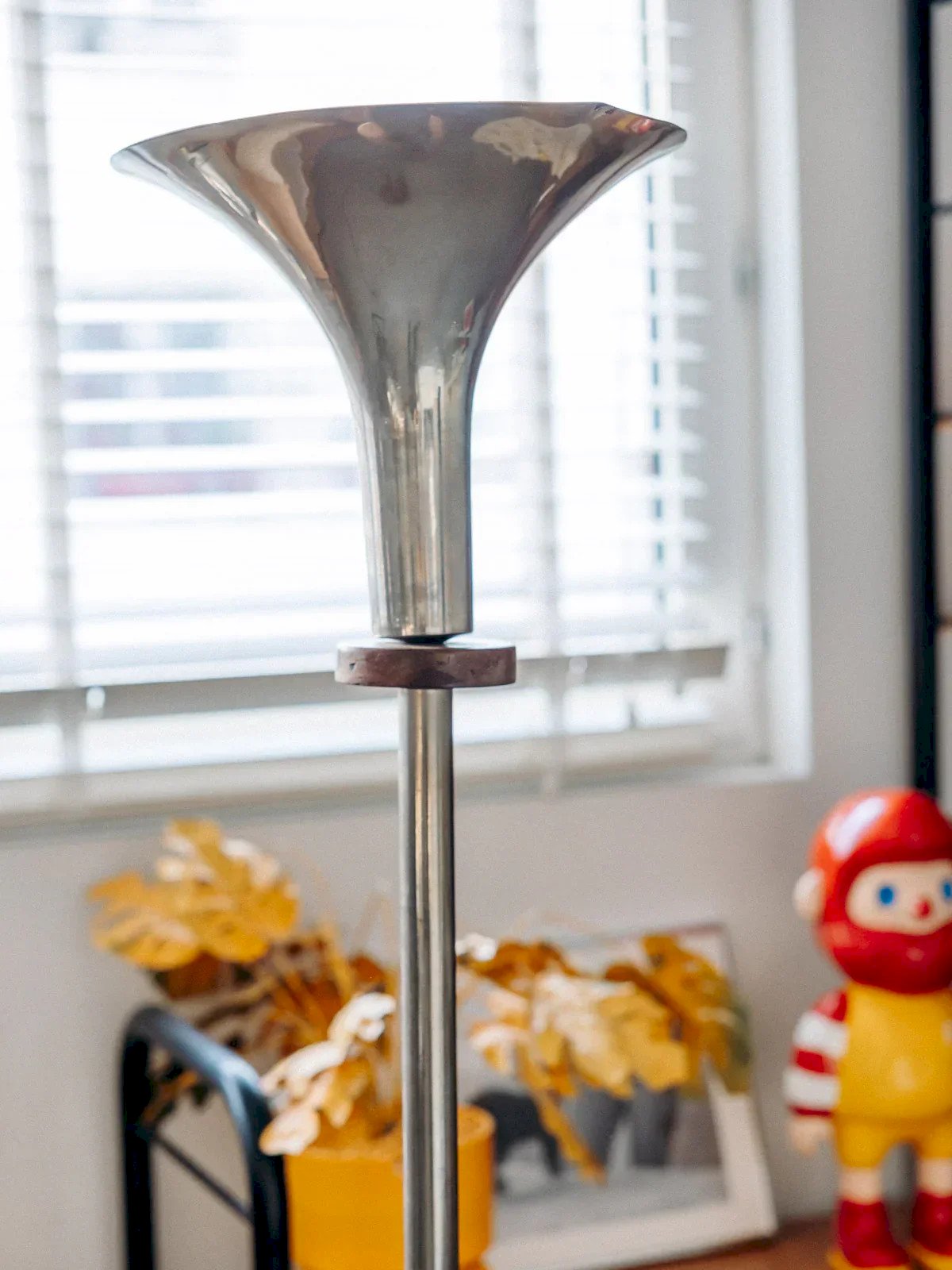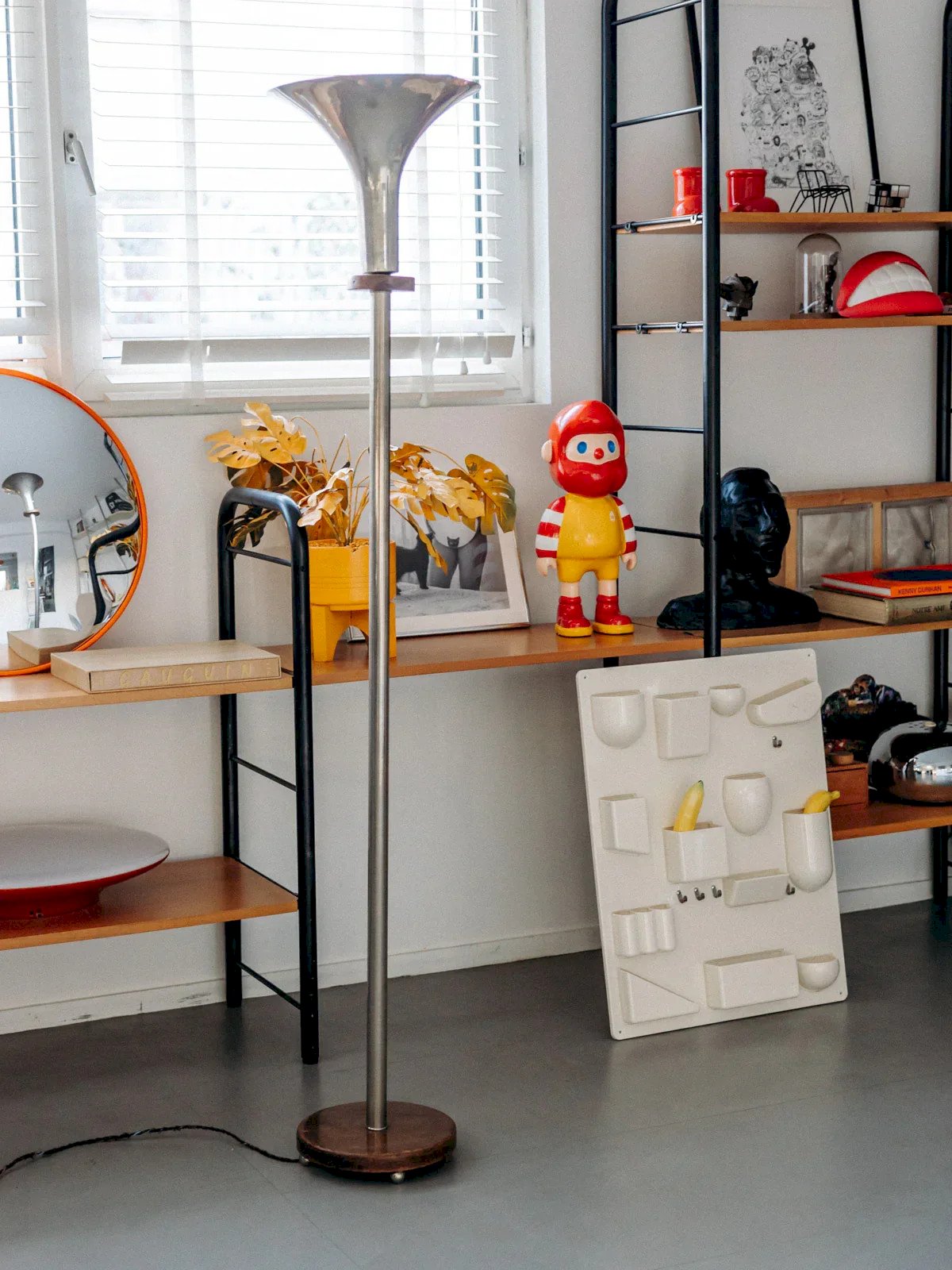 Sublimez votre intérieur avec ce lampadaire des années 50 en inox et bois, empreint d'une élégante esthétique Art déco. Son piétement rond en bois lui confère une assise chaleureuse et des proportions équilibrées, tandis que la structure en inox valorise des lignes graphiques et raffinées. Idéal pour éclairer un coin lecture ou ponctuer un salon, il diffuse une lumière douce et crée une ambiance feutrée et accueillante. Légère déformation sur l'abat-jour. Hauteur : 166 cm Diamètre de l'abat-jour : 33 cm État:Occasion: Objet ayant été utilisé. Objet présentant quelques marques d'usure superficielle, ...Occasion: Objet ayant été utilisé. Objet présentant quelques marques d'usure superficielle, entièrement opérationnel et fonctionnant correctement. Il peut s'agir d'un modèle de démonstration ou d'un objet retourné en magasin après une courte période d'utilisation. les éventuelles imperfections. Marque:Debongout Type:Produit chiné Vintage:Oui Style:Contemporain
